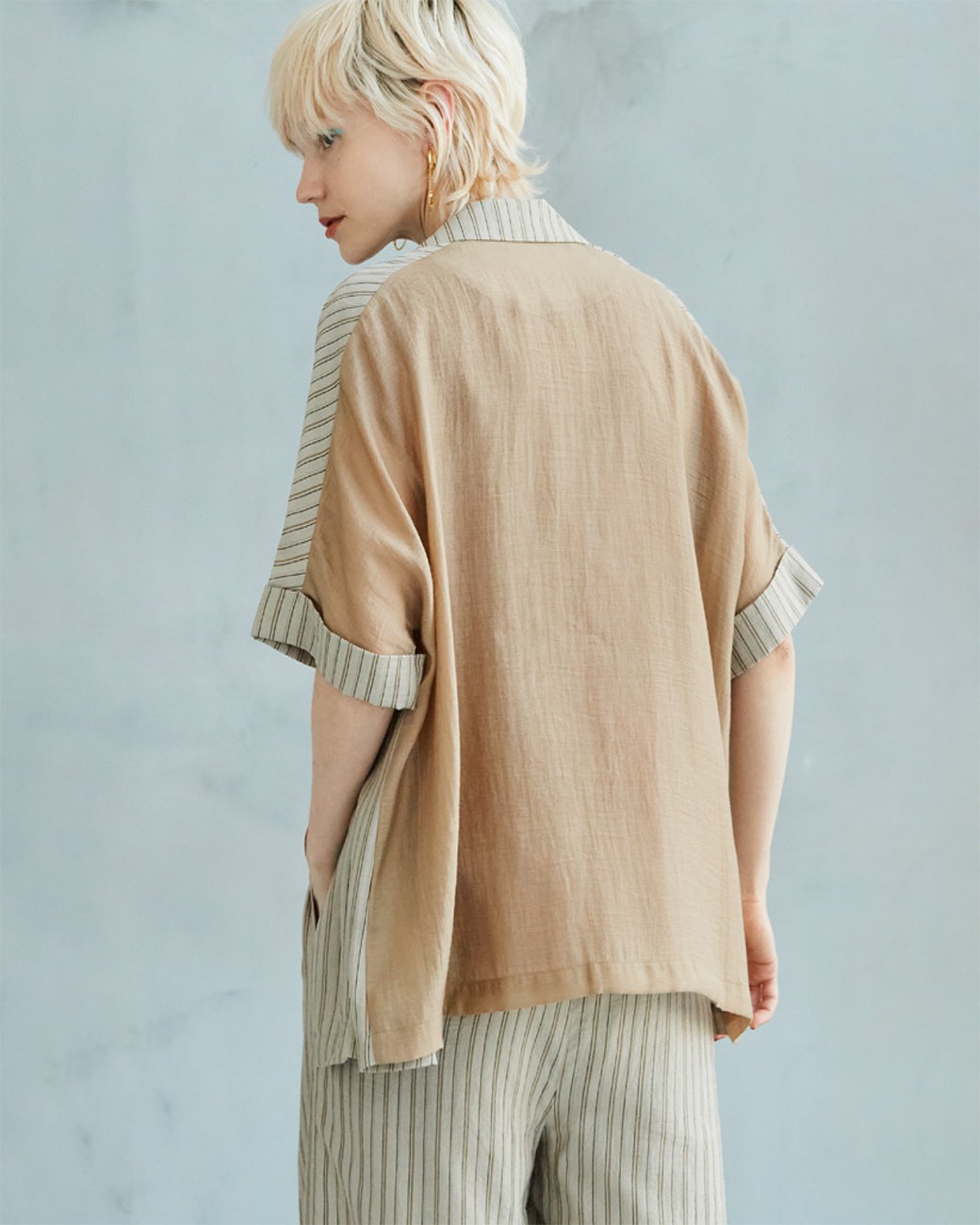 このモデルさんが着ているストライプは、背中が無地との切返しなんですー!