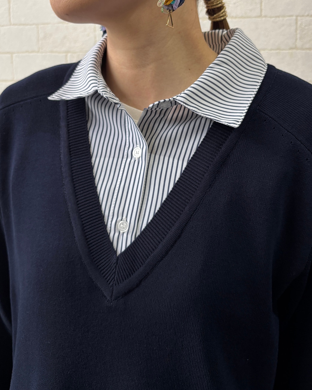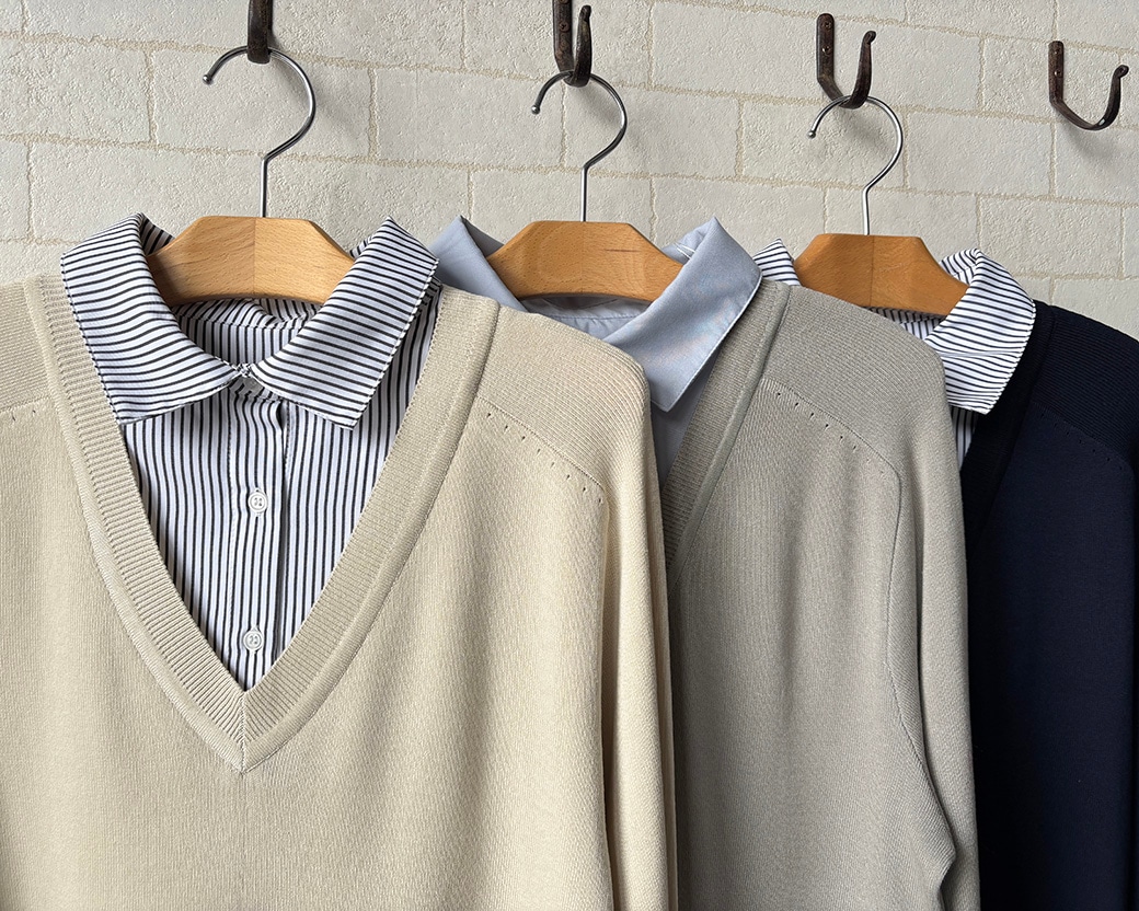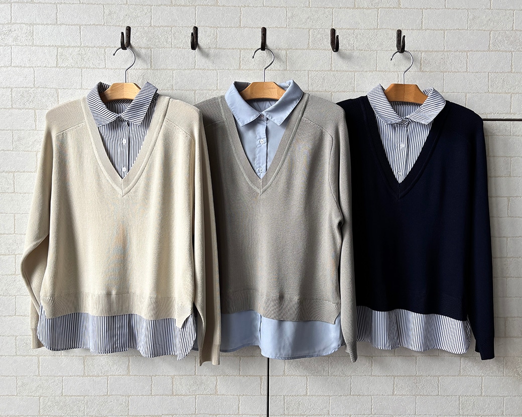 深いVネックのレーヨンニットとブラウスを重ね着したかのようなデザインなんです😉