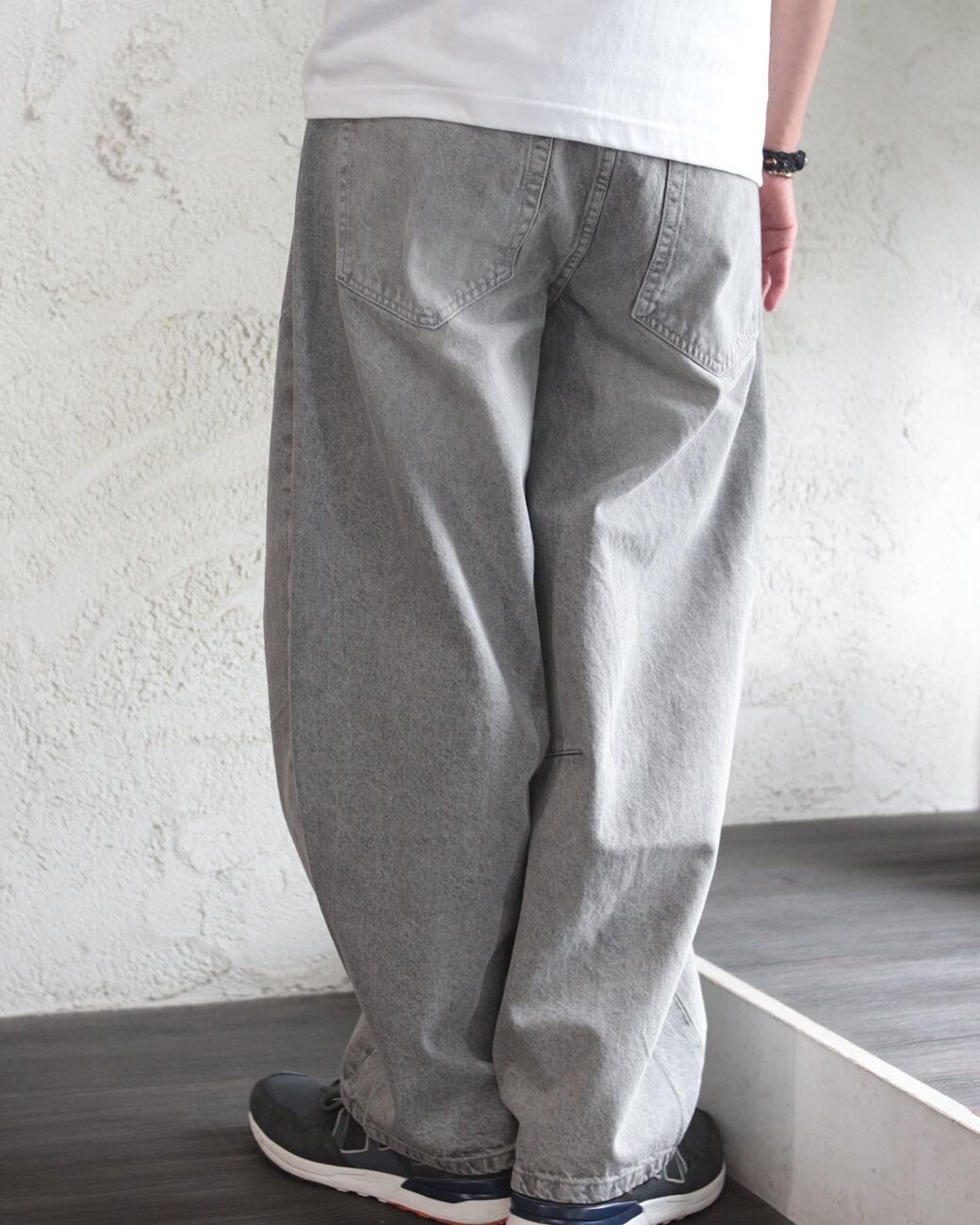 ウエストから裾にかけて弧を描くような緩やかなカーブシルエットが立体的な表情を生み出すバレルレッグデニム。ウエストのバックゴムや調整用の紐など穿きやすさにもこだわった1本です。