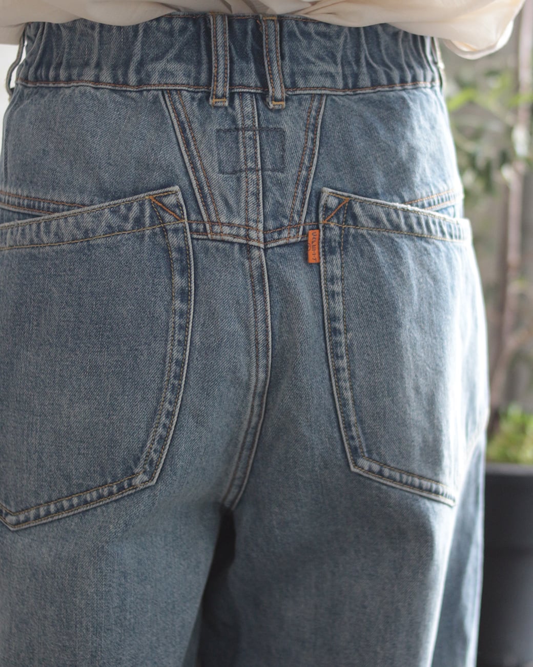 あえて古着のような色合いに仕上げた綿100%デニム素材は、はき込んで揉み込まれたような硬すぎない風合いにもこだわりました。