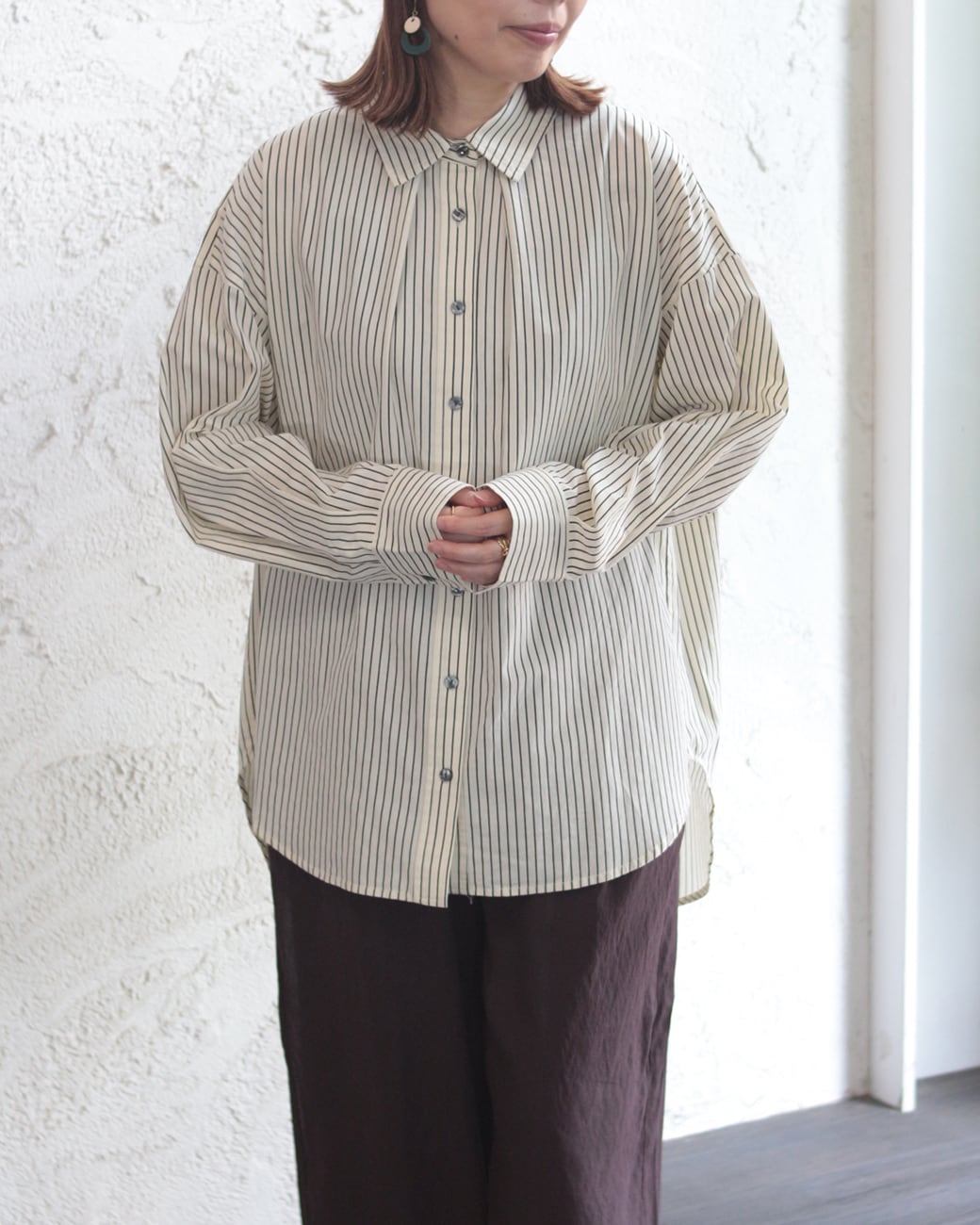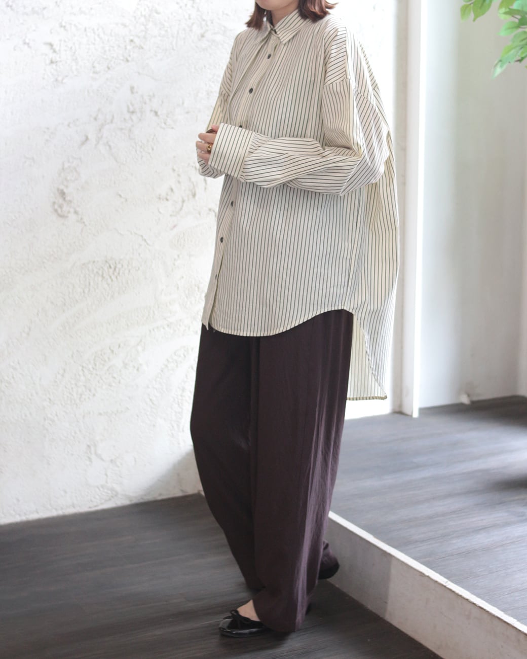 ストライプシャツ チュニックシャツ 後ろタック 体型カバー 羽織りシャツ ブロード素材 製品洗い 大人カジュアル 春秋コーデ きれいめカジュアル