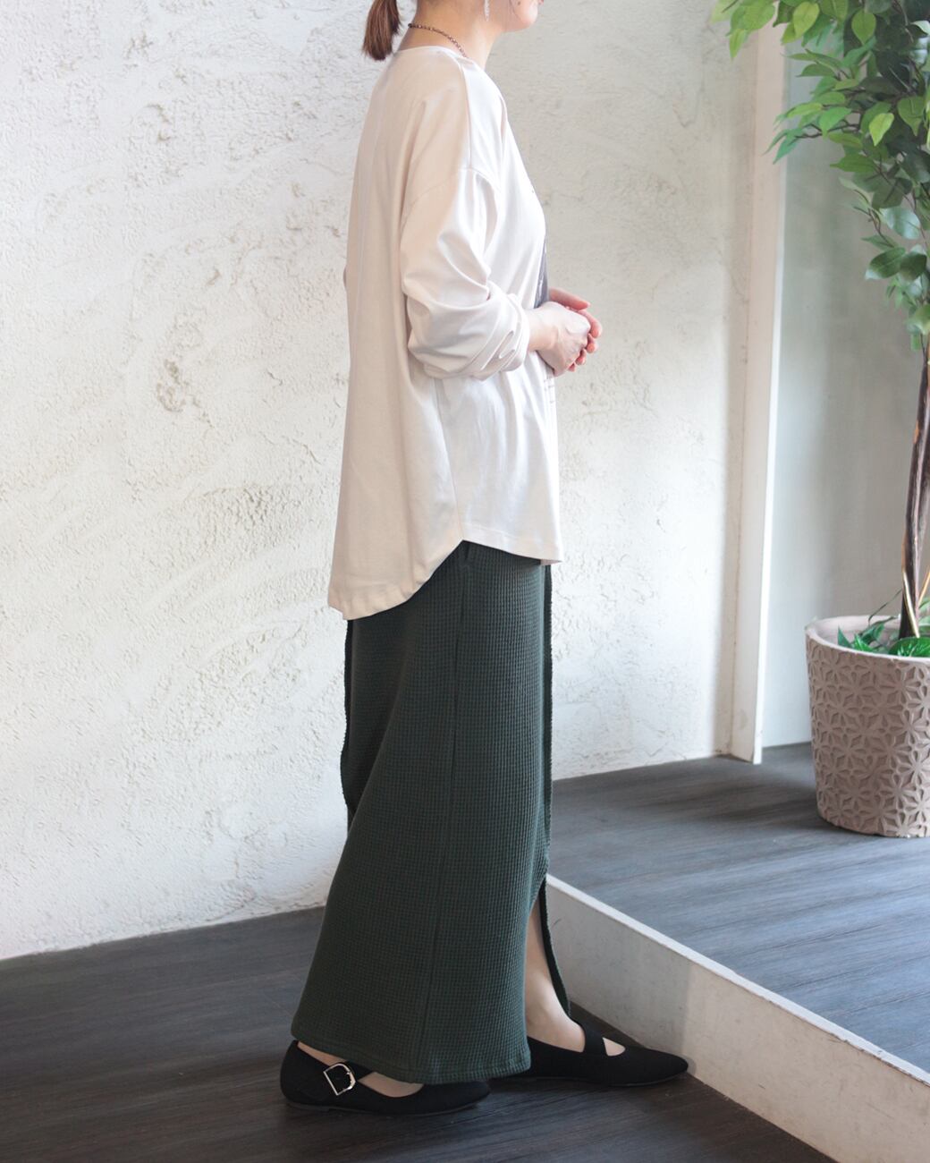 同素材のワッフルトップスとセットアップで統一感のある着こなしもおすすめ。