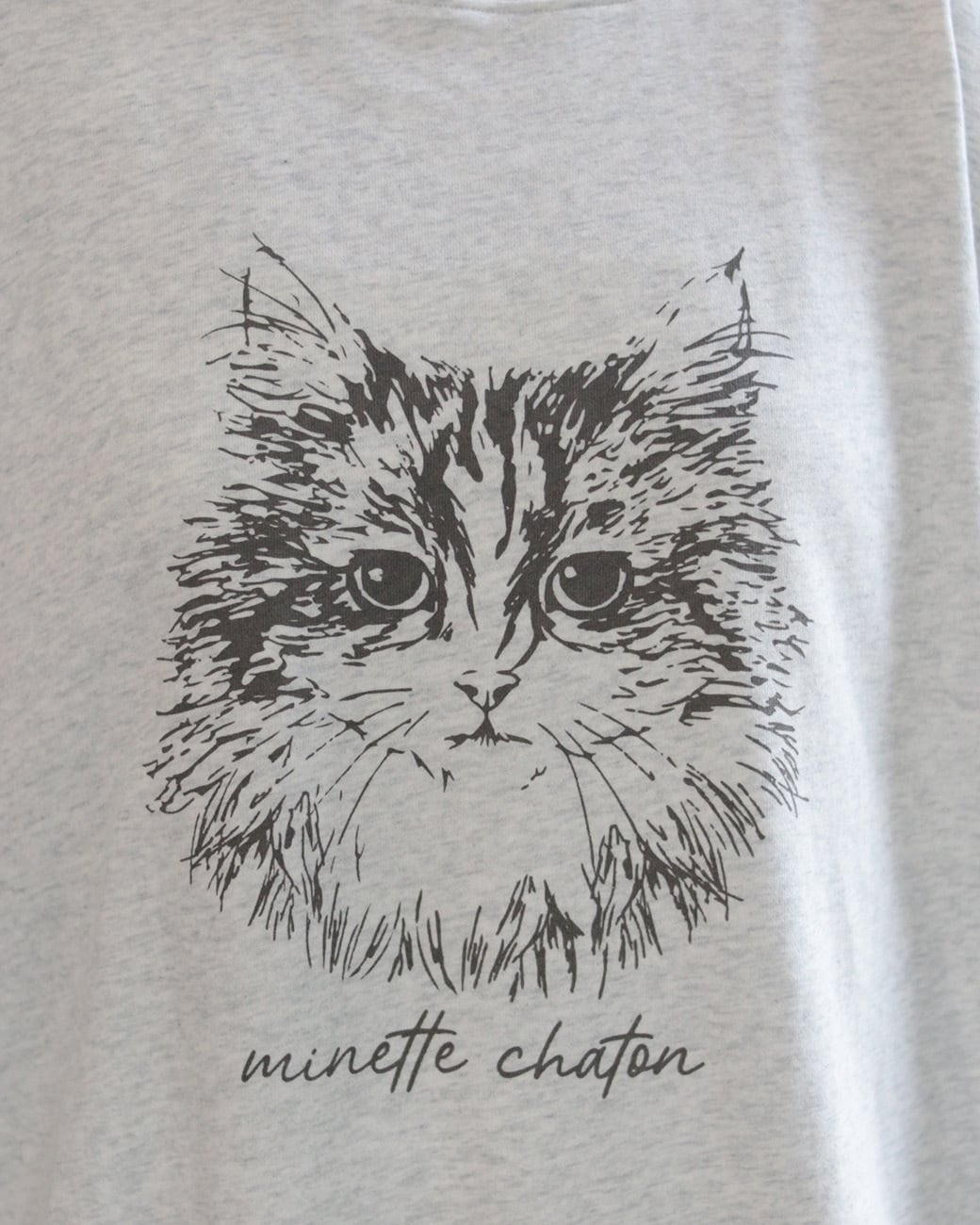 胸元に描かれた繊細なタッチの猫のイラストが、シンプルなデザインに