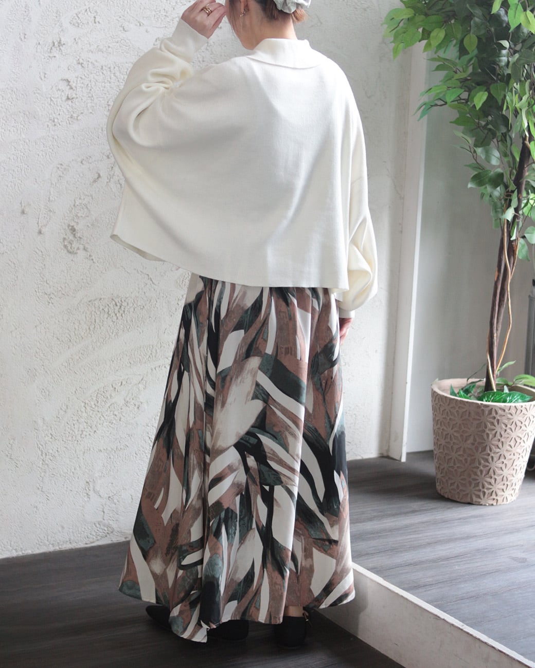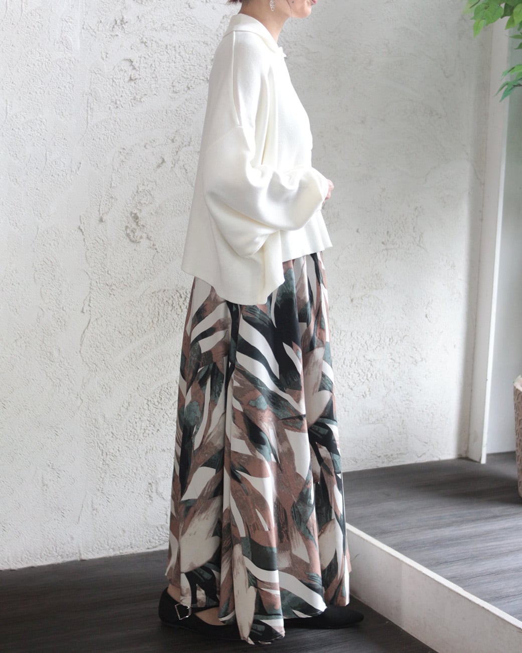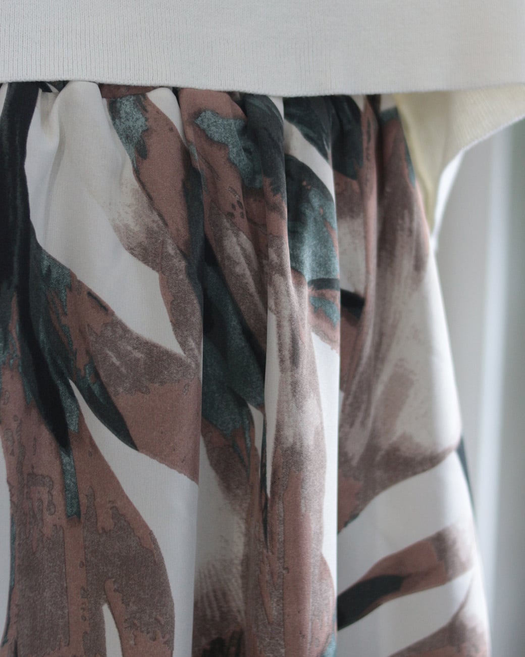 抽象画のようなプリントが、シンプルなトップスと合わせるだけで