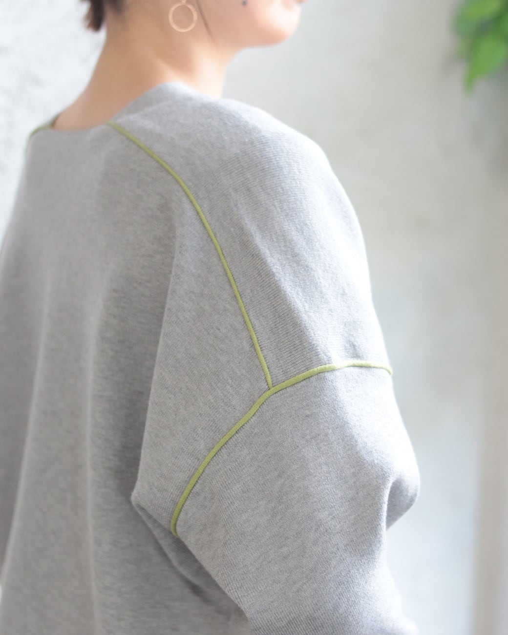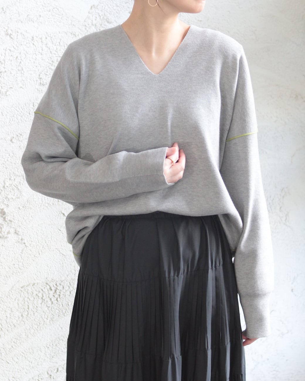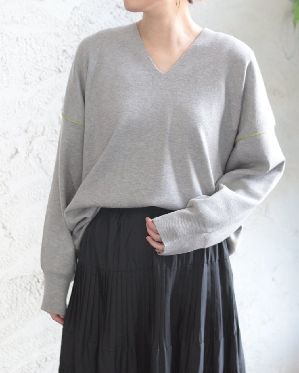 接ぎ部分にラインを施しました。すっきり見えるVネックや、ヒップを隠してくれる