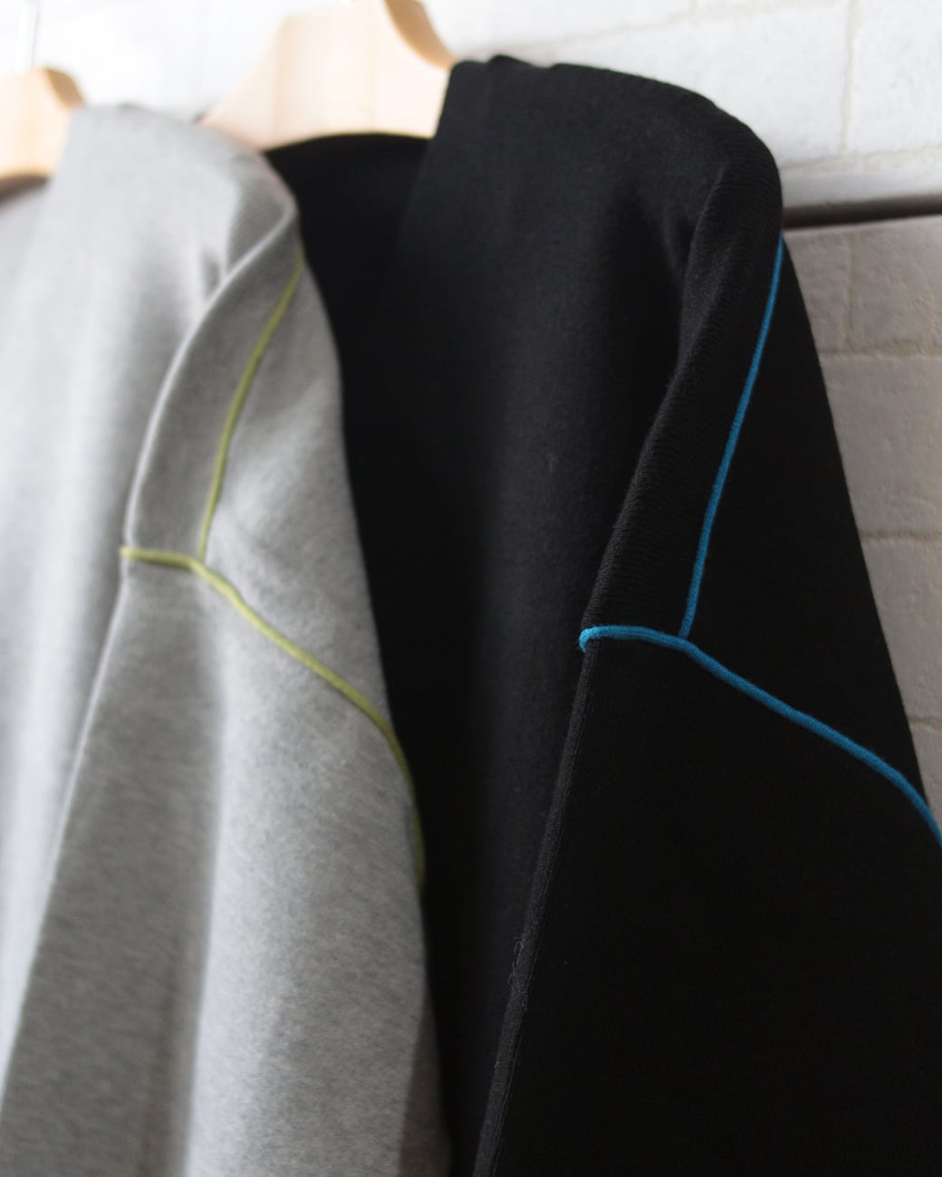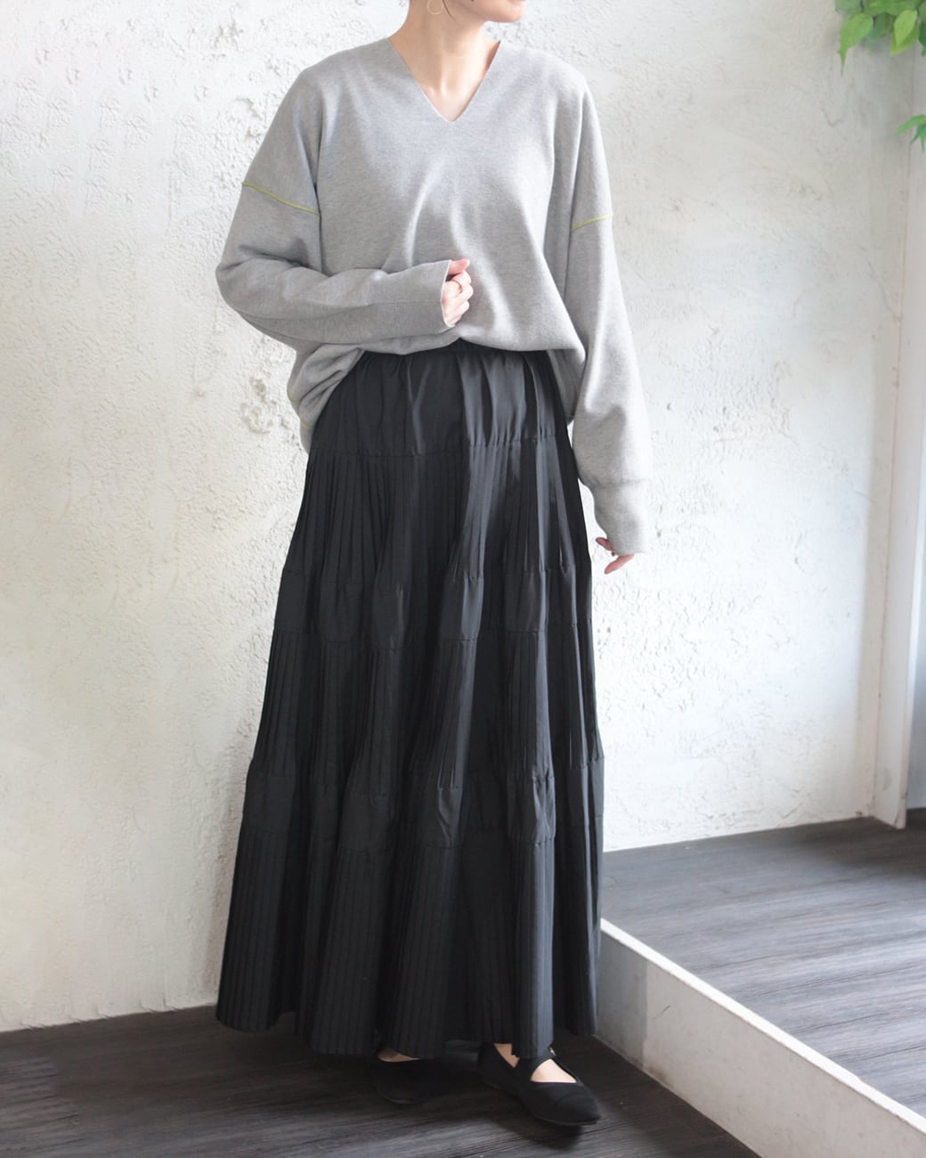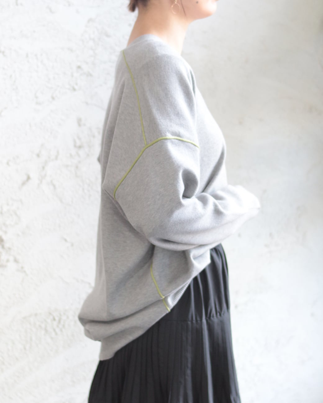 接ぎ部分にラインを施しました。すっきり見えるVネックや、ヒップを隠してくれる