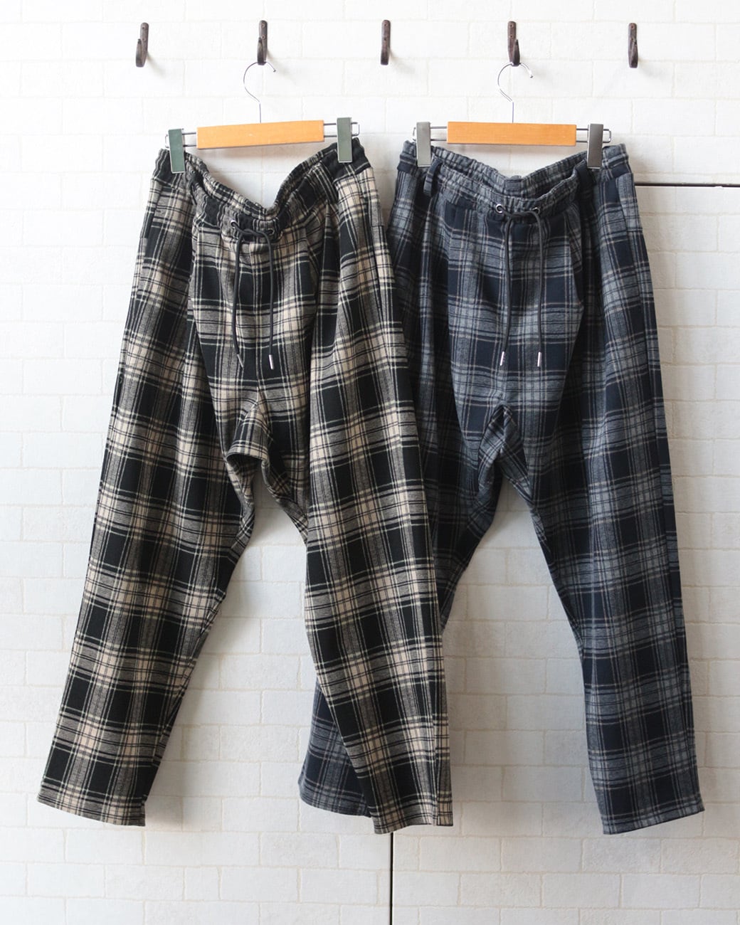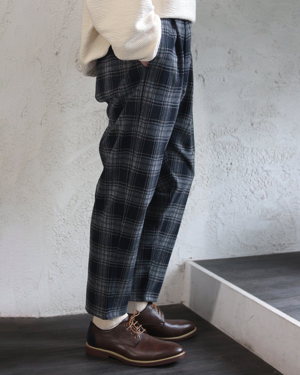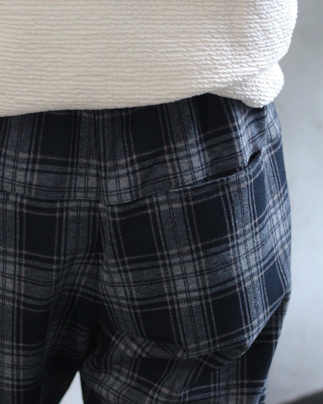 チェック柄スパンポンチカットソー素材のテーパードパンツ。