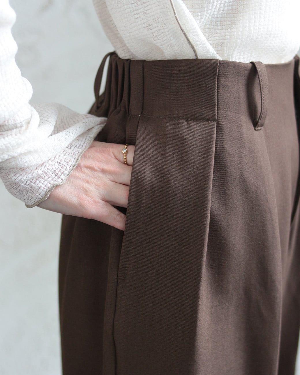 ウエスト内側に別布ヘリンボーンを使い、パイピング始末でさらに高見えします。