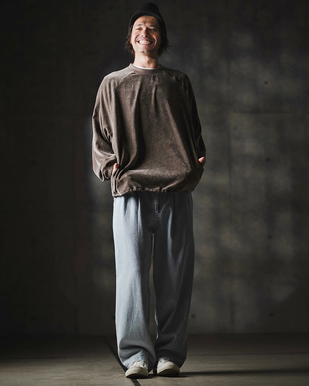 ワイドな身幅、ドロップショルダー、ゆとりのある袖周りに設定したオーバーサイジング。