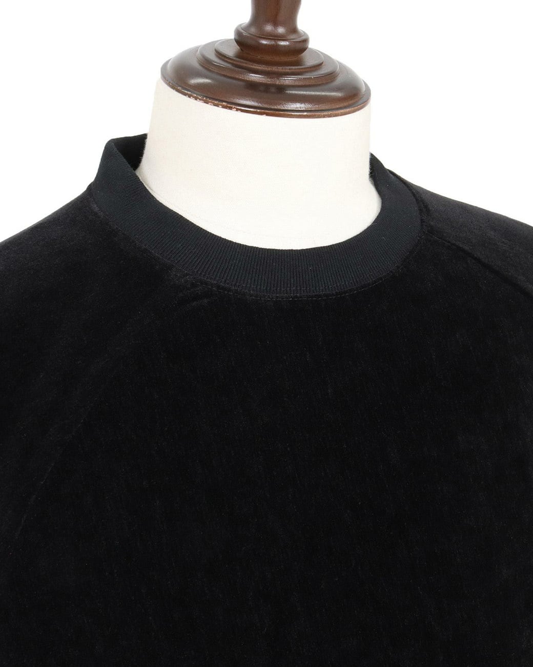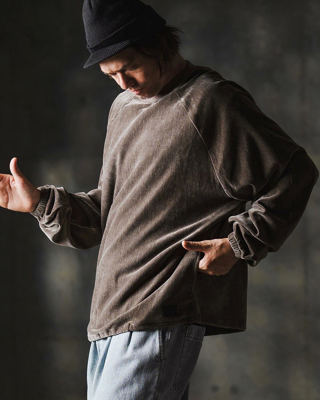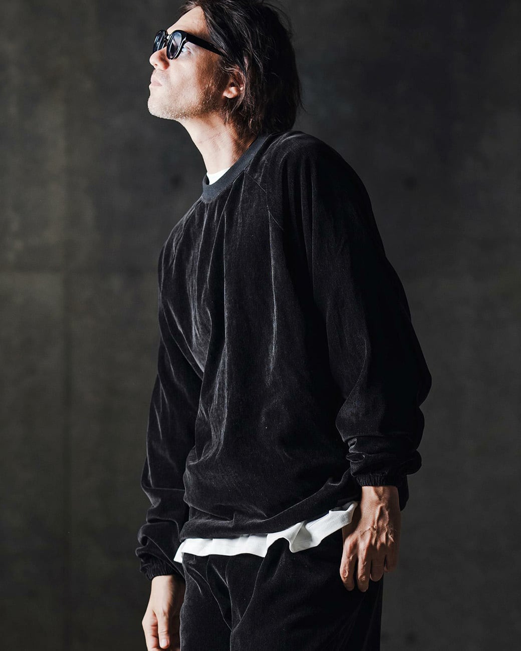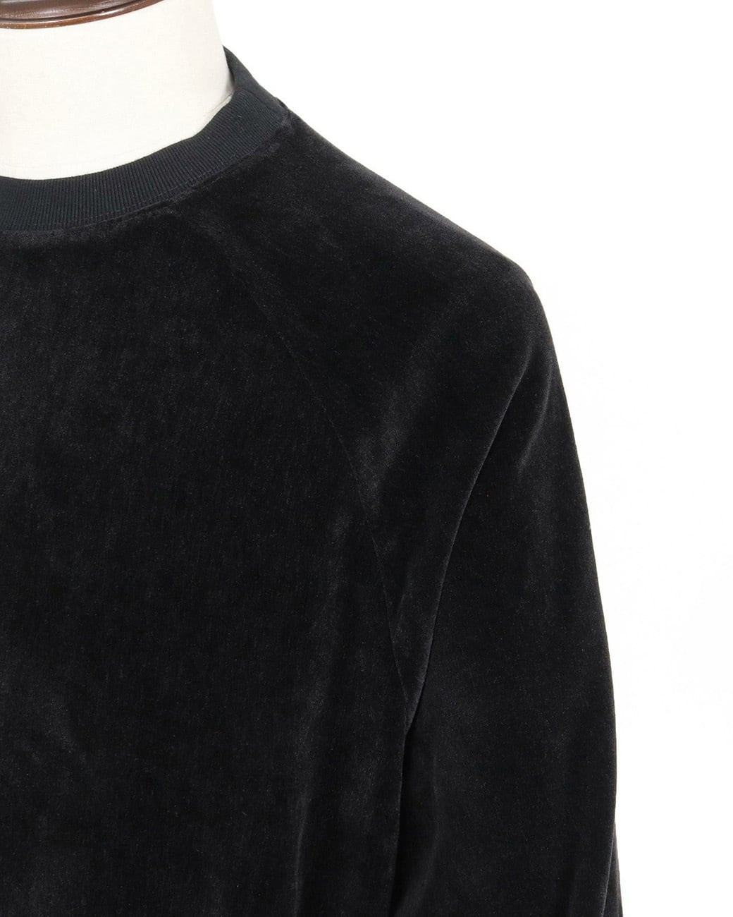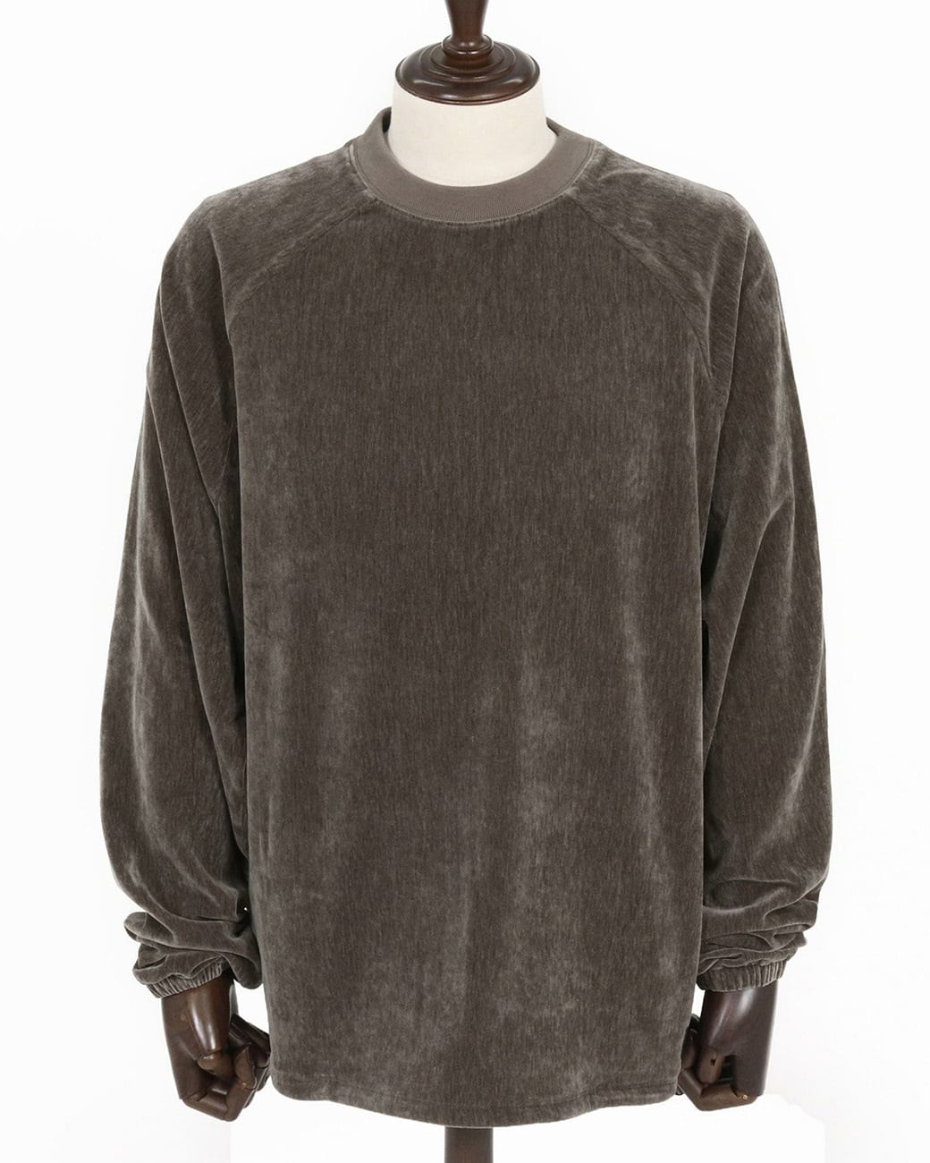 上品さとカジュアルさを兼ね備えた、ベロア素材のロングスリーブプルオーバー。