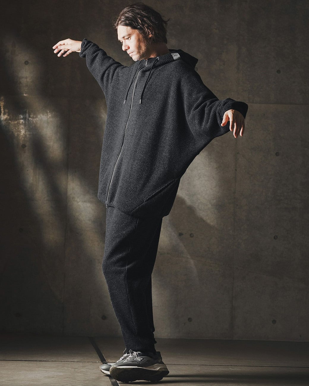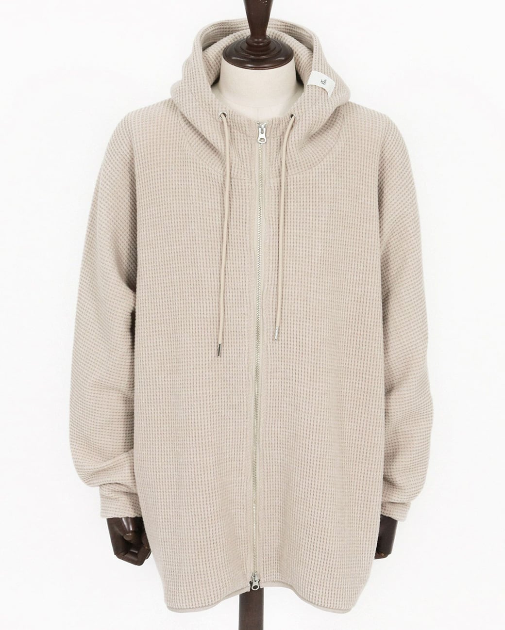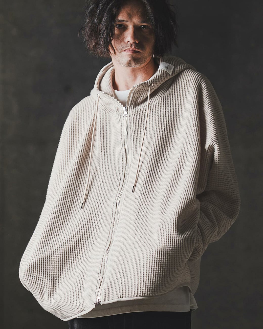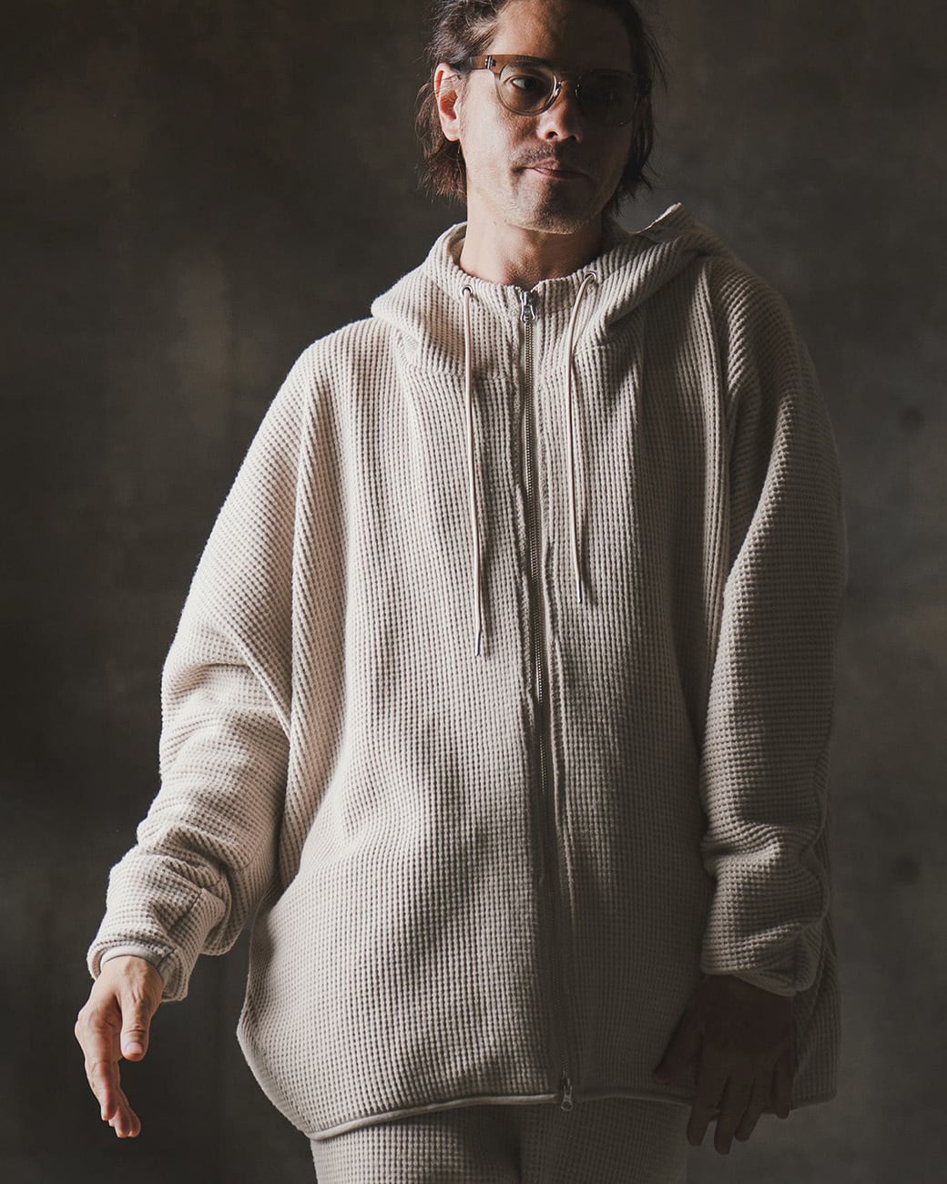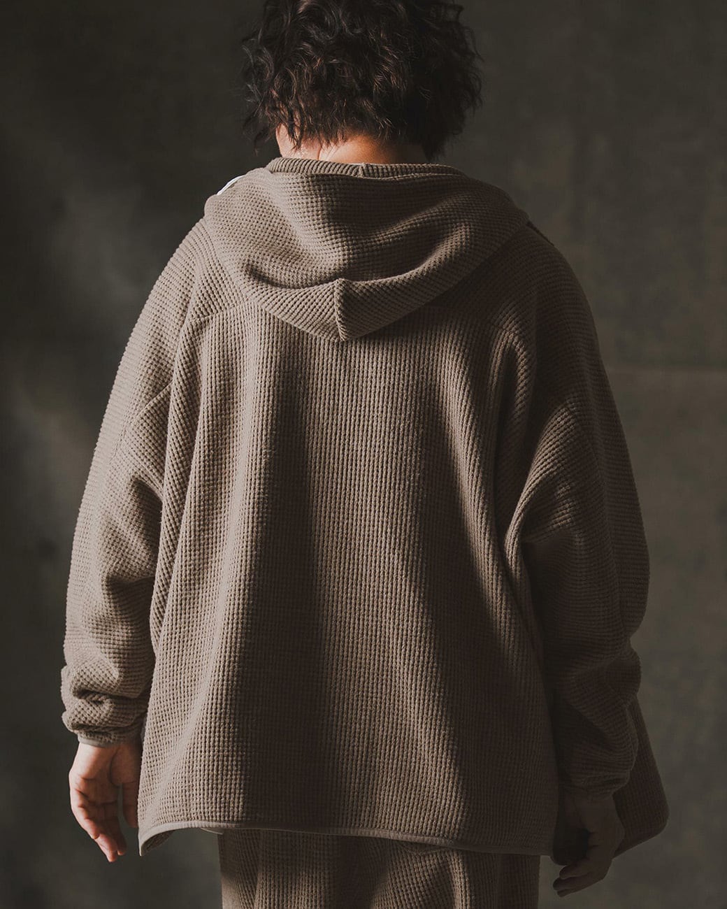 ワッフルカットソーのオーバーサイズジップアップフーディー。