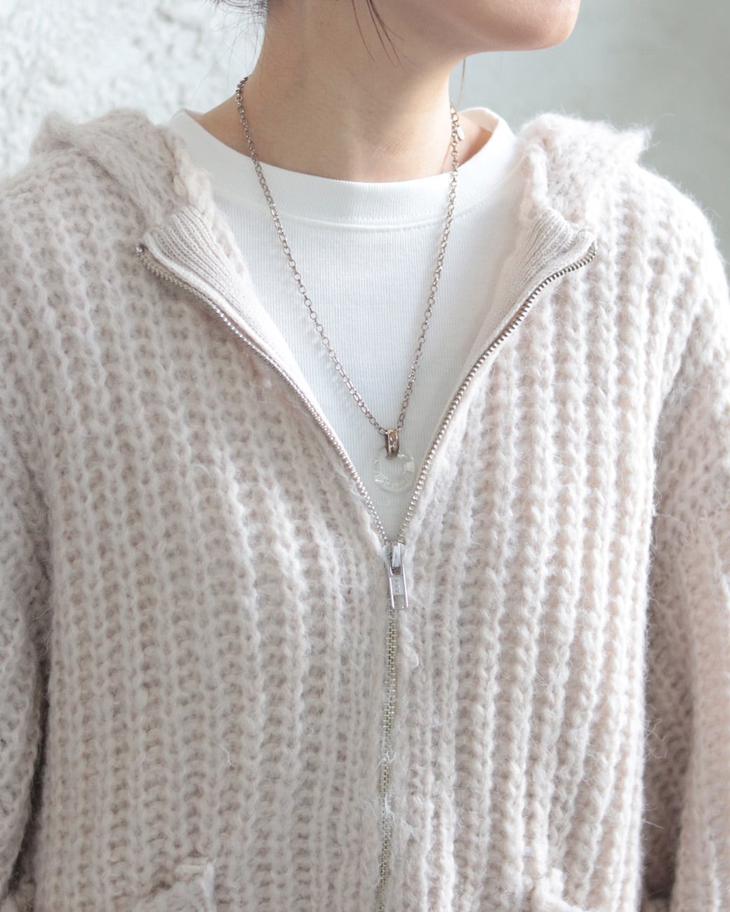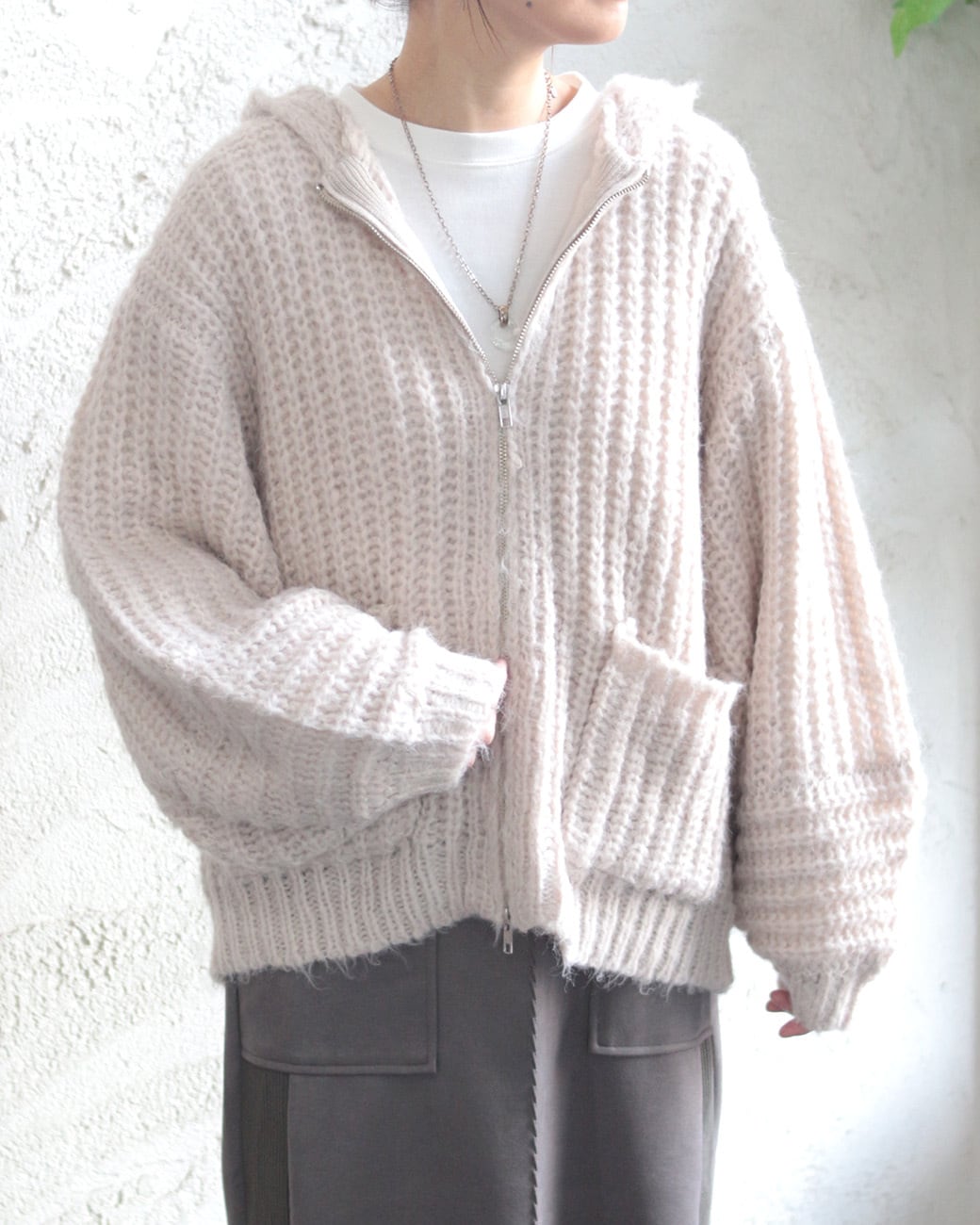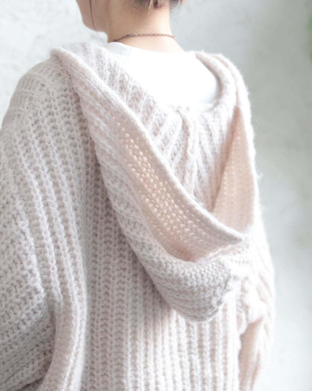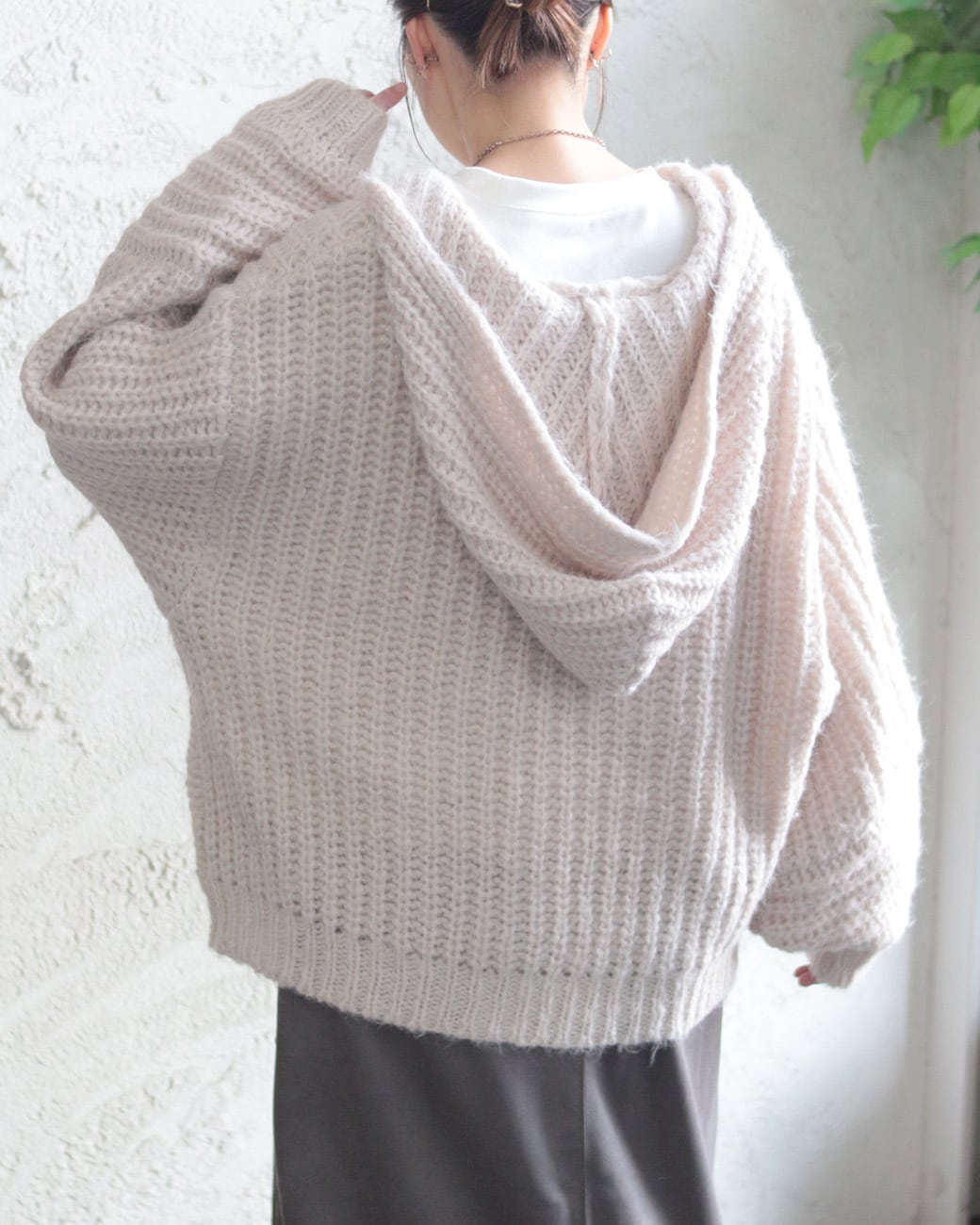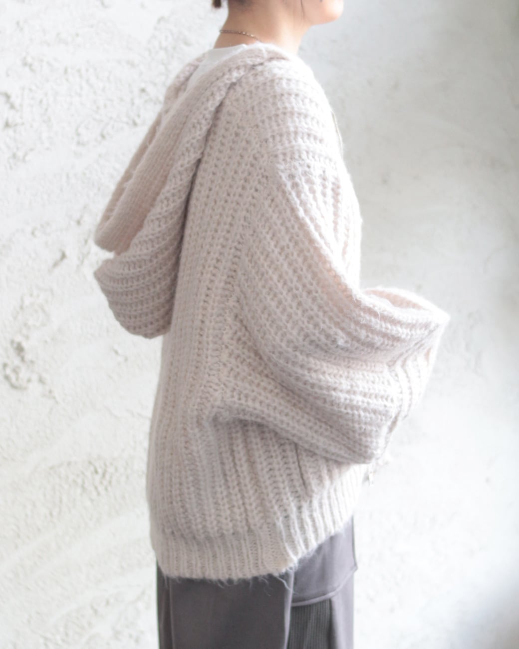 【畔編みニット ざっくり編み フードジップ ニットパーカー】