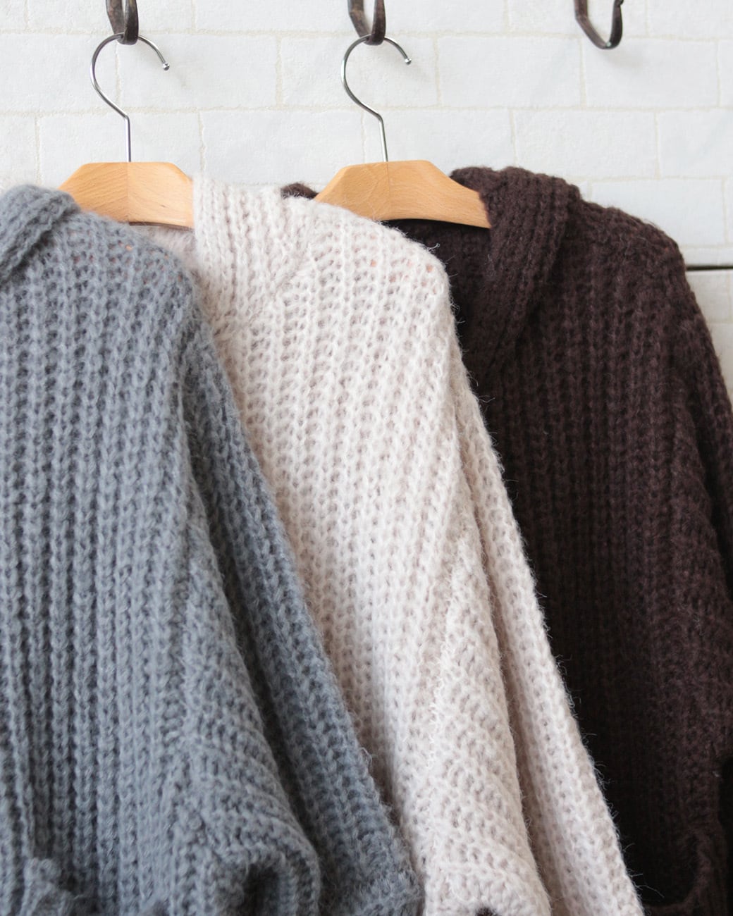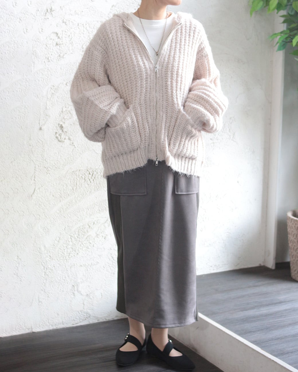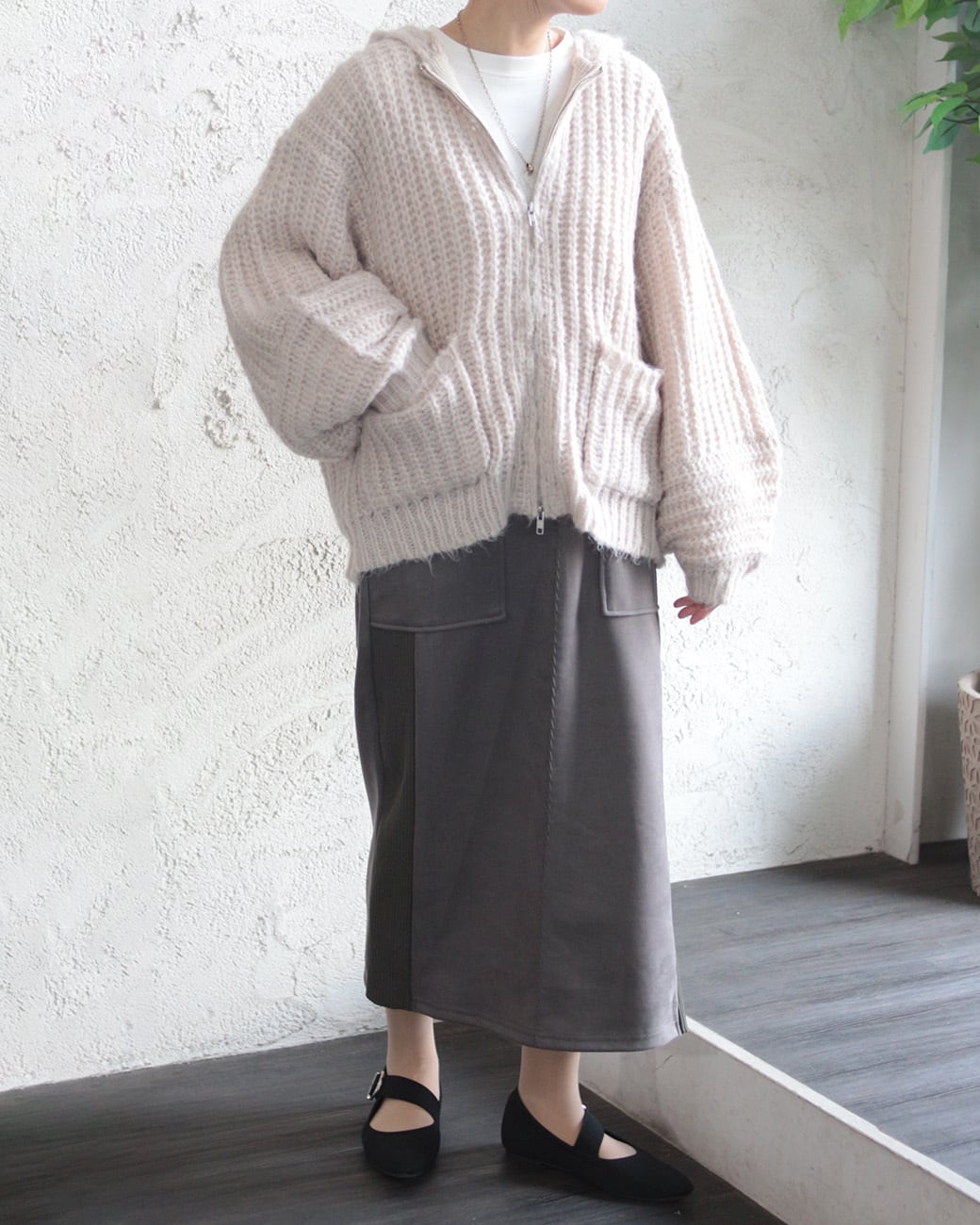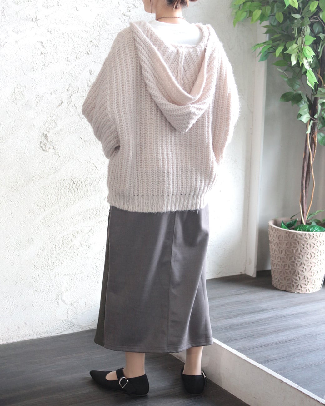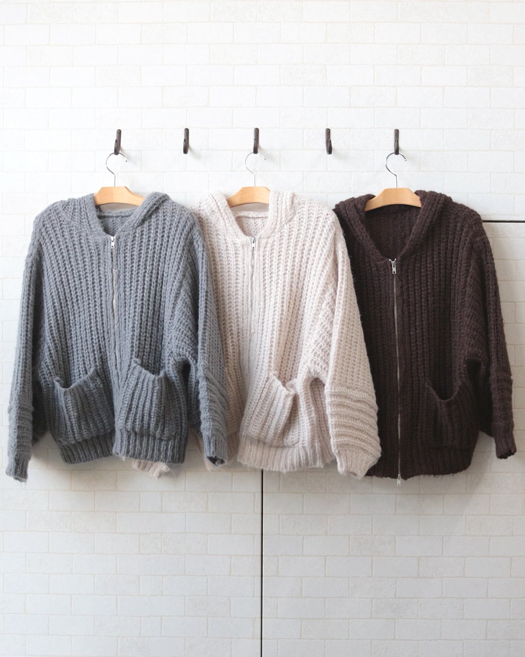 【畔編みニット ざっくり編み フードジップ ニットパーカー】