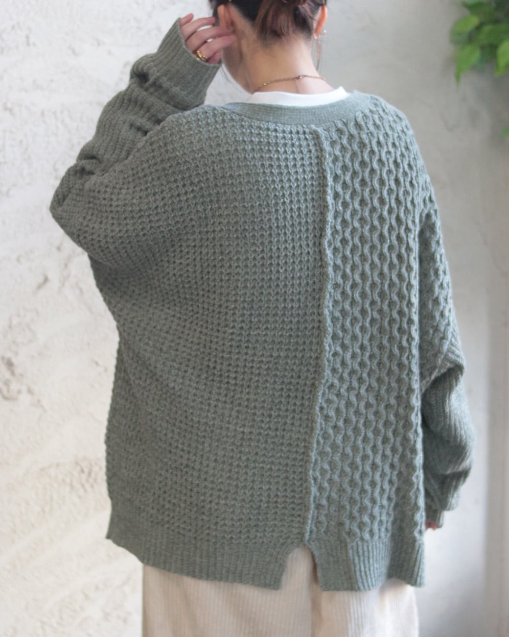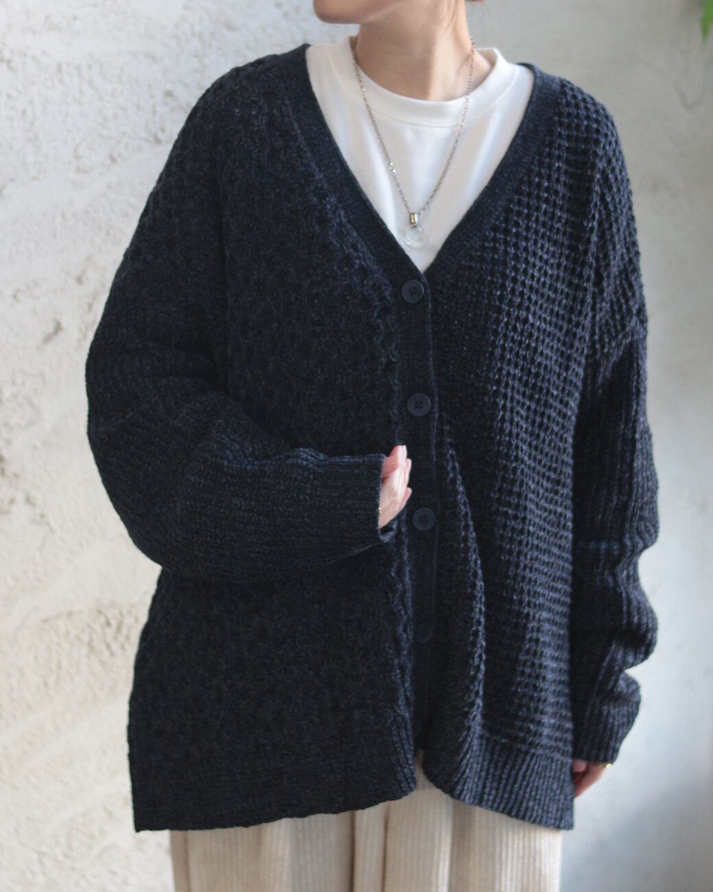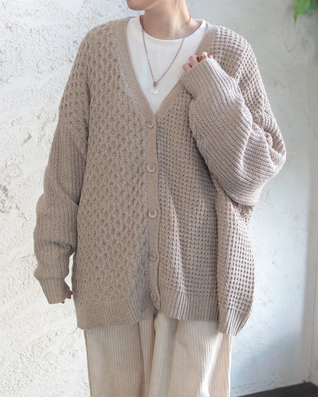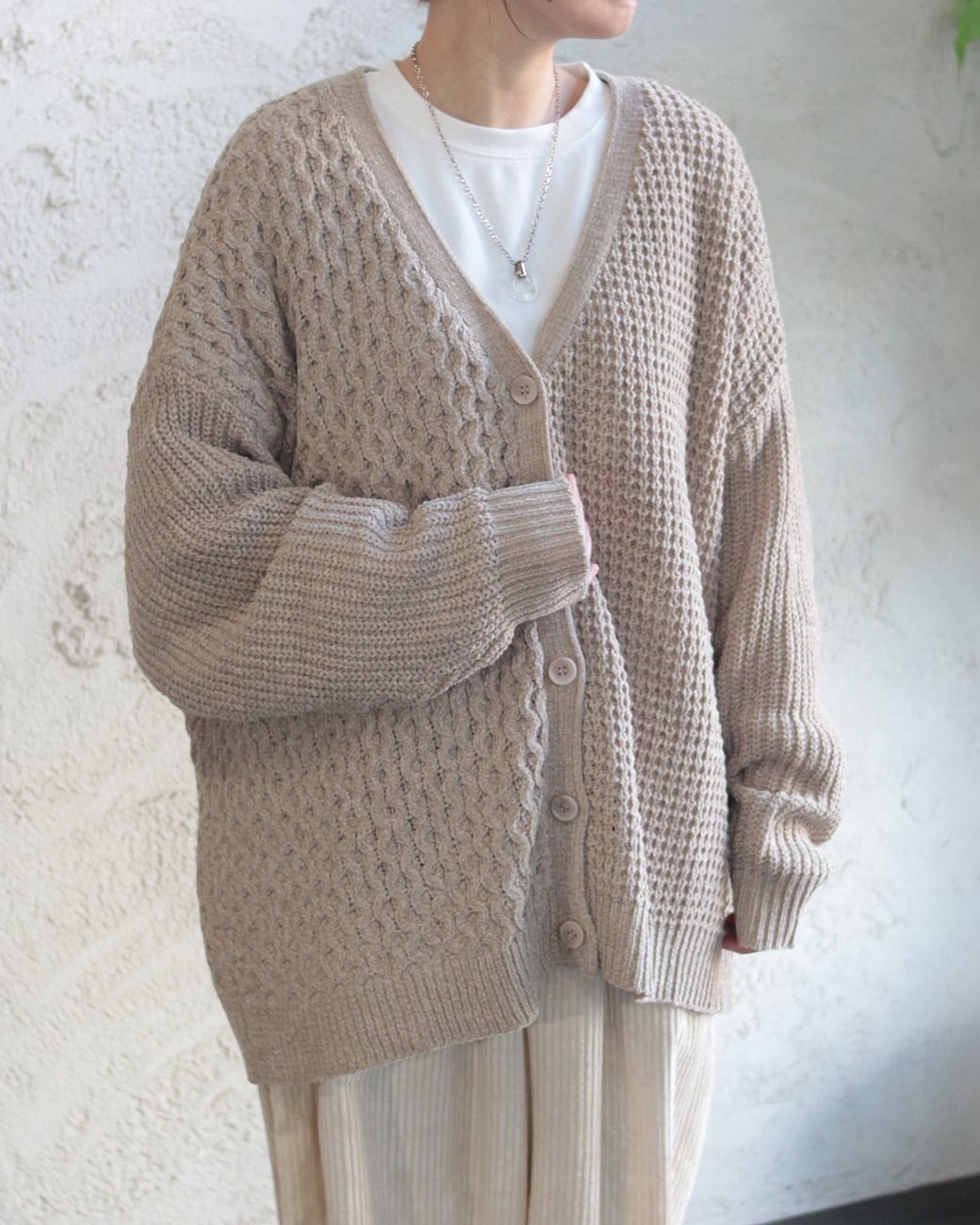 モールニット ブークレ ケーブル編み カーディガン 柄切替 ドロップショルダー ふんわりニット 軽量ニット 秋 冬
