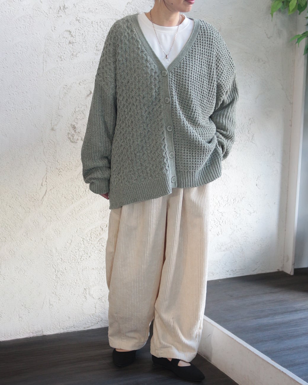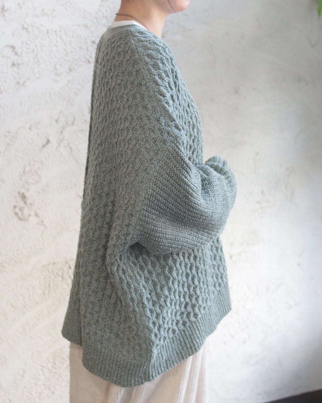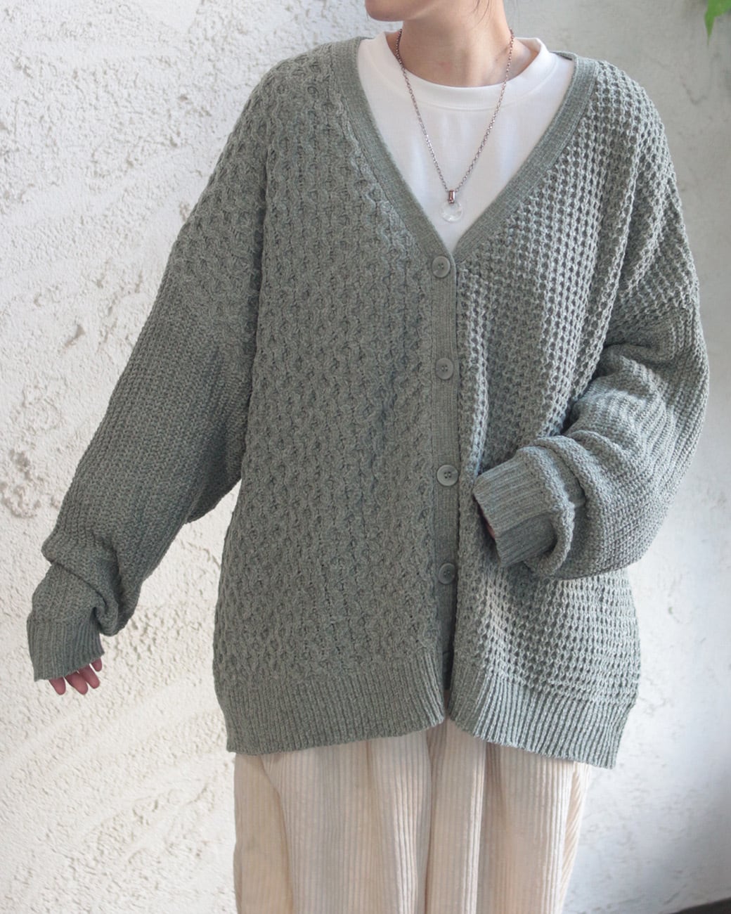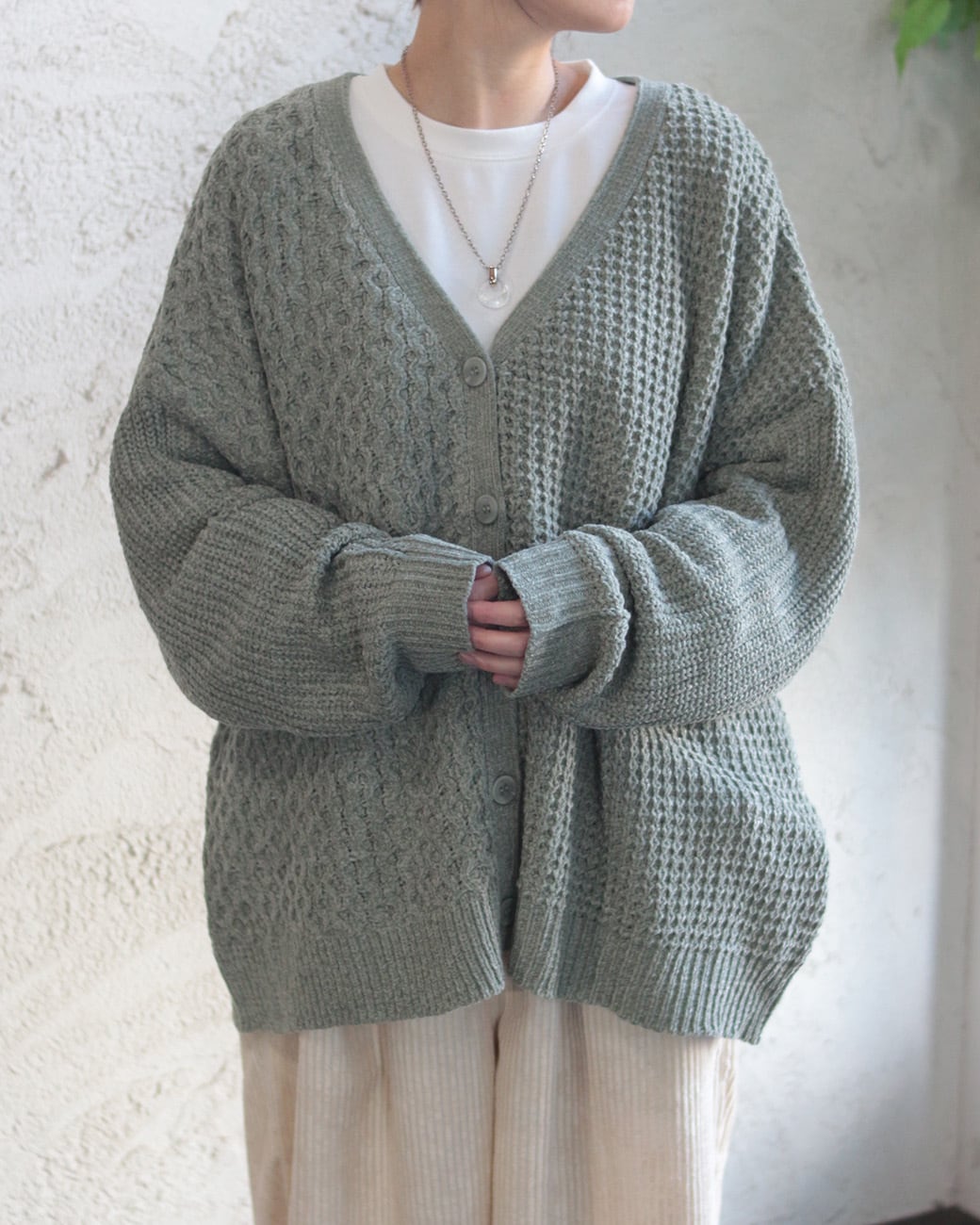モールニット ブークレ ケーブル編み カーディガン 柄切替 ドロップショルダー ふんわりニット 軽量ニット 秋 冬