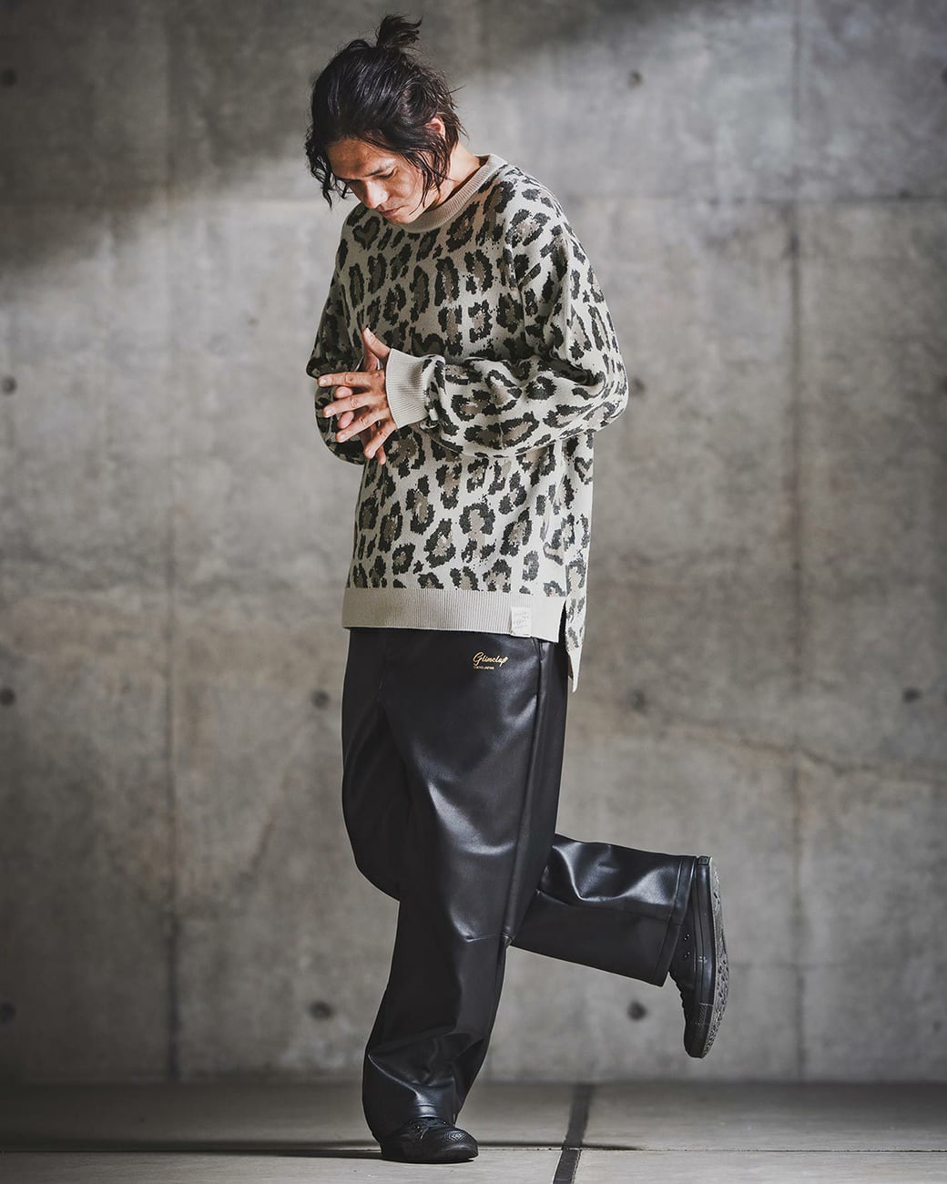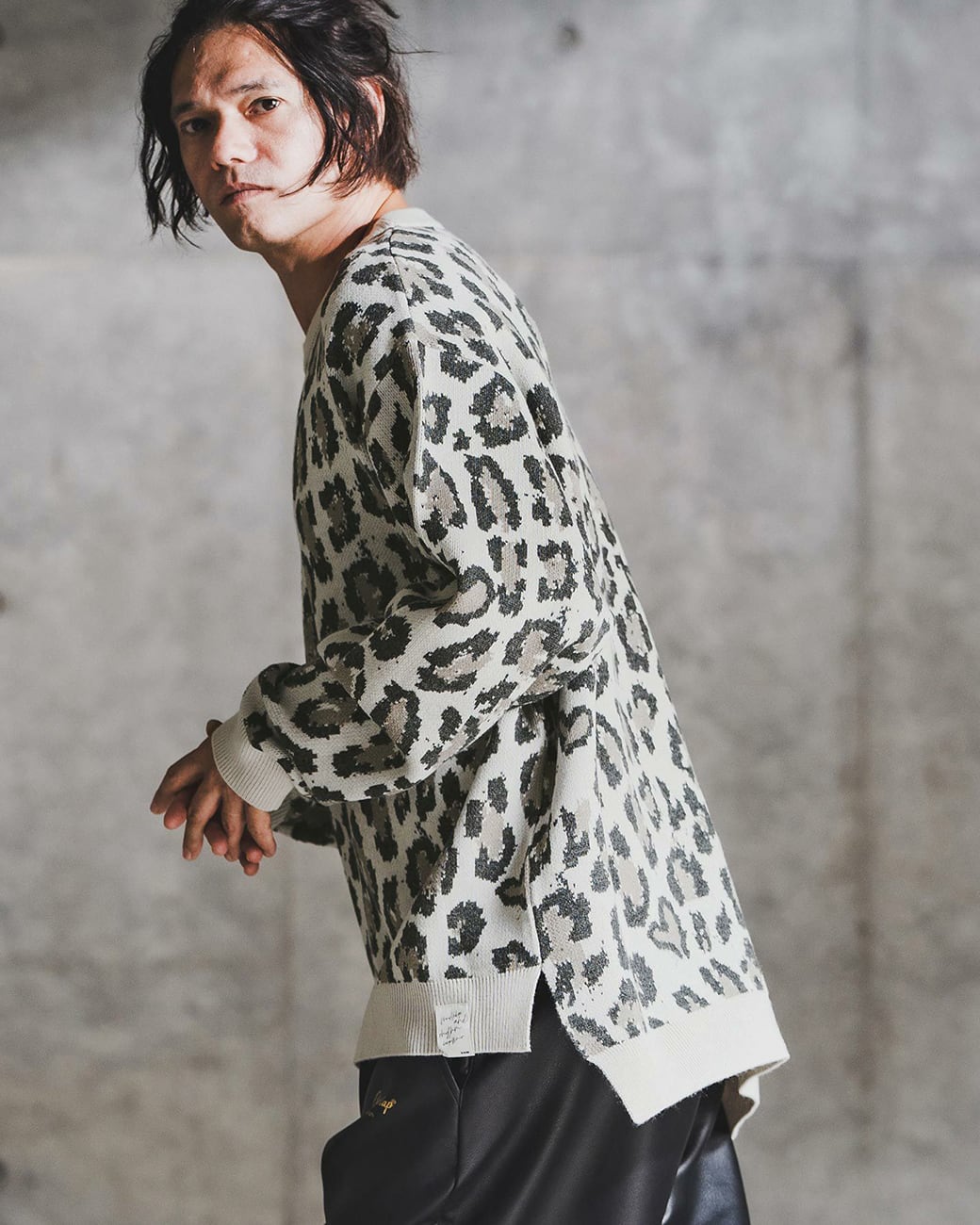 レオパード柄をダブルジャカードで編み込んだニットアイテム。