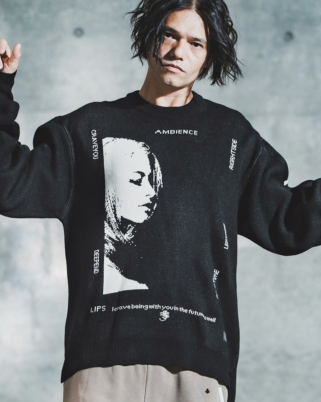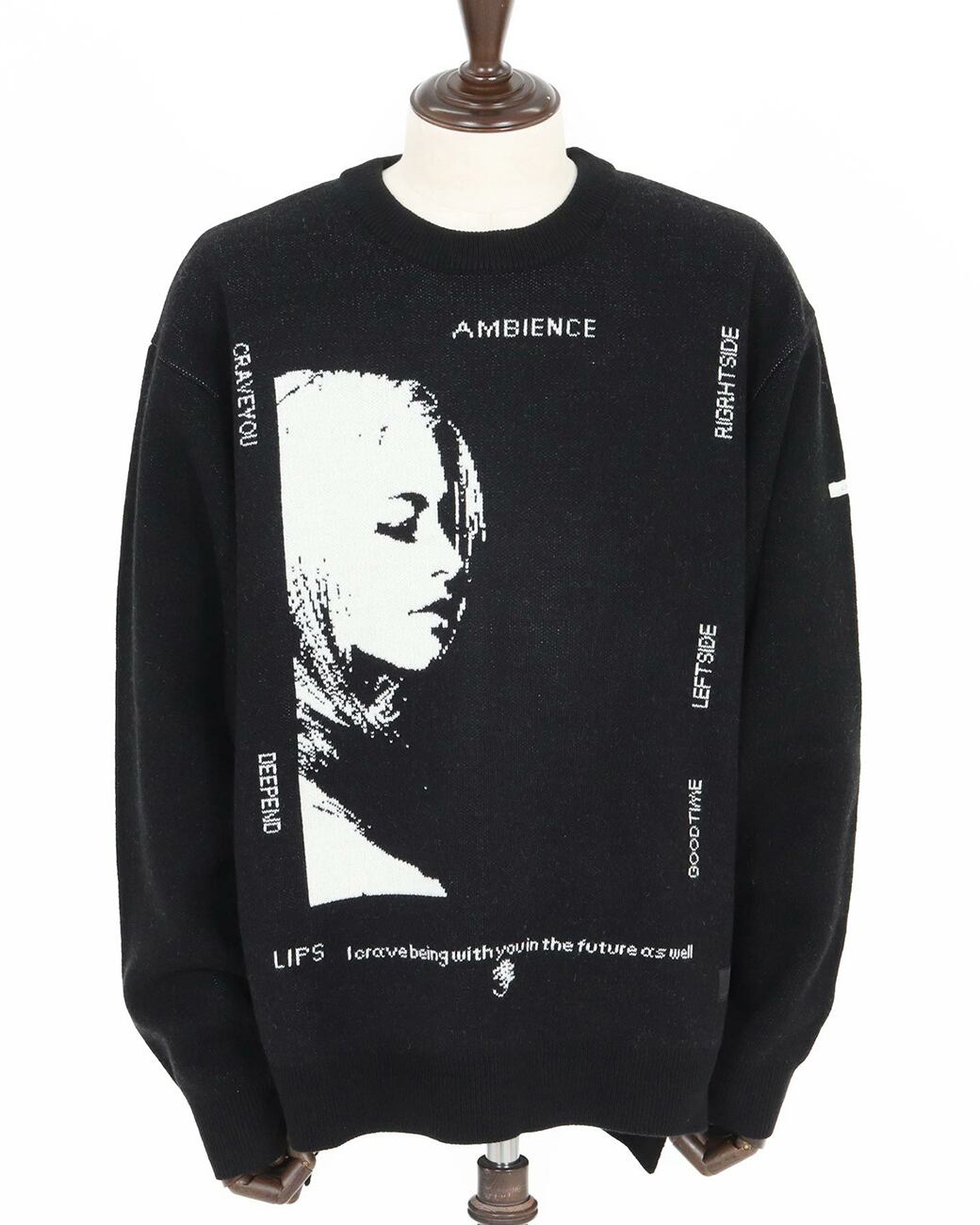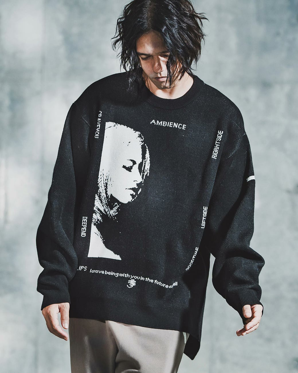 フロント全面に配した女性の横顔と英文字のコンビネーション柄は、繊細なタッチで編み込んだダブルジャガード編み。