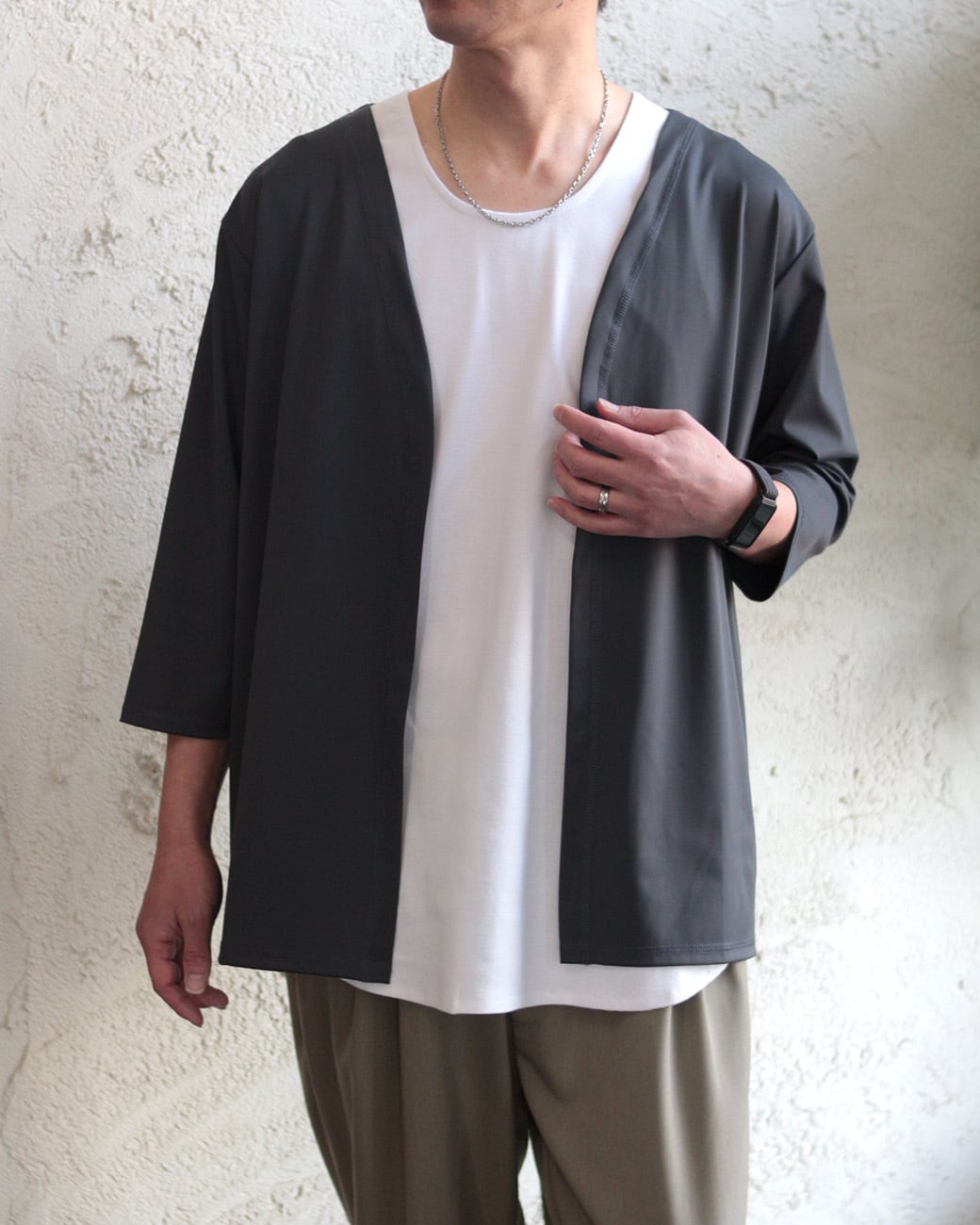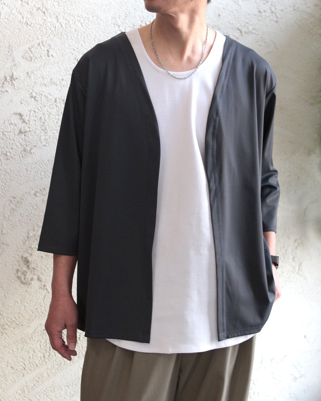 薄手ながら透け感のない肉感で春から初夏、晩夏から秋口の羽織りとして最適。