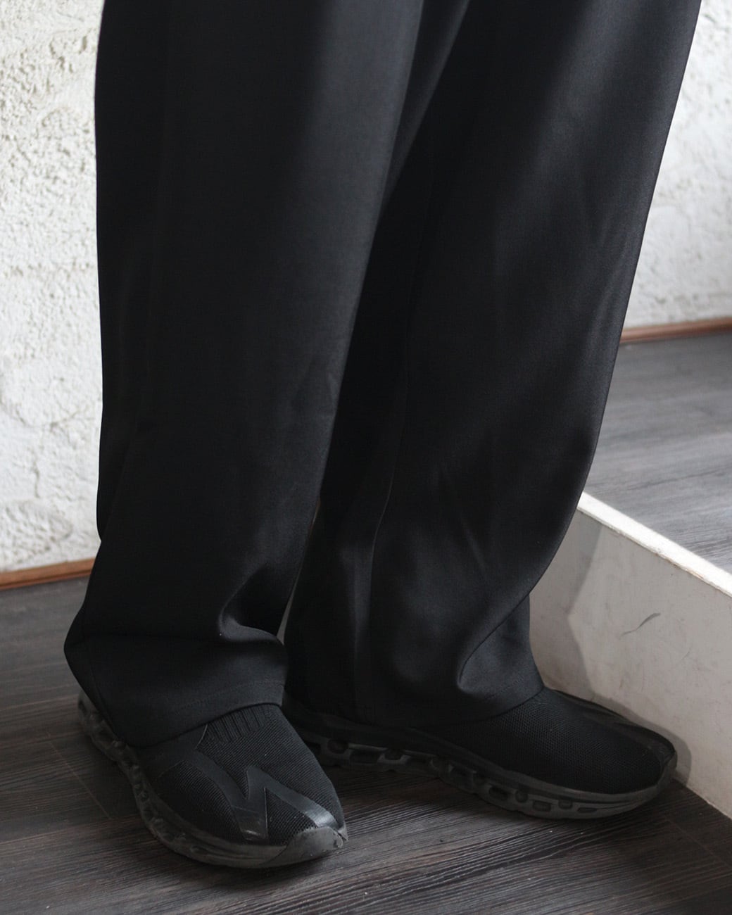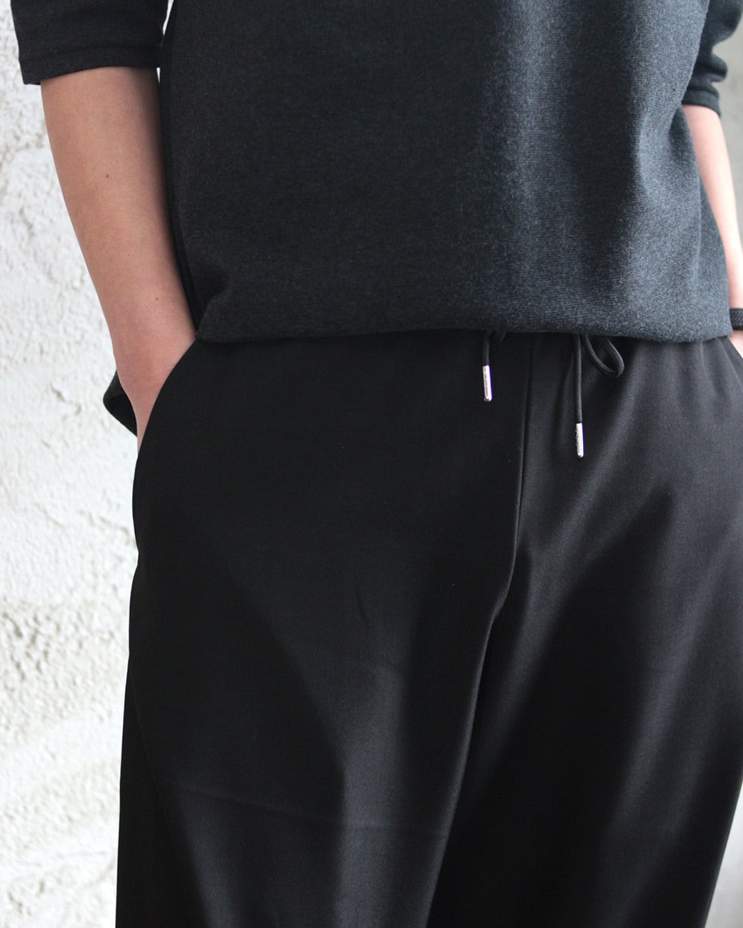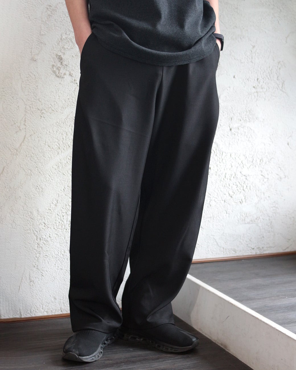 ワタリやヒップ周りにゆとりを持たせ、裾にかけてスッと落ちるボリュームのあるシルエットが、モードな雰囲気を演出。