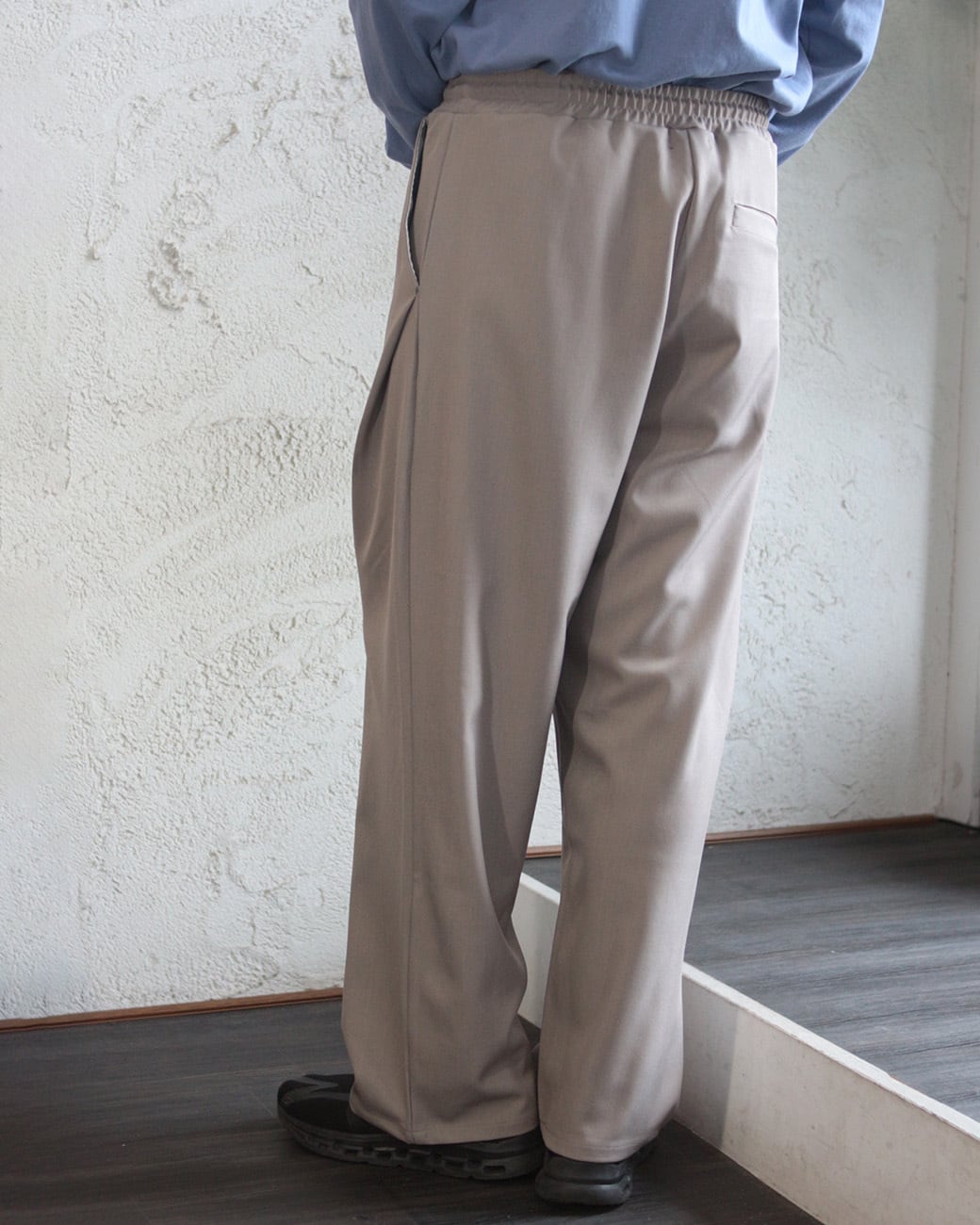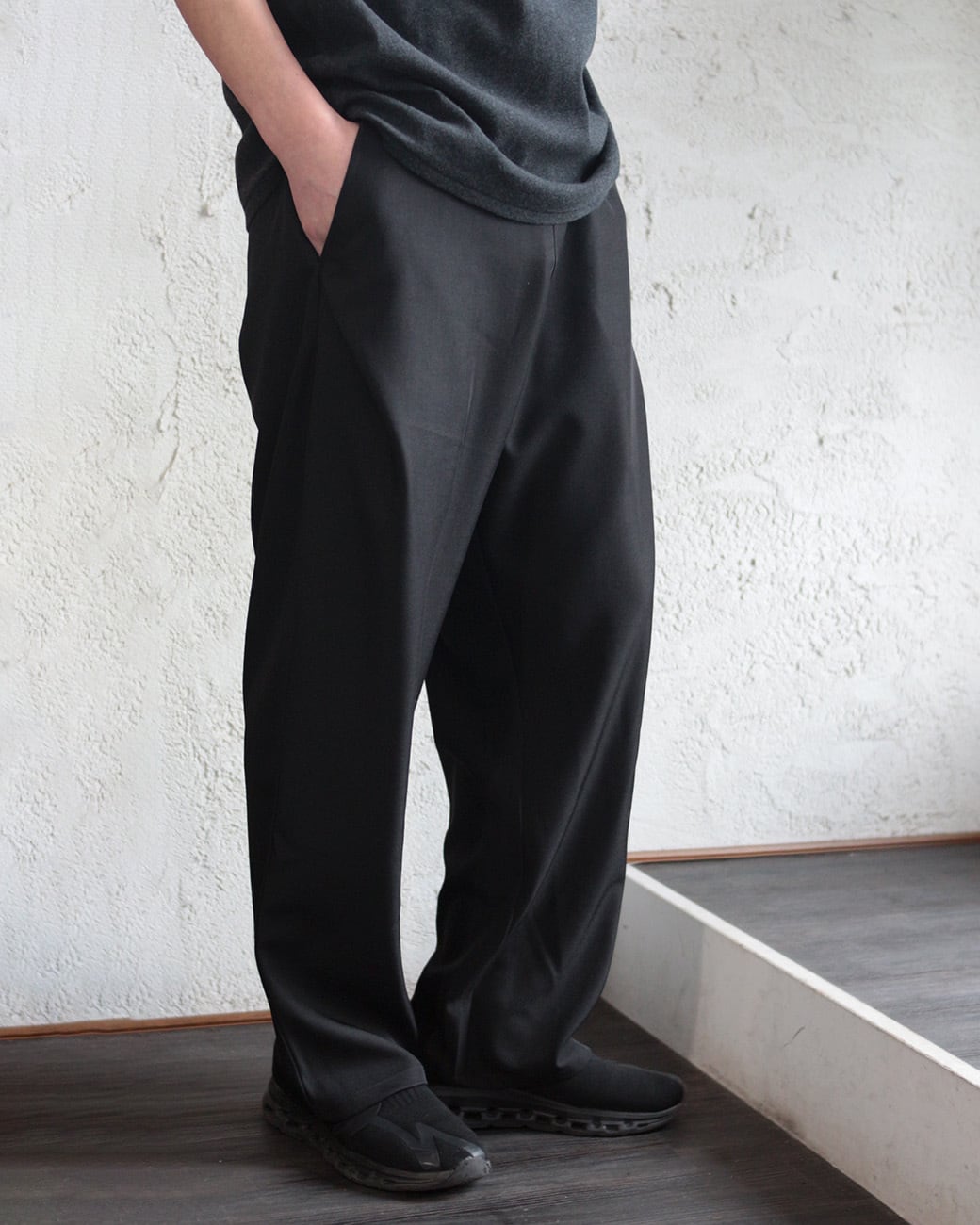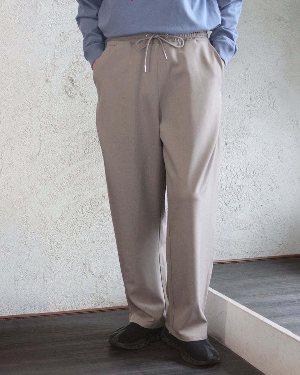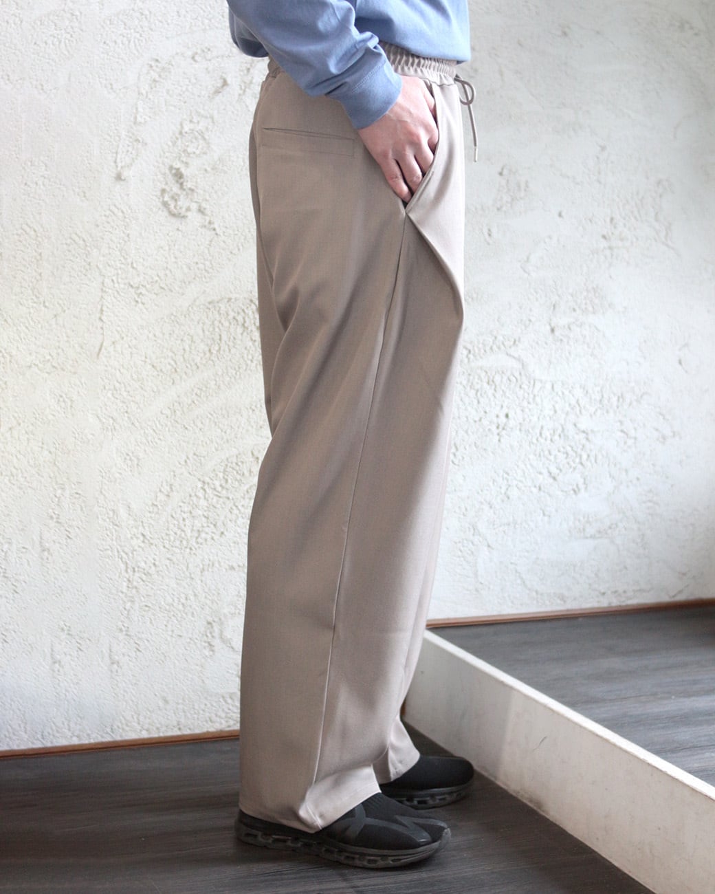 清涼感のあるポリエステルトロピカル素材を使用した、ワイドストレートシルエットのイージースラックス。