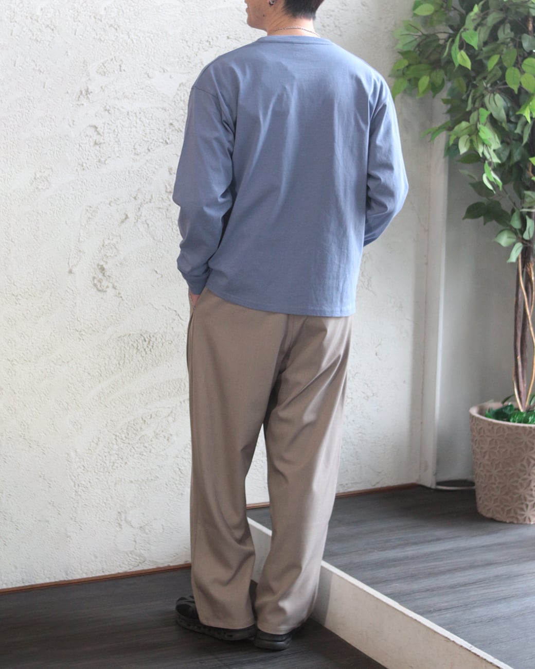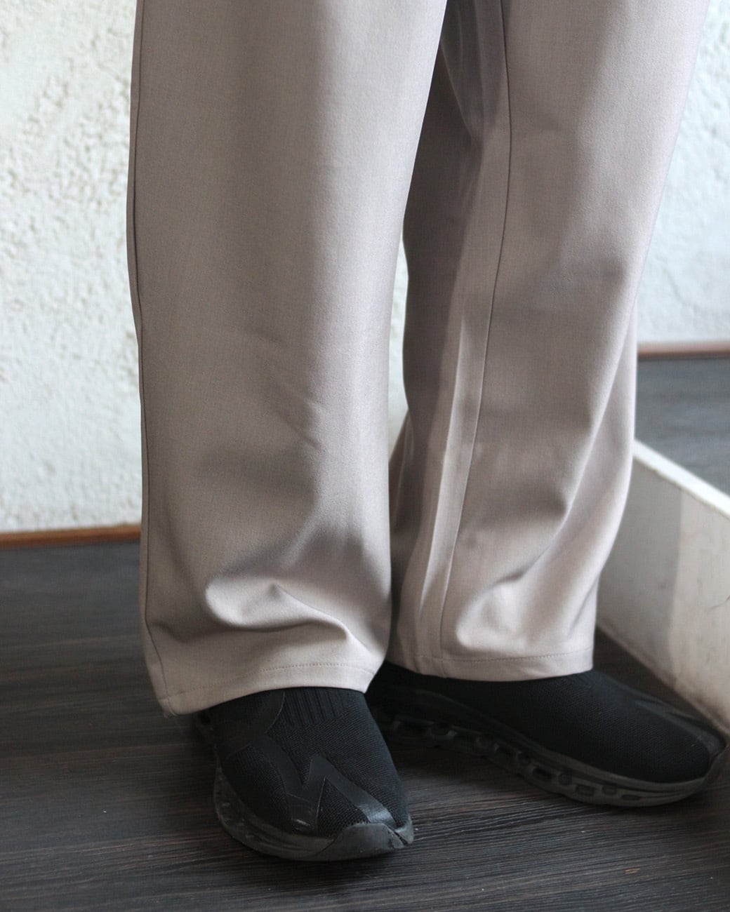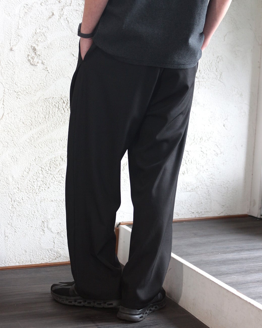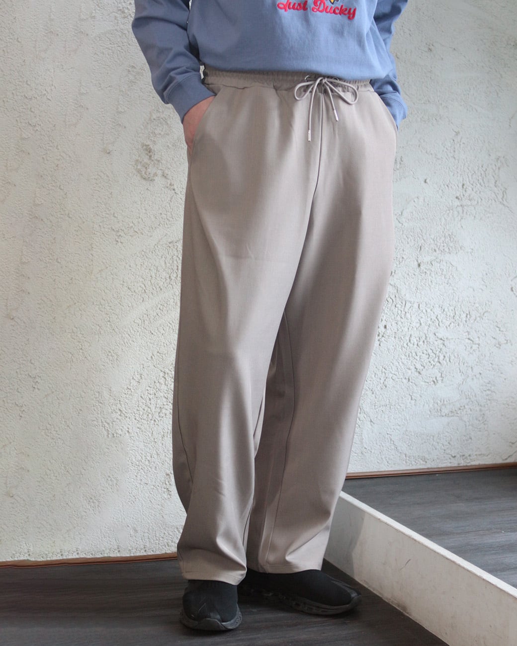 清涼感のあるポリエステルトロピカル素材を使用した、ワイドストレートシルエットのイージースラックス。