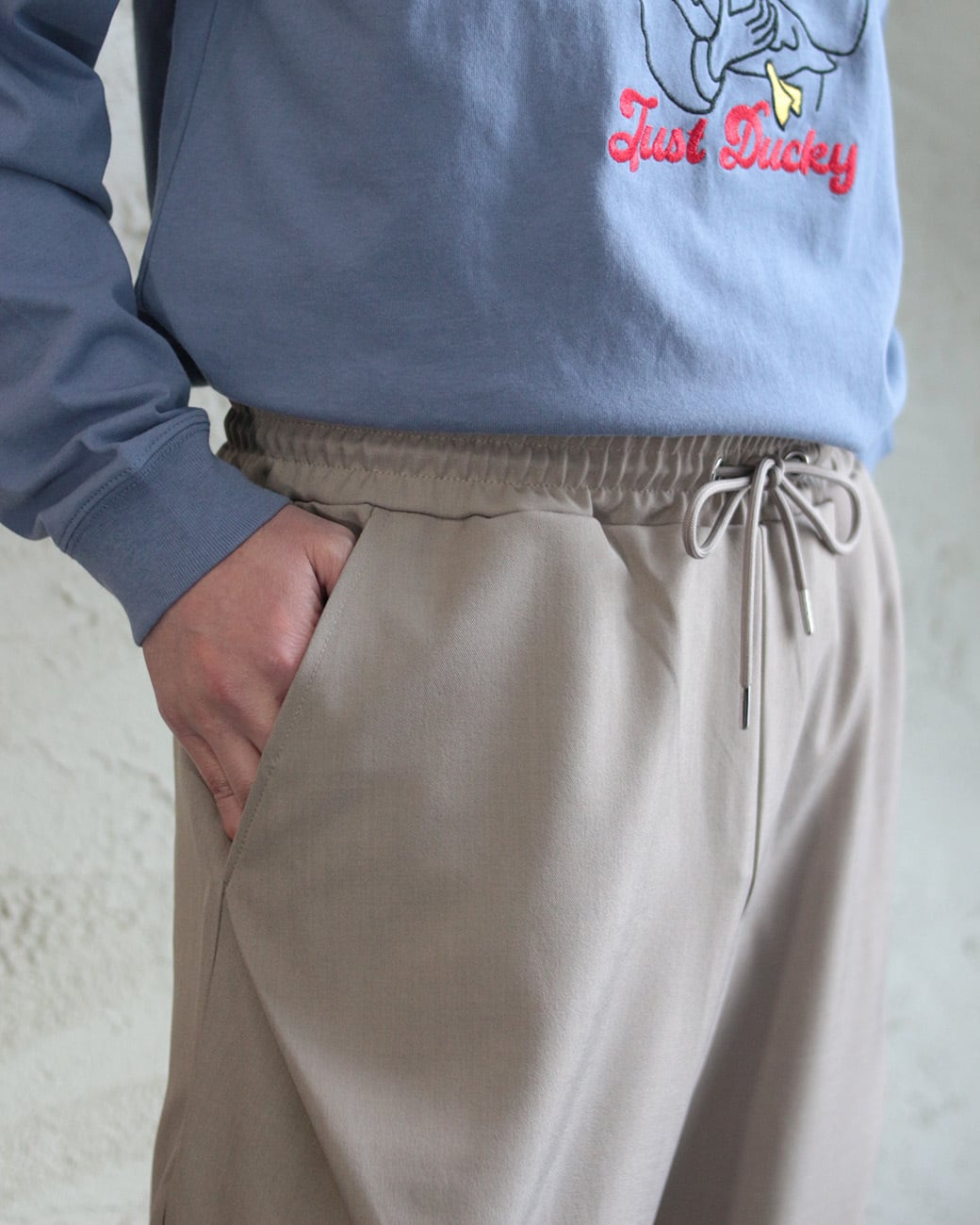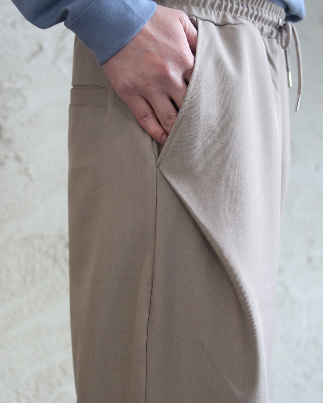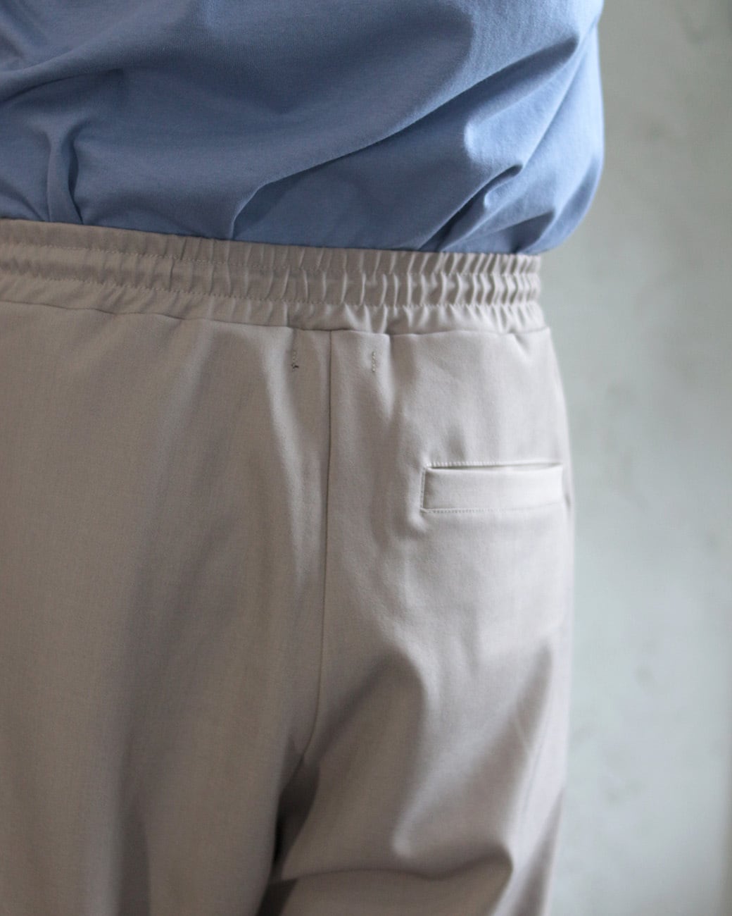 ウエストは平ゴムとスピンドルを配したイージー仕様で、リラックスした穿き心地に。