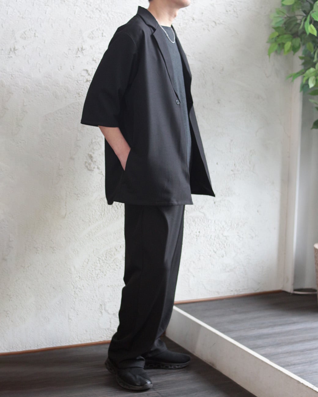 同素材の半袖ジャケットと合わせれば、シャツ感覚で羽織れるこなれたセットアップスタイルが完成します。