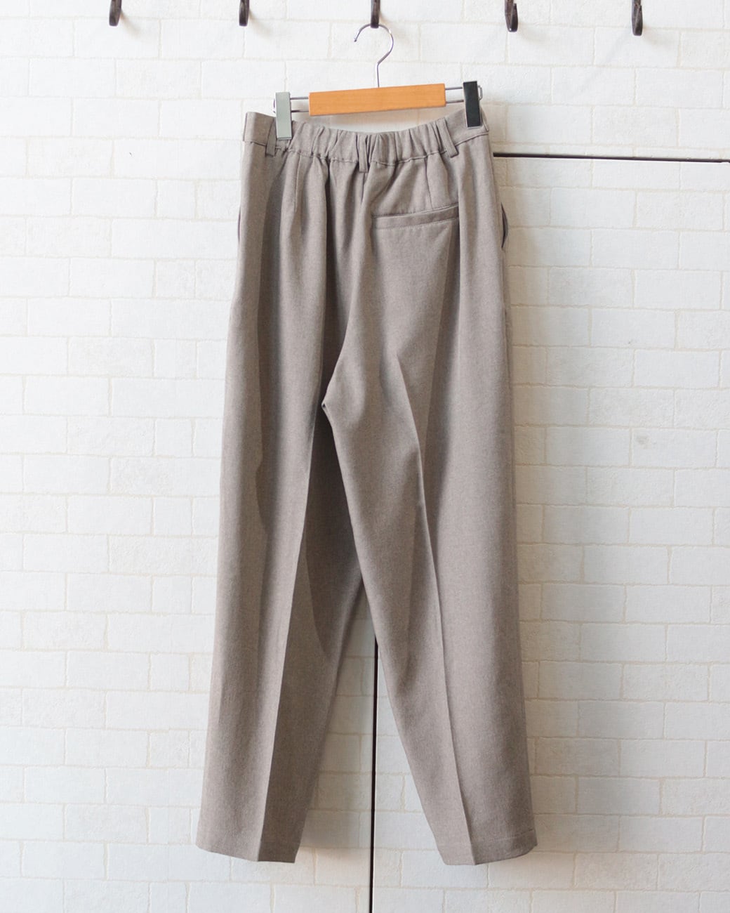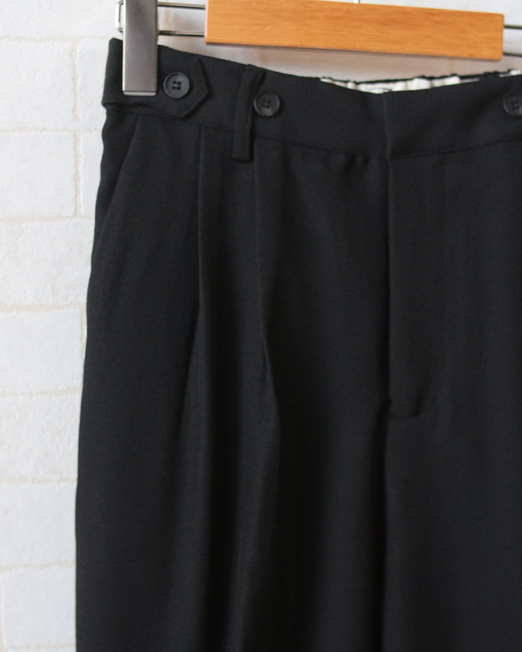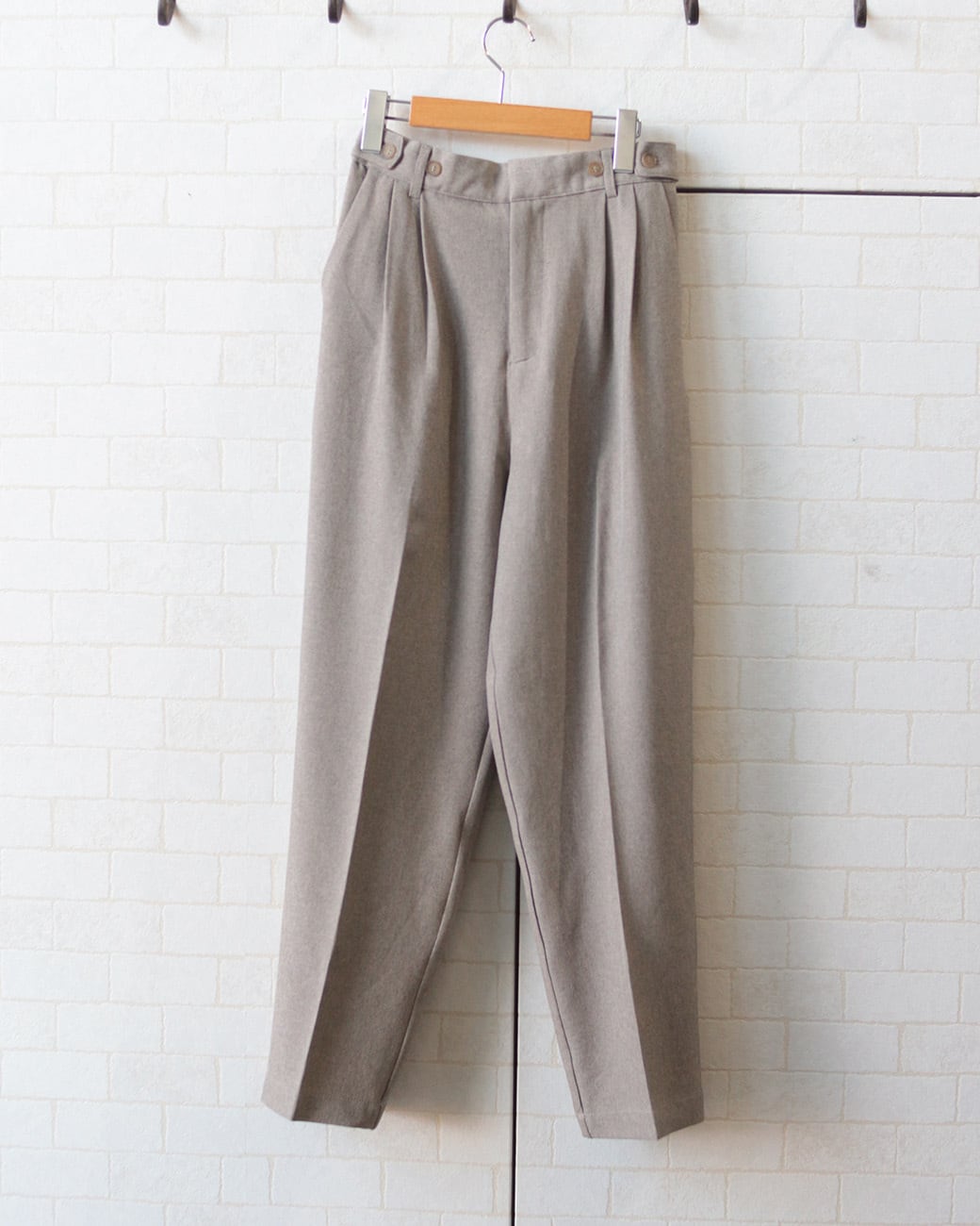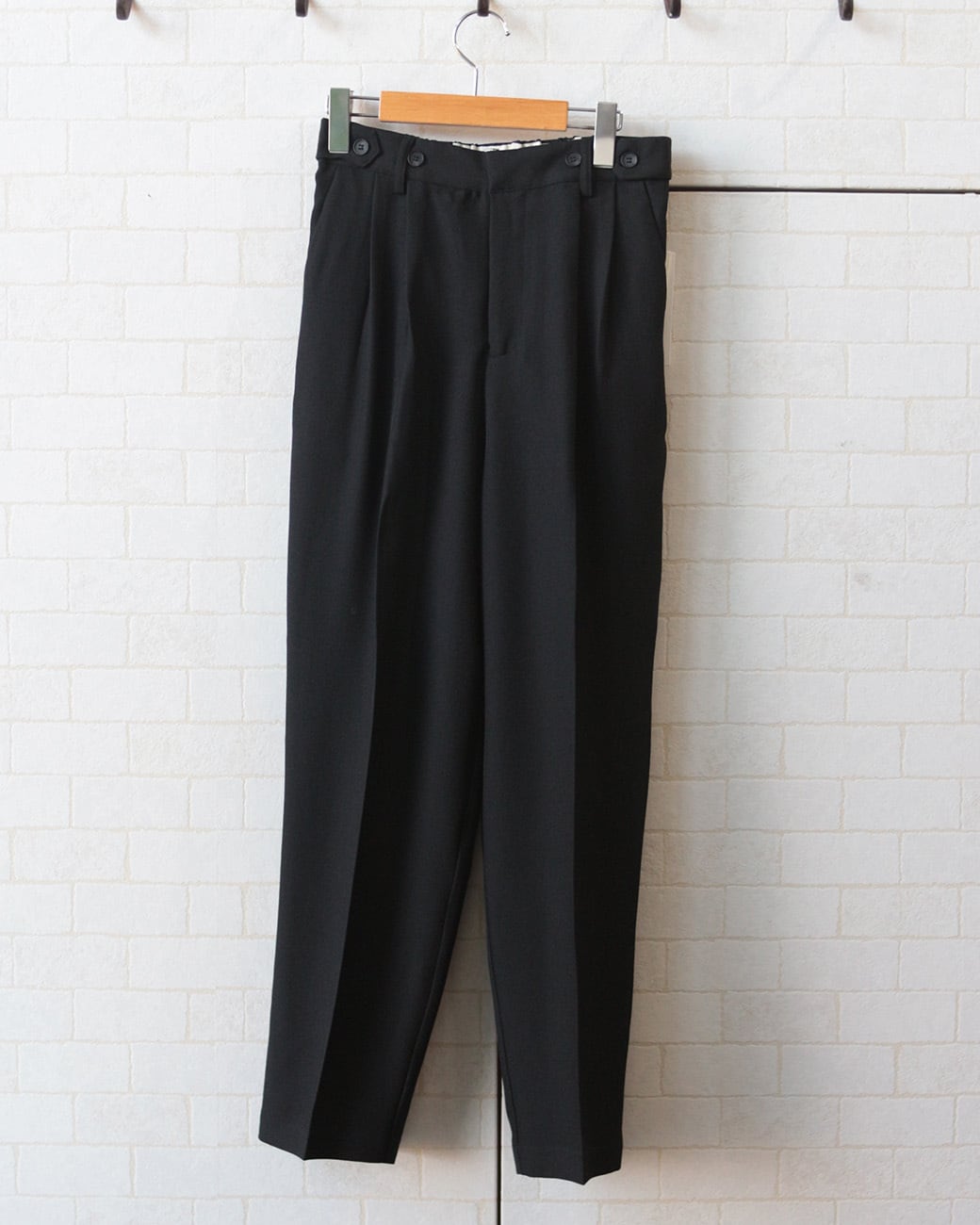 すっきりとしたテーパードパンツは、ウエストにベルト+ボタンのデザインをプラス。