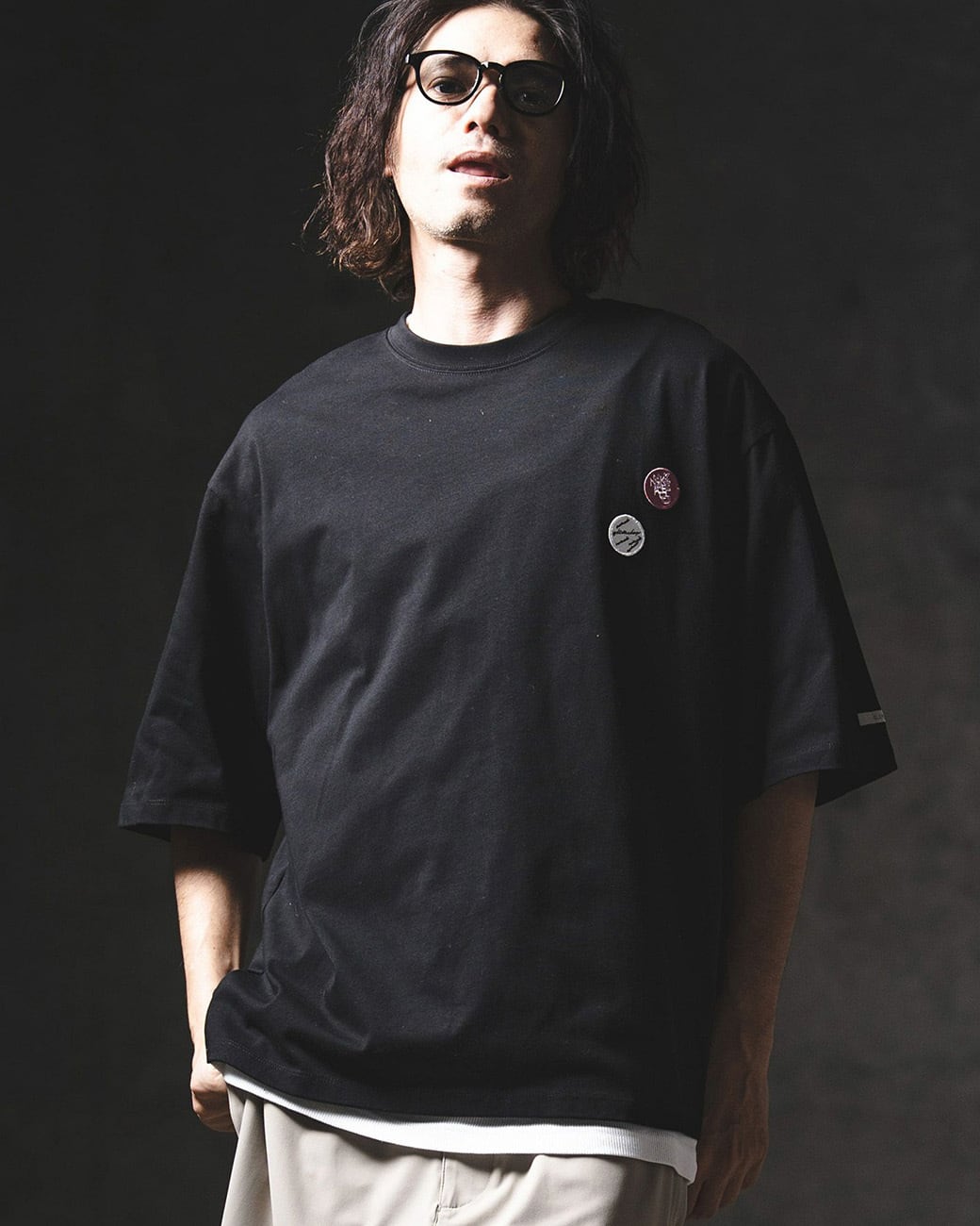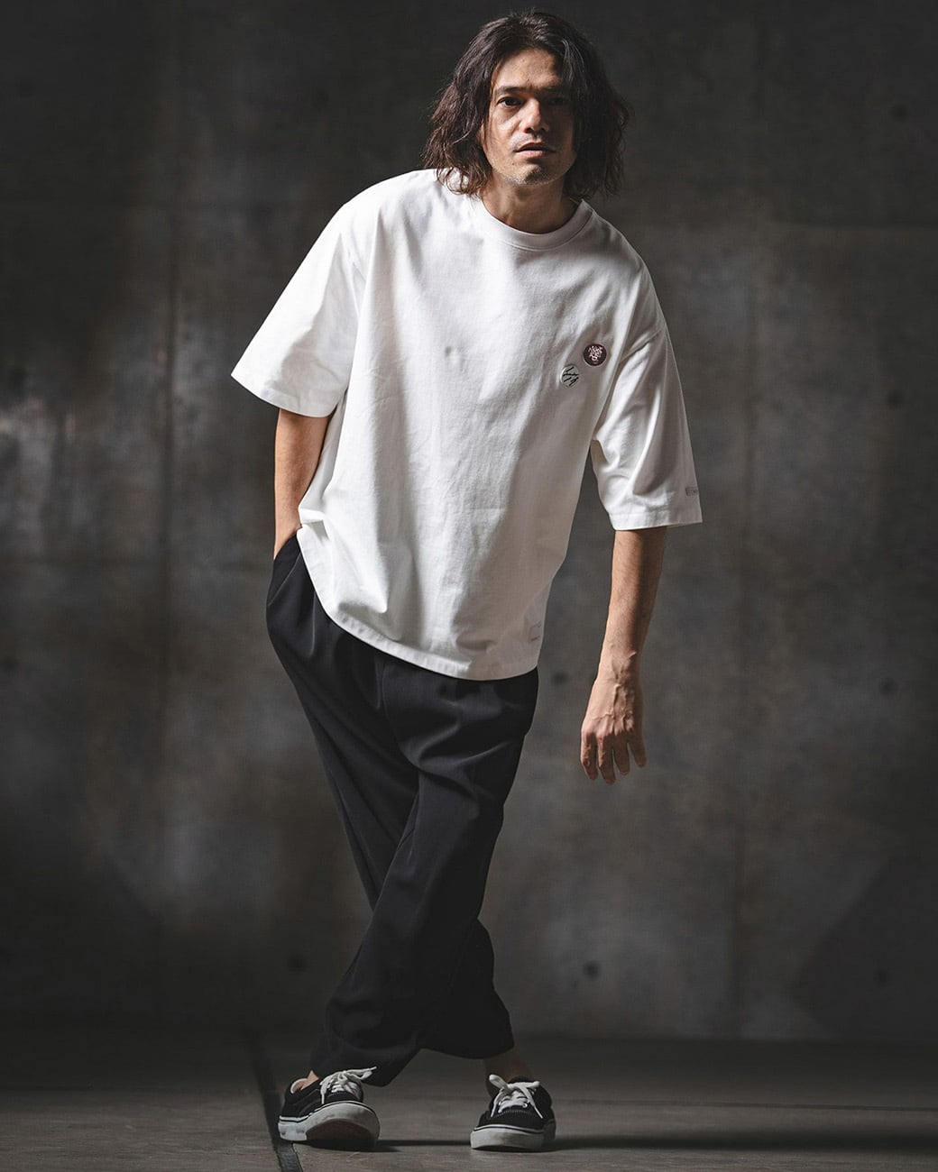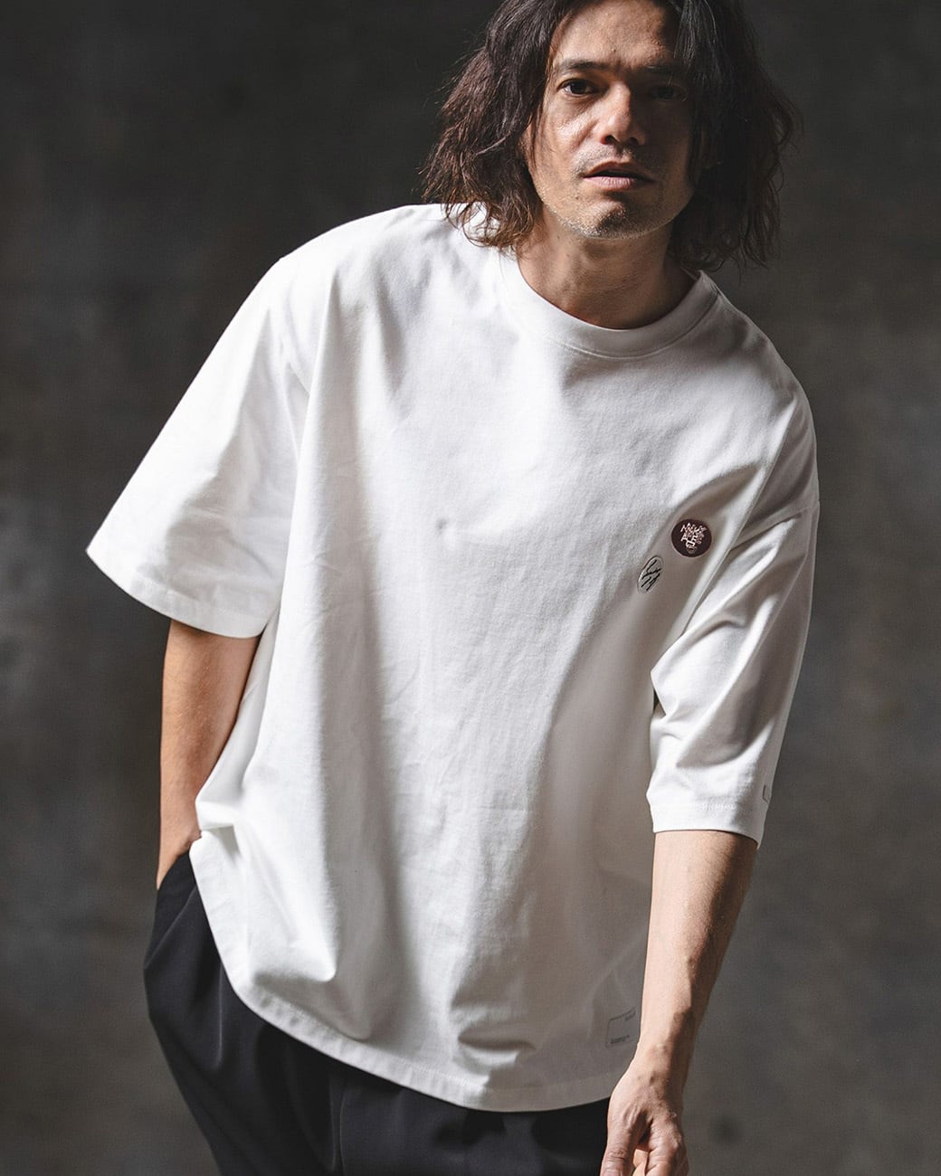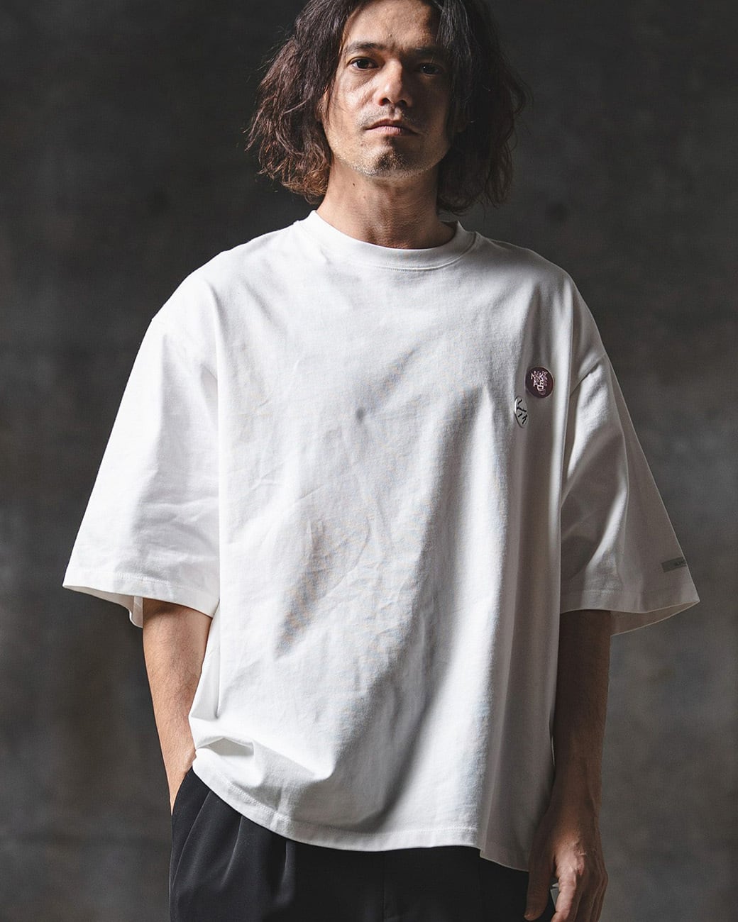 胸元にワッペン刺繍を施し、ミニマルな構成の中にさりげないアイキャッチをプラス。