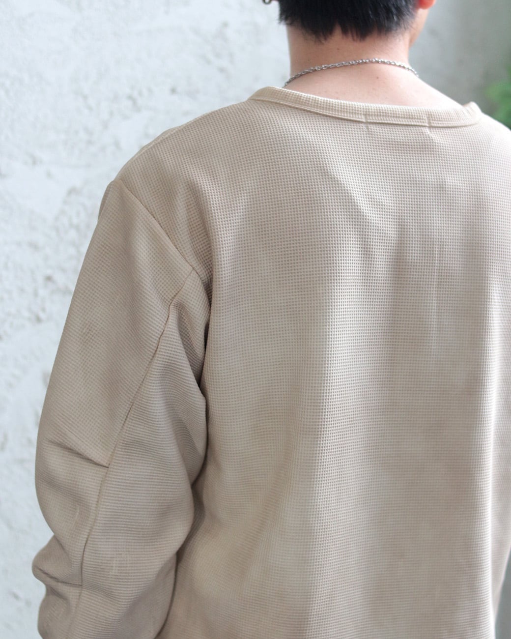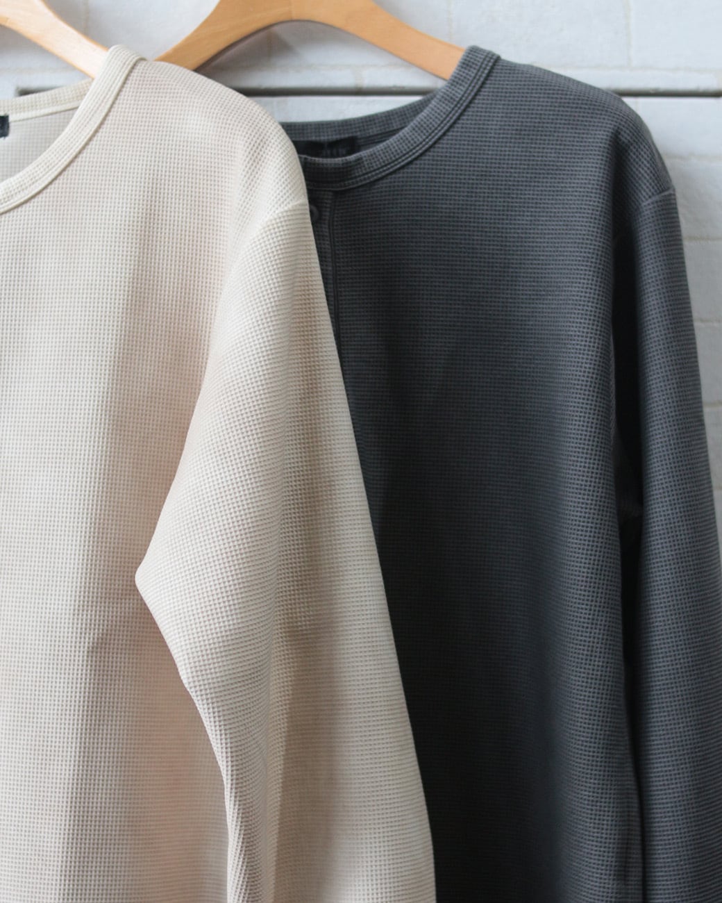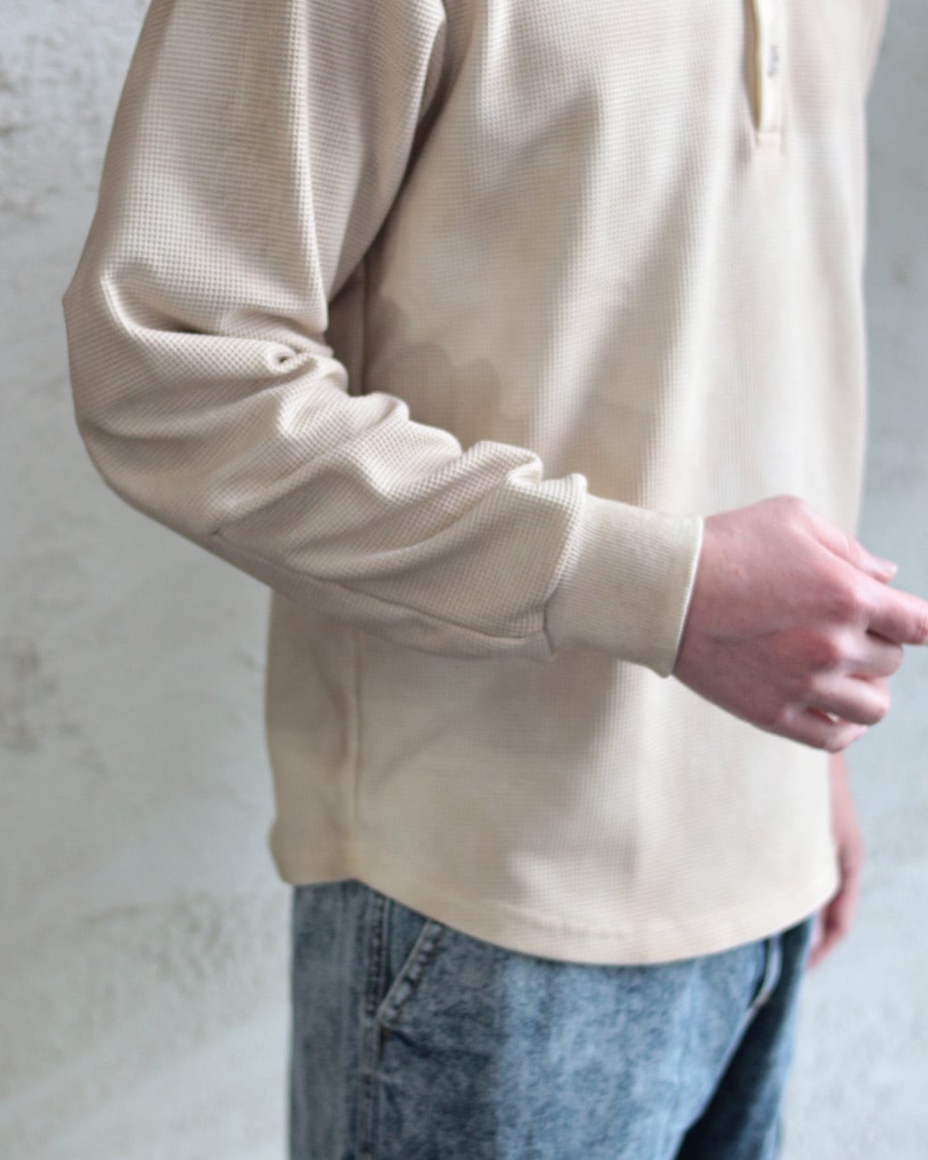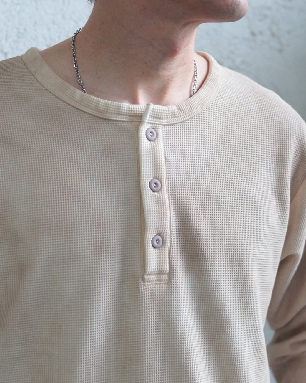 立体感のあるワッフル編みと、程よく開いたヘンリーネックが特徴の長袖Tシャツ。