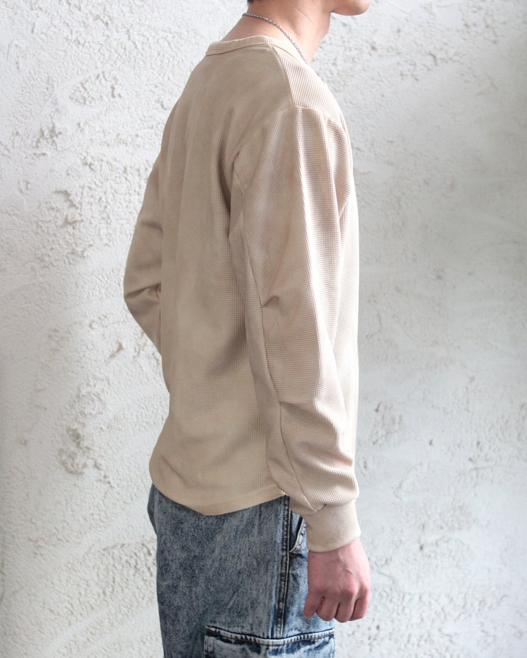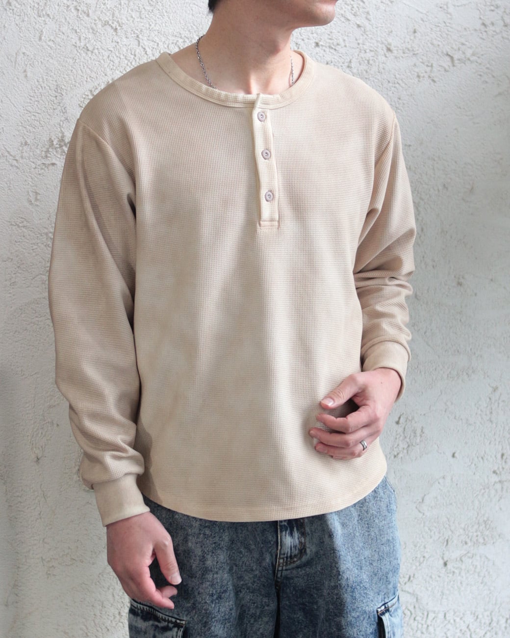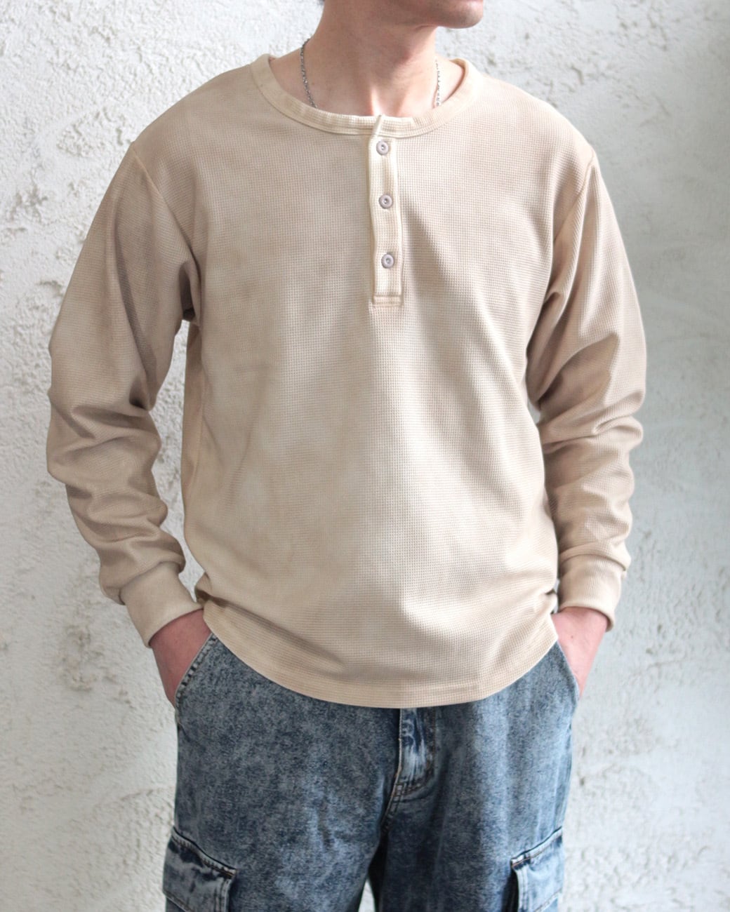 【ワッフル編み ヘンリーネック ビンテージ加工 長袖Tシャツ】