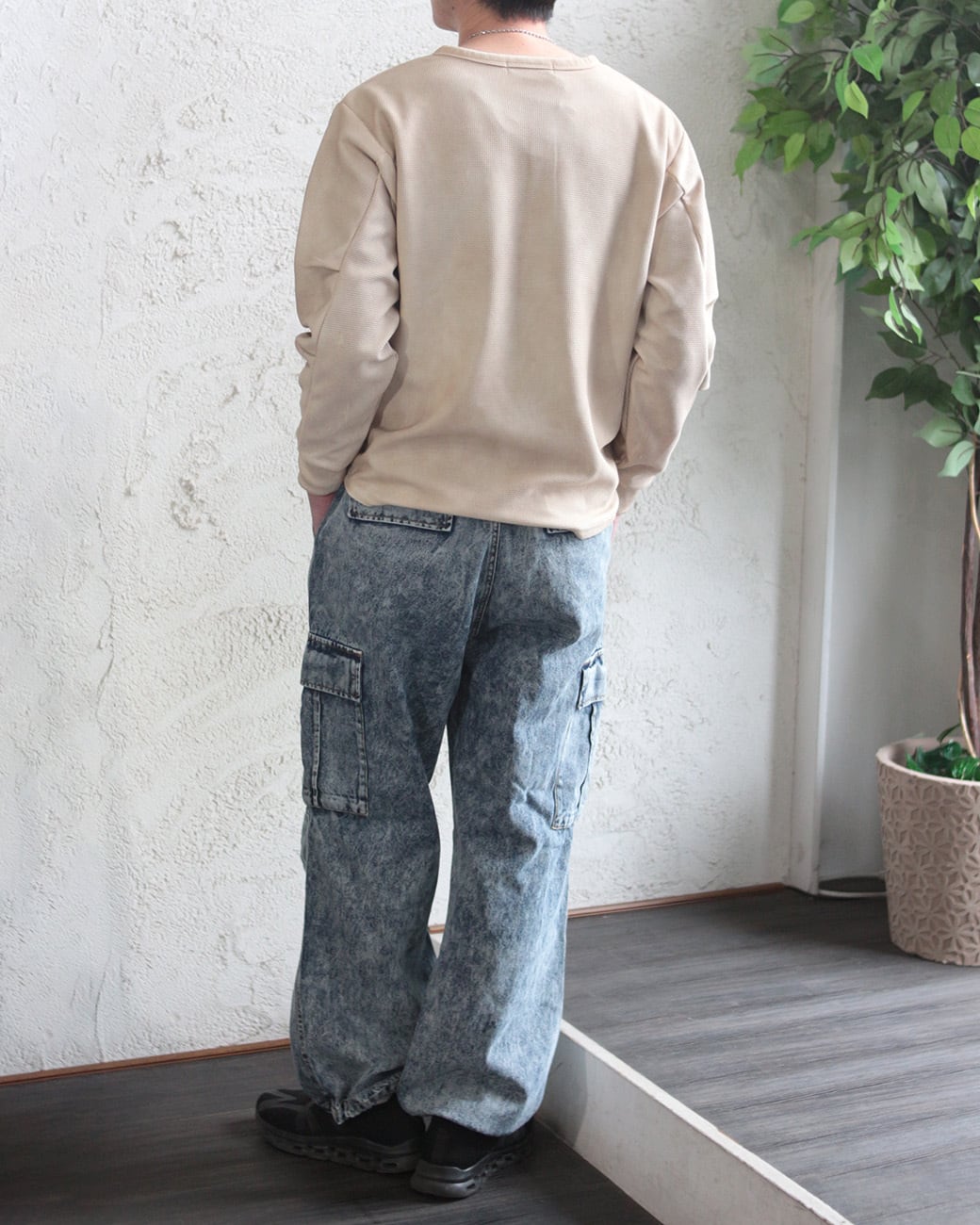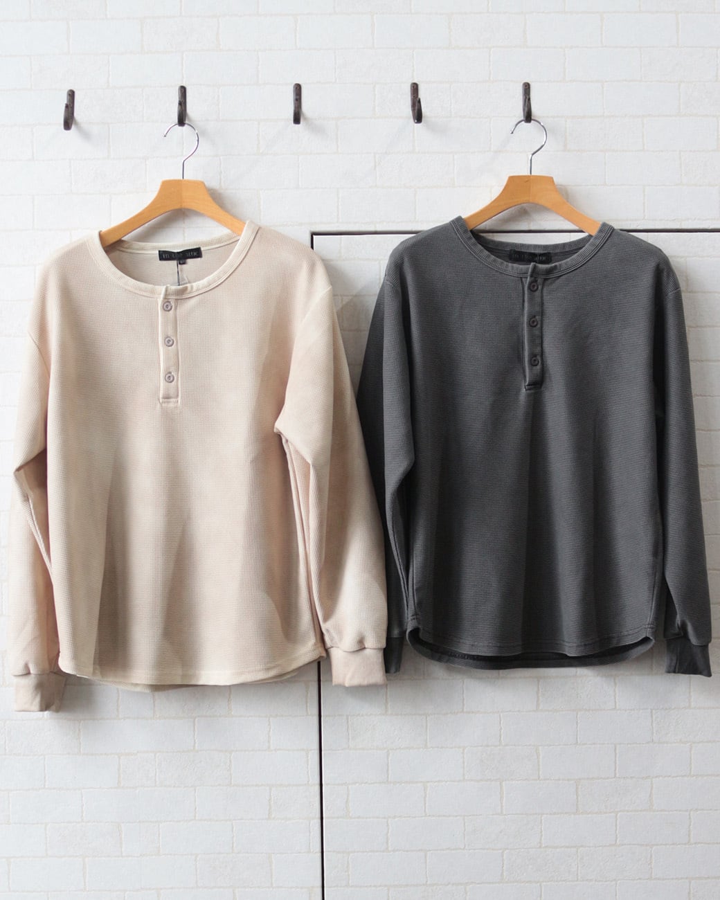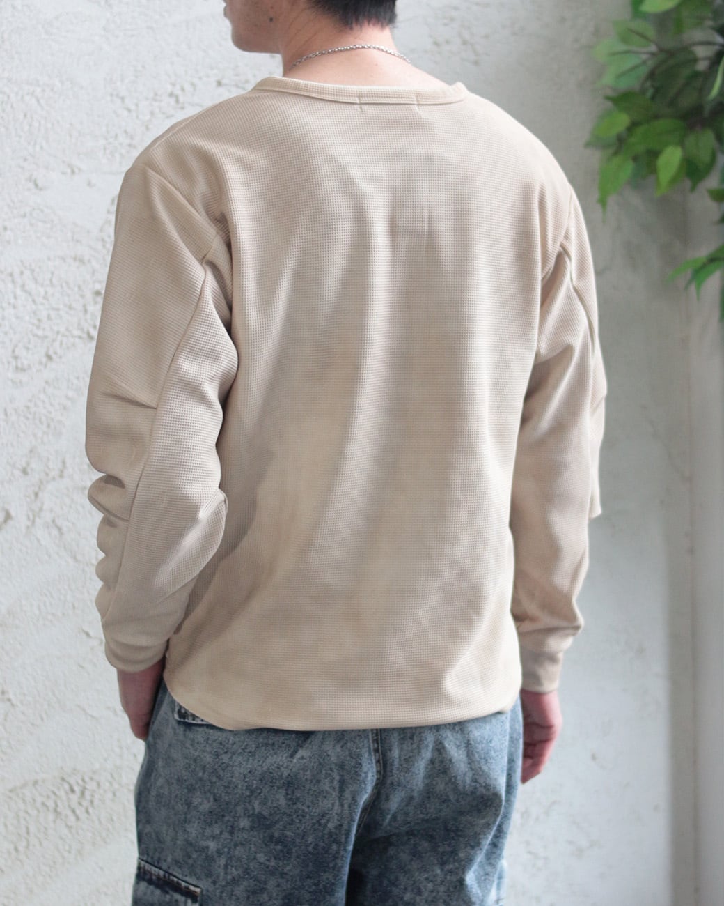 【ワッフル編み ヘンリーネック ビンテージ加工 長袖Tシャツ】