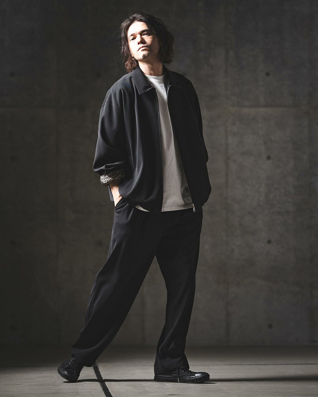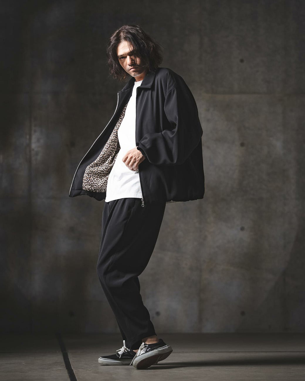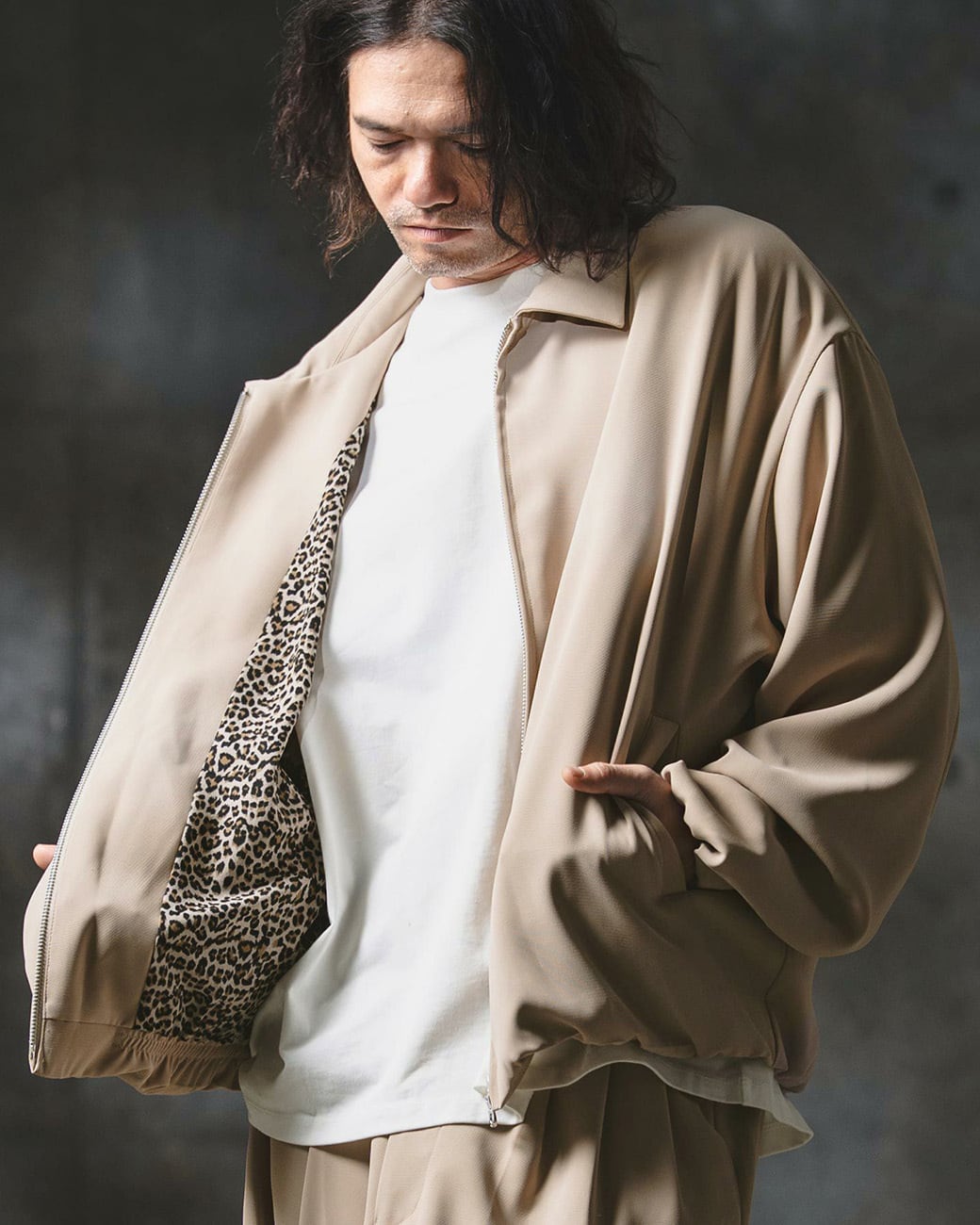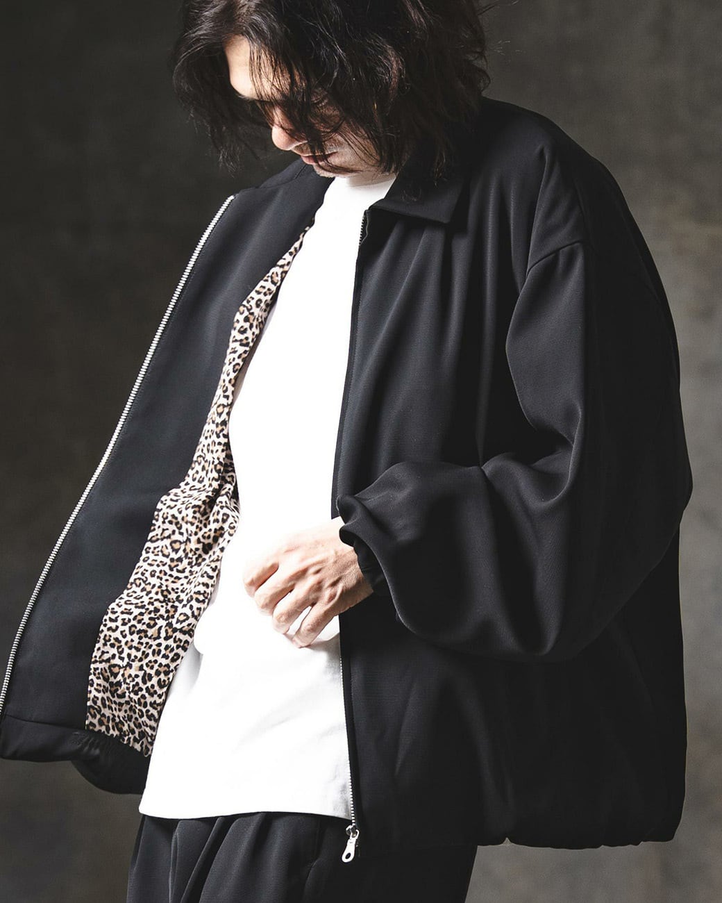 裏地にはレオパードパターンのテキスタイルを採用し、ちらりと見える部分にもエッジの効いたこなしをプラス。