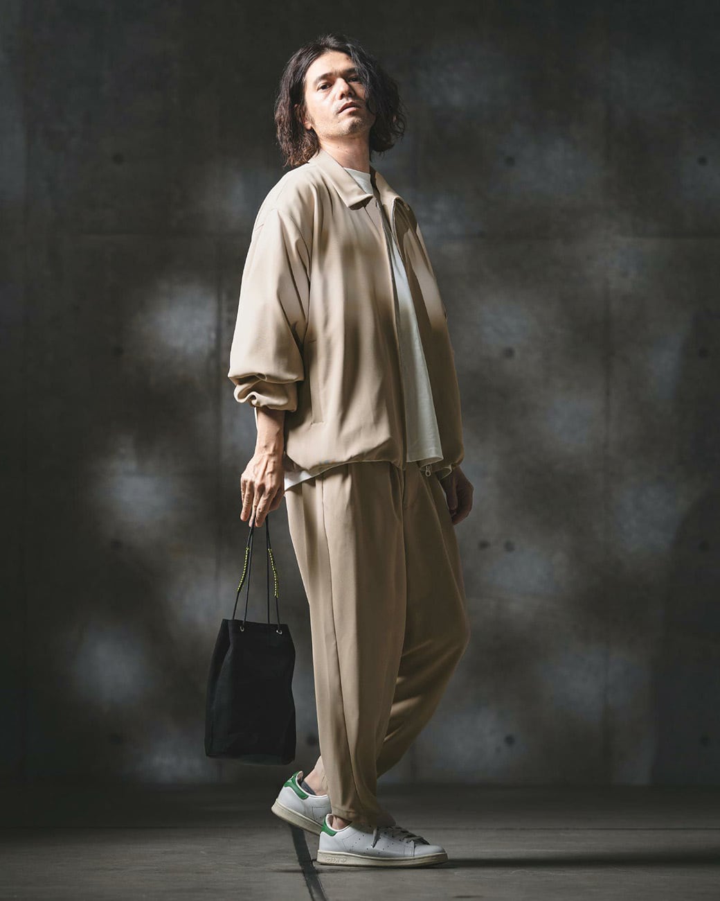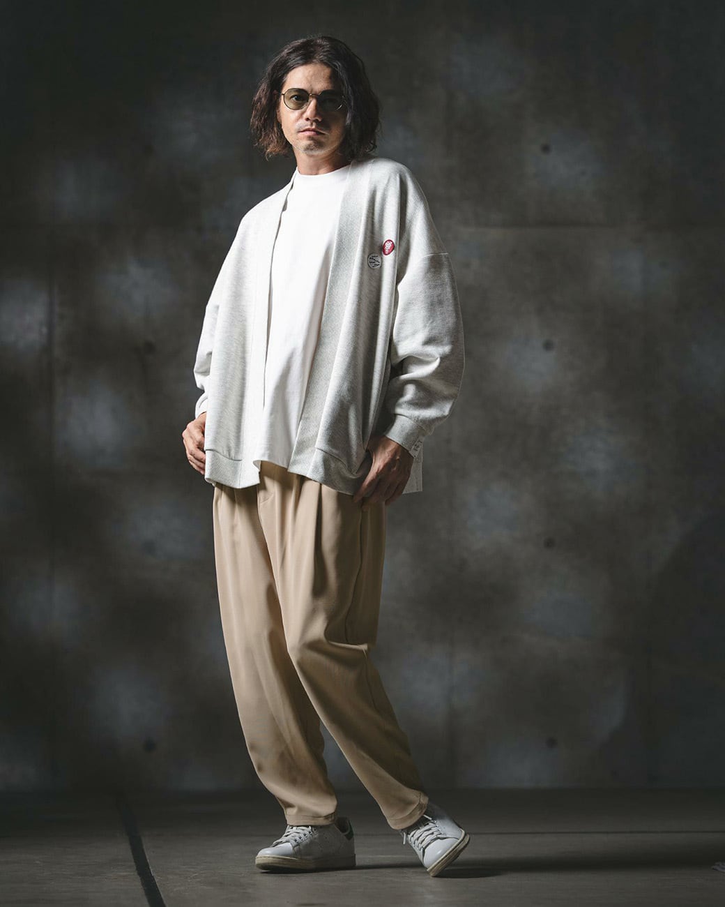 同素材の羽織りアイテムとのセットアップにも対応し、洗練された統一感のあるスタイリングが可能な一枚です。