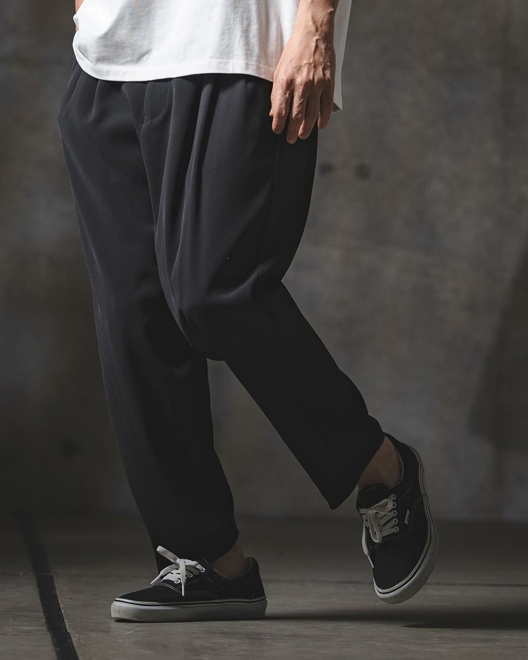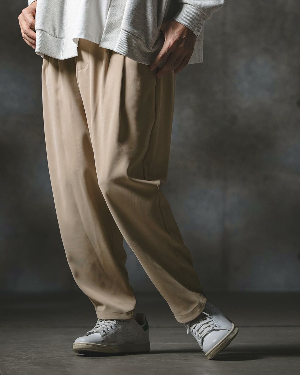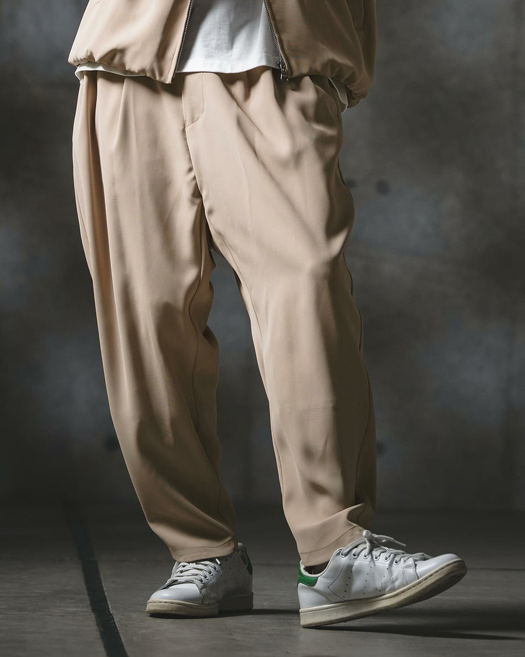 しなやかな風合いのポリエステルクロス素材を使用した、ボリューム感のあるシルエットのテーパードパンツ。