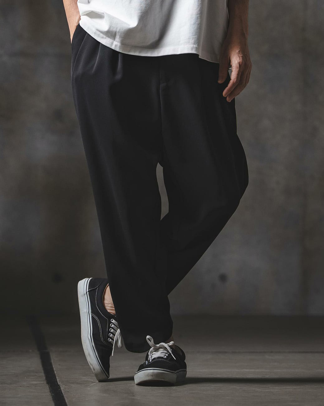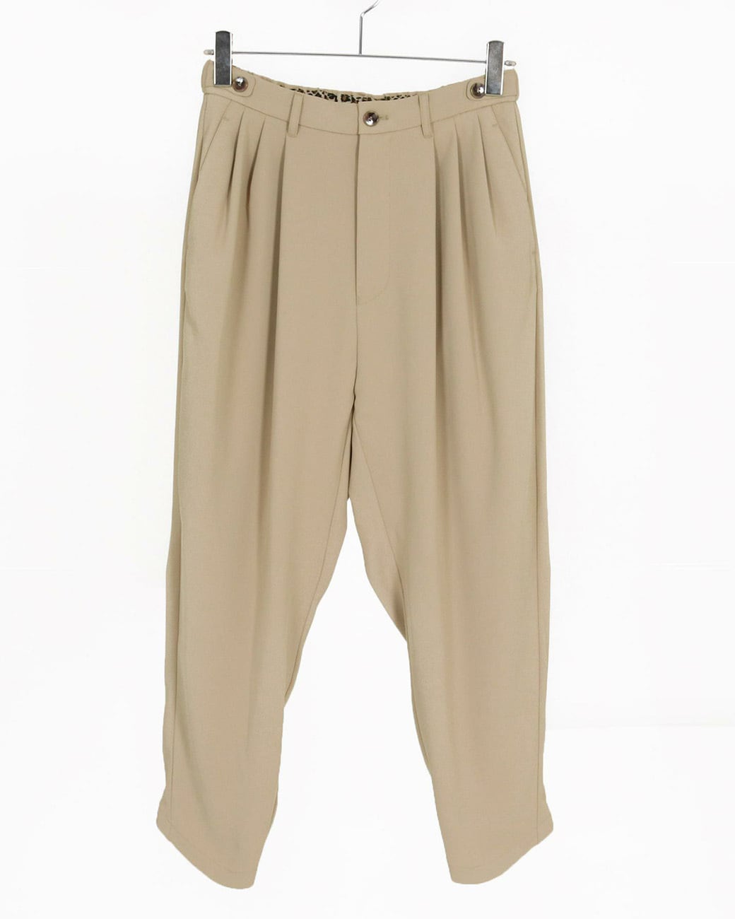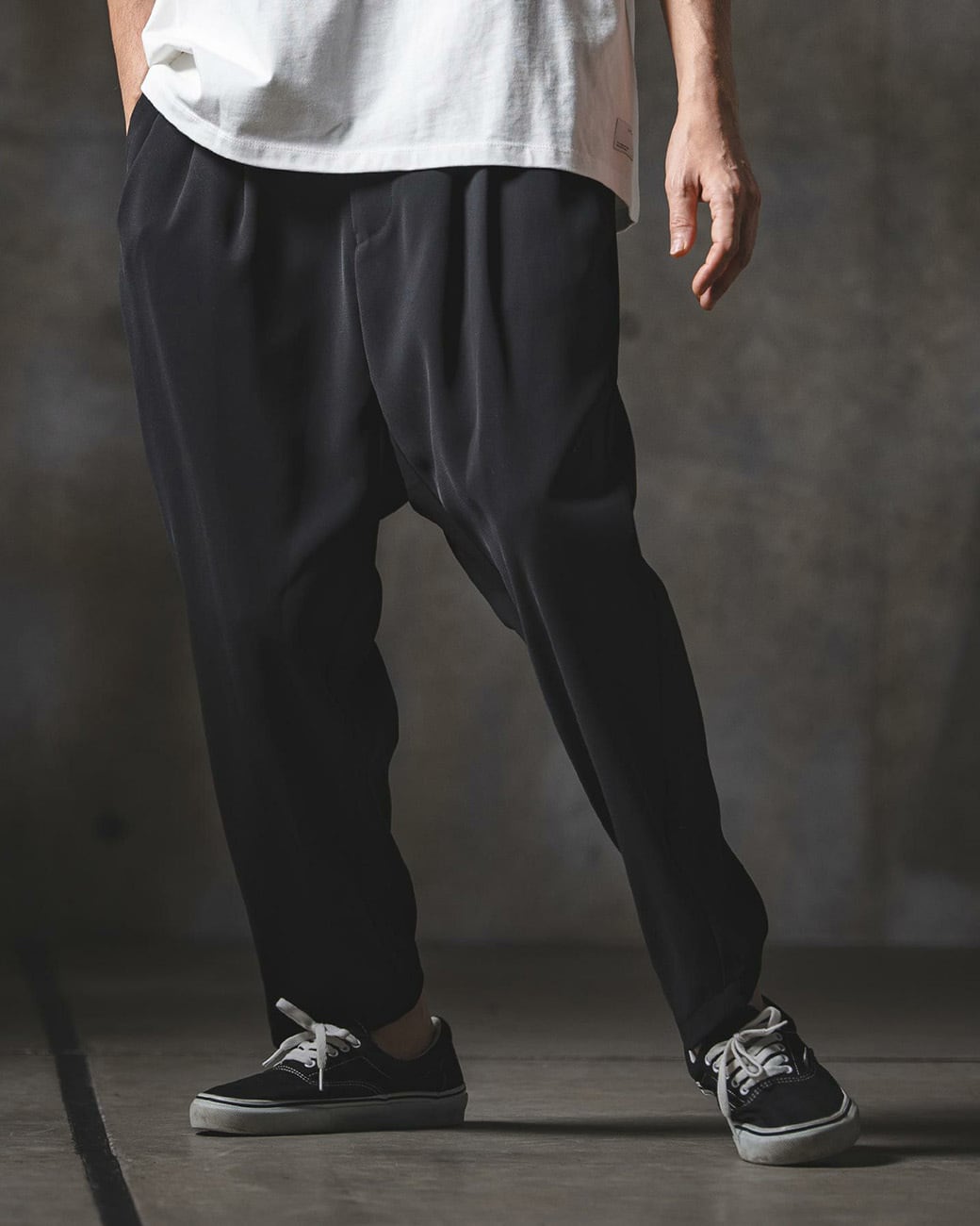 しなやかな風合いのポリエステルクロス素材を使用した、ボリューム感のあるシルエットのテーパードパンツ。