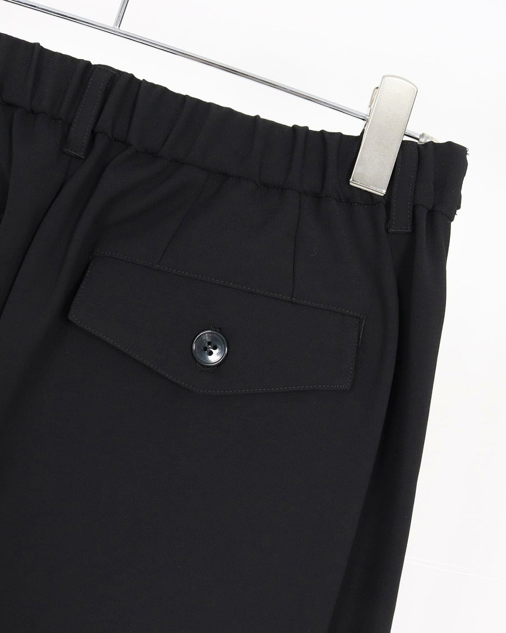 ボタン&ファスナーのフロント開閉に加え、平ゴム&スピンドルを配したイージー仕様で、快適な着用感を実現しています。