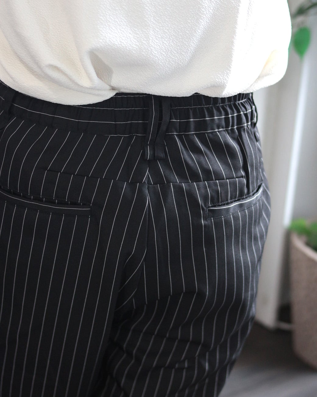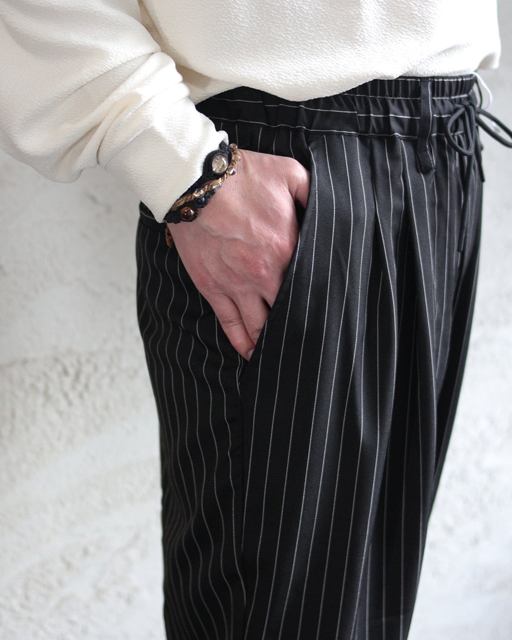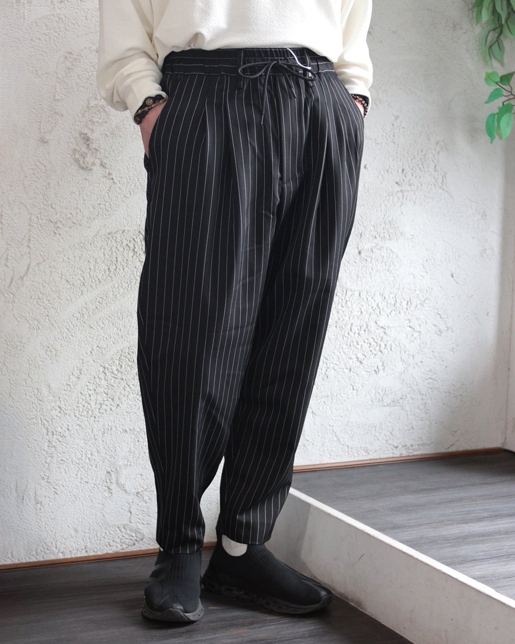 洗練された表情と快適な穿き心地を兼ね備えたストライプ柄スラックス。