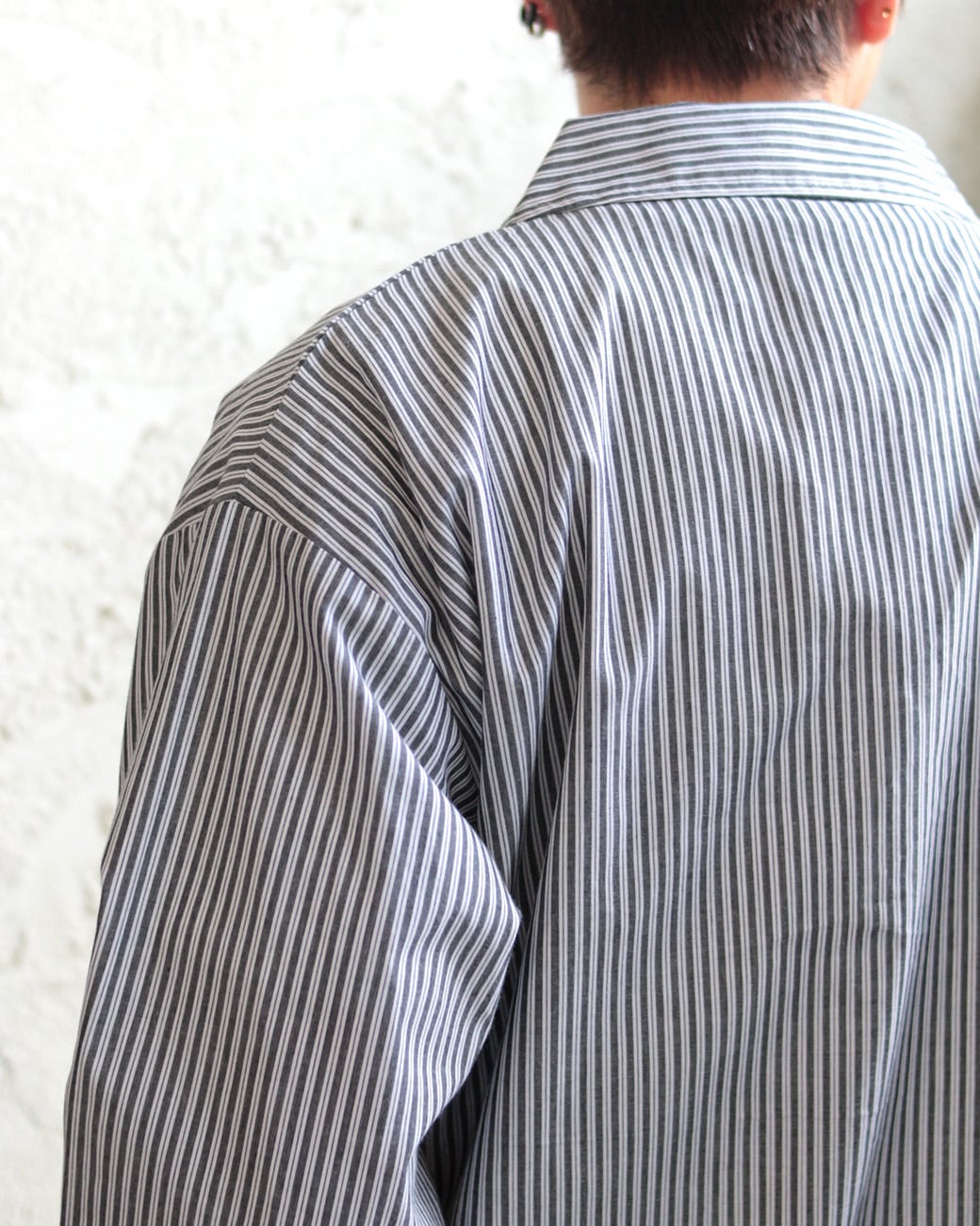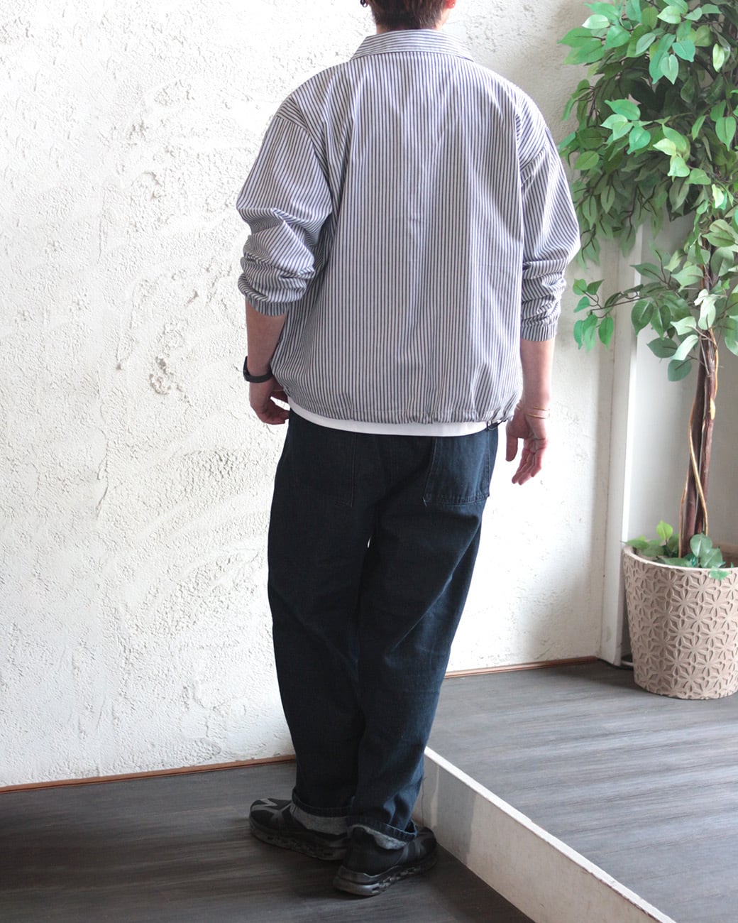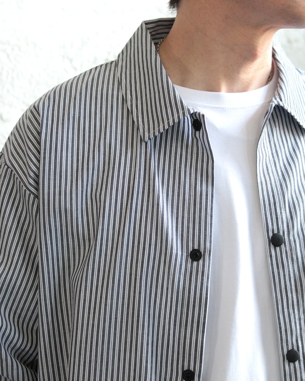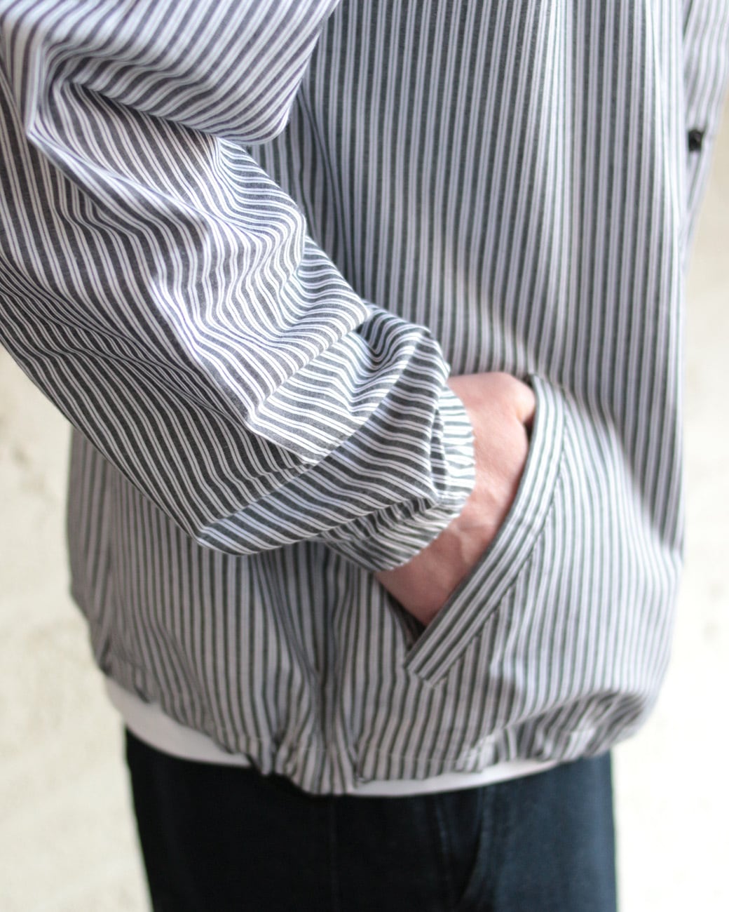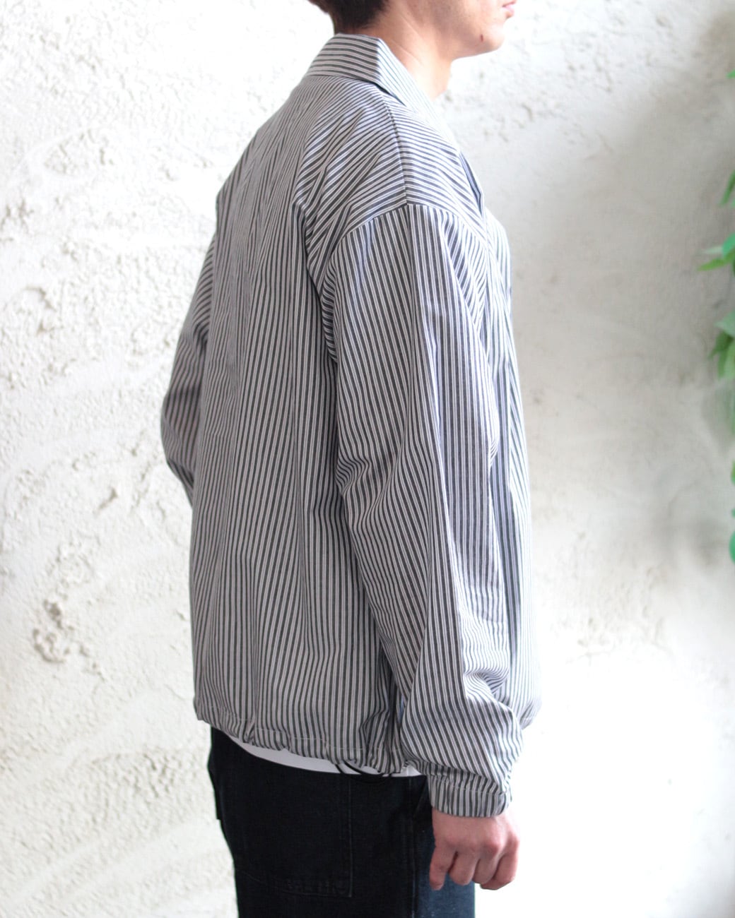 今回はストライプ柄を採用し、爽やかさを全面に表現。フロントはプランサー風のボタンを使用し、シャツらしさを出しつつ機能面も重視。裾にはシルエットを変えられるドロストを取り入れ、シャツ以上に多機能な1枚に仕上げました。