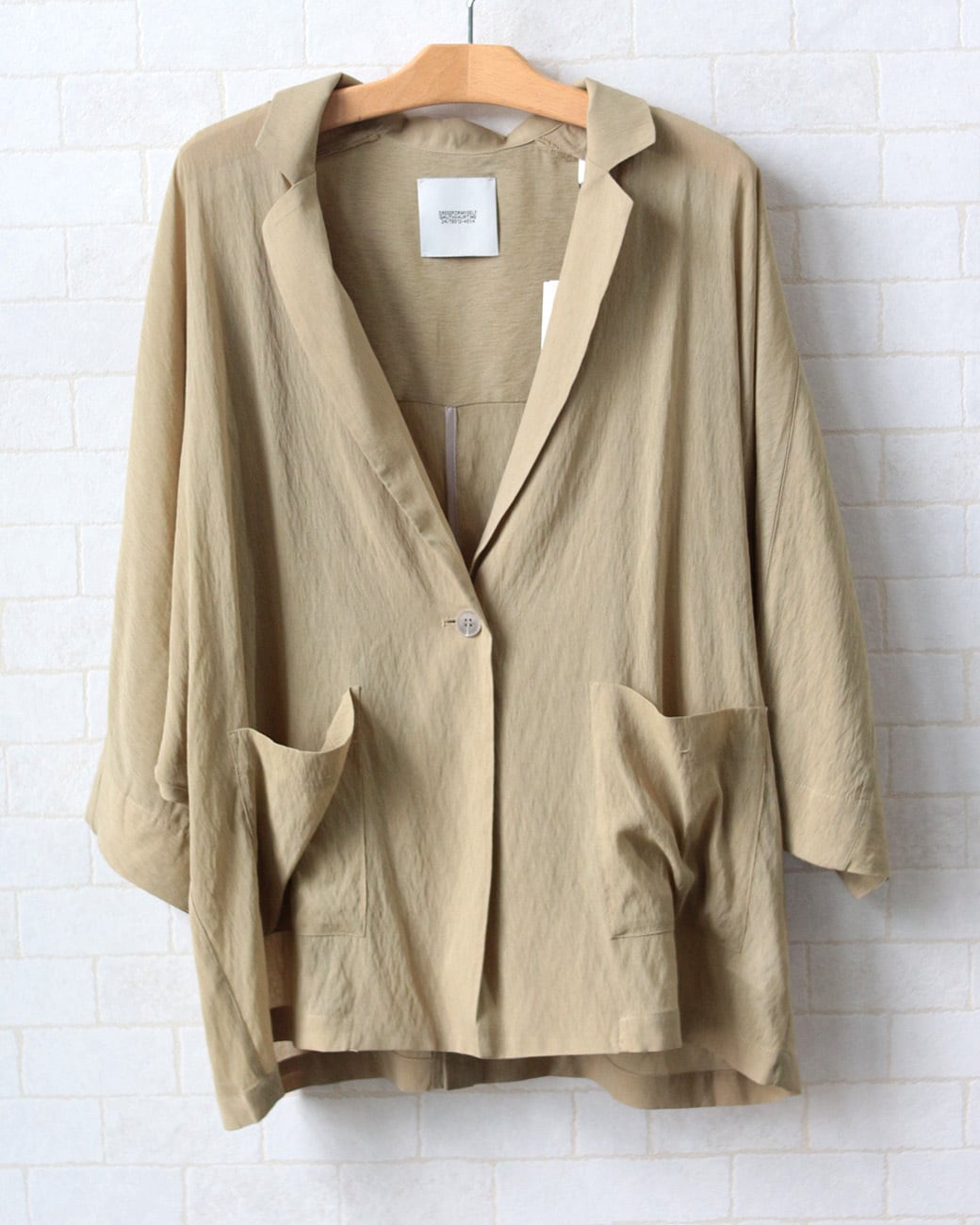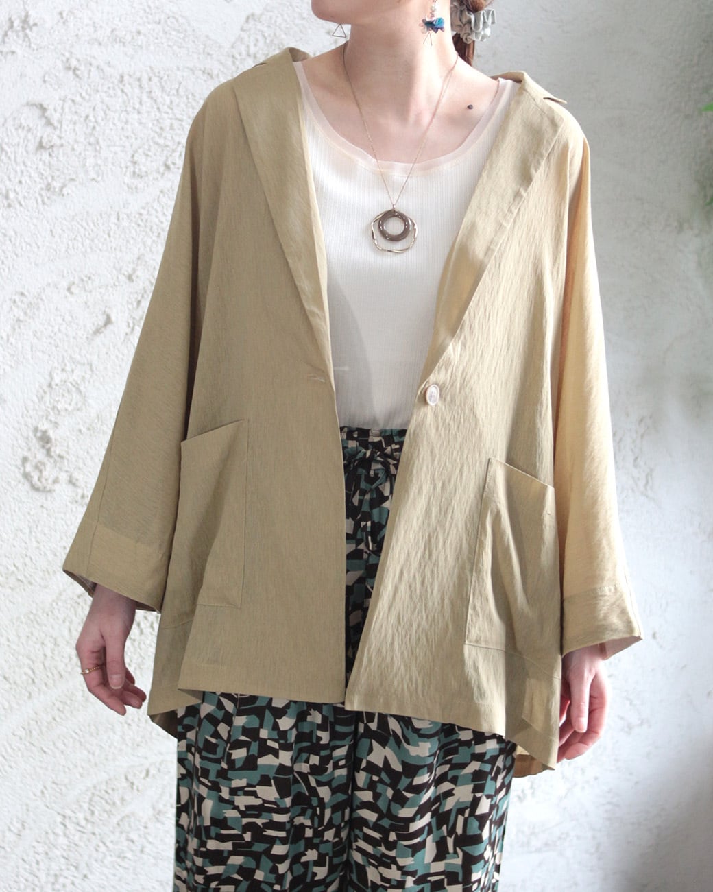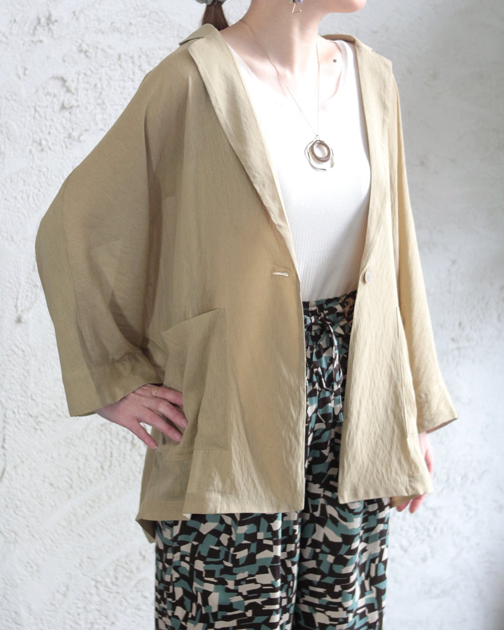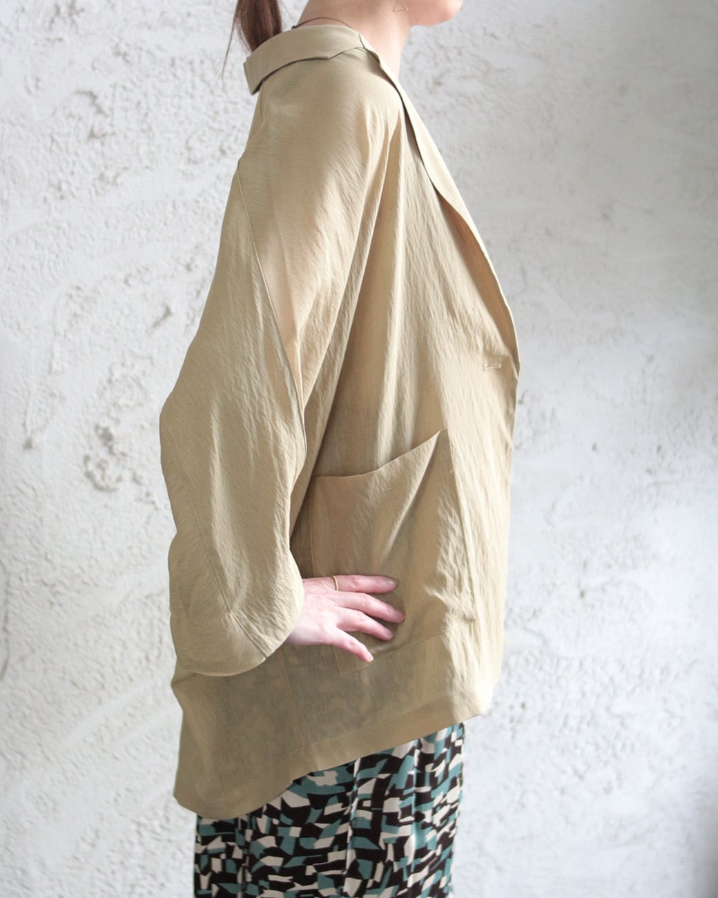 身体のラインを拾わない、ドルマンスリーブのジャケット。