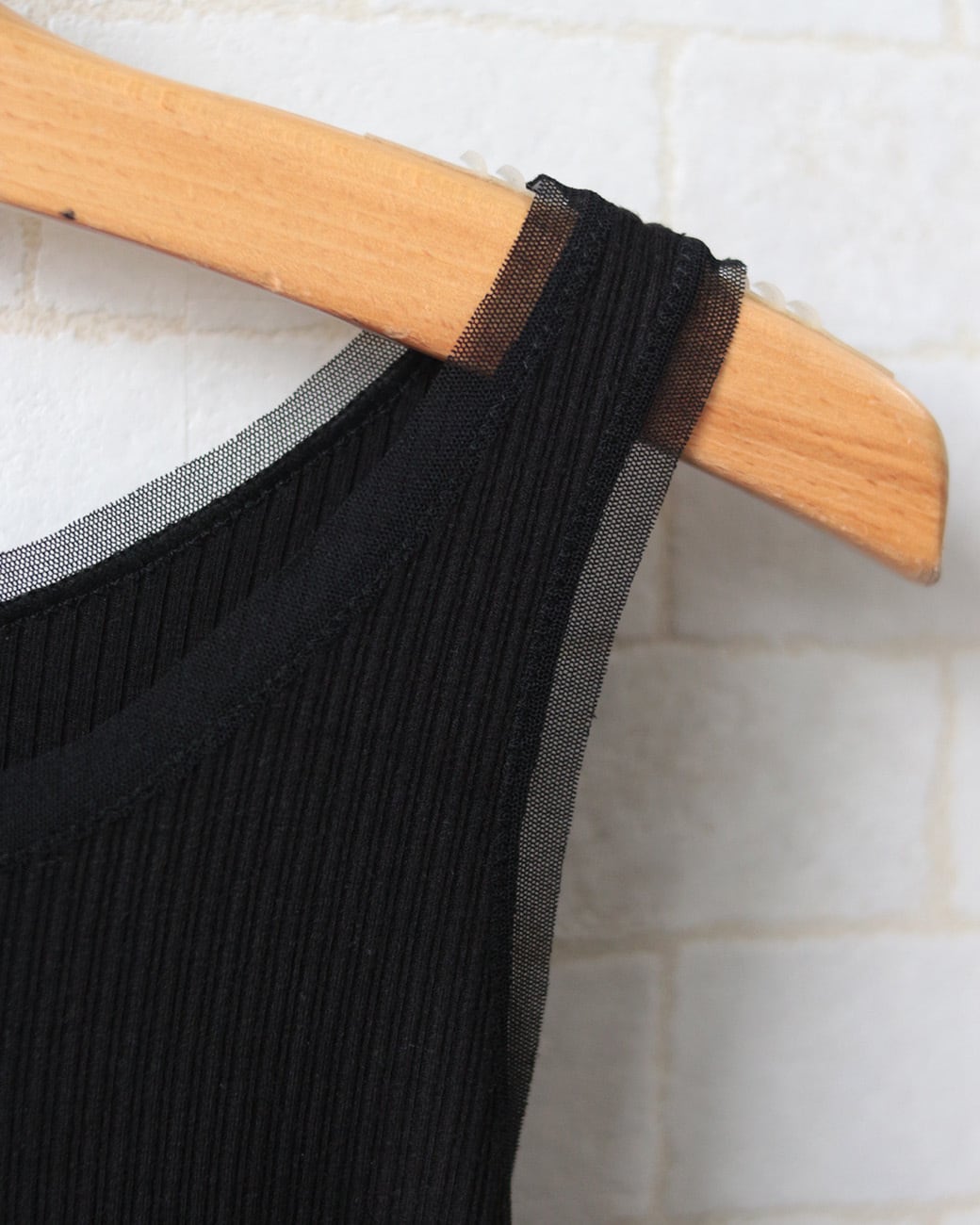 ネックとアームホール、裾にチュールをドッキングしたリブタンク。