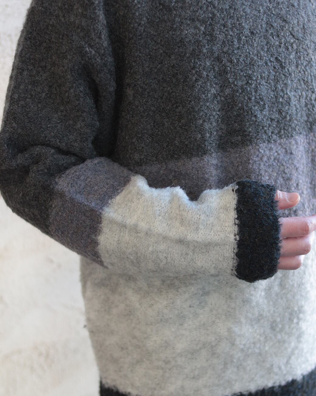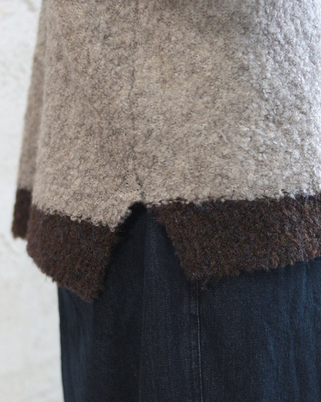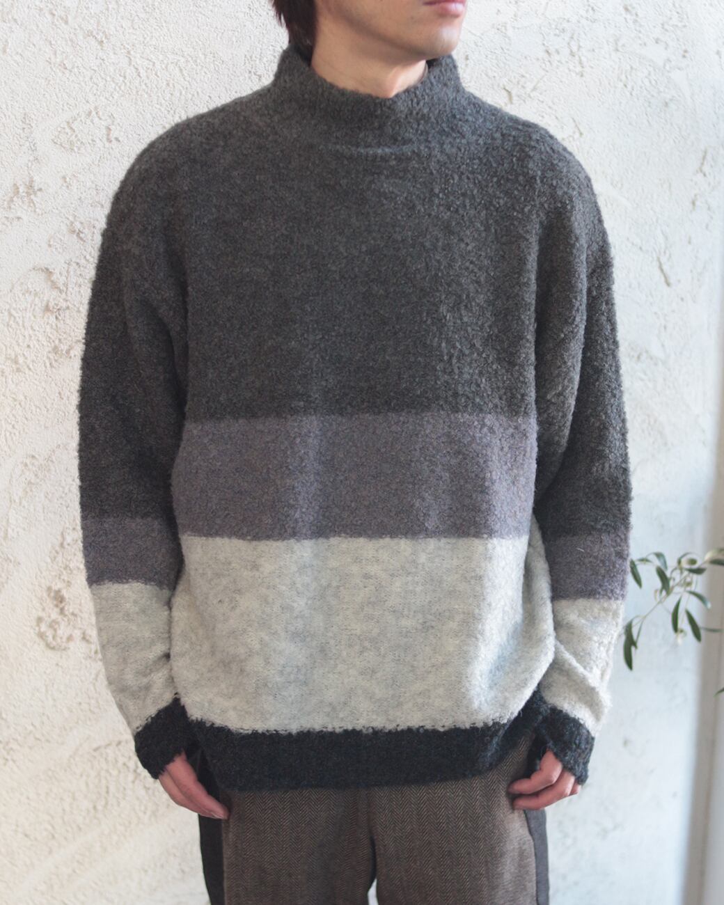 ブークレヤーンを使用しているので、フワっとした軽さのあるハイネックニット